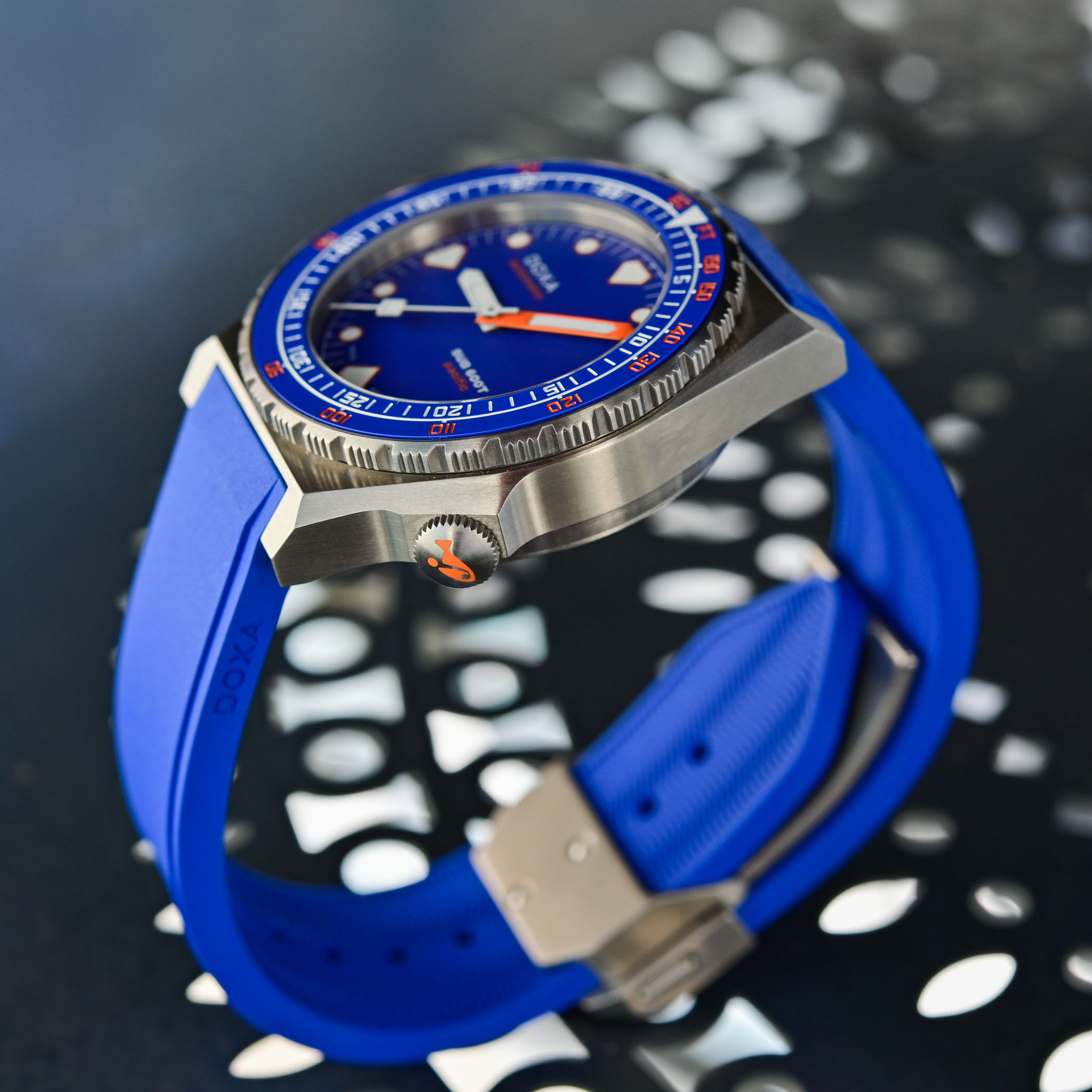 The dial is finished in a rich Pacific blue, which seems brighter in tone than the blue used in various Doxa collections. The hour markers are a mix of diamond shapes and roundels in white with an orange outline. Of course, these are coated with Super-LumiNova for better legibility in poor light conditions. The oversized orange minute hand is another Doxa trademark, which is matched with a steel hour hand and a seconds hand with a boxed tip, again all with luminous coating.