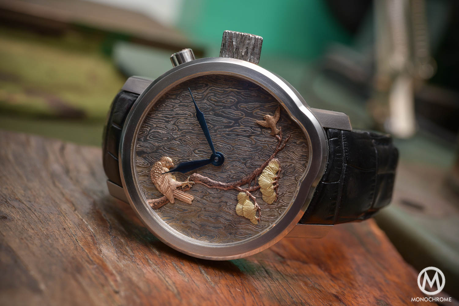 Finally, there is Mokume-gane, a ancient Japanese technique that Kees loves to use. It refers to a metalworking procedure which produces a mixed-metal laminate with distinctive layered patterns. Mokume-gane translates best to “wood grain metal”. Traditional components are relatively soft metallic elements and alloys which would form liquid phase diffusion bonds with one another without completely melting. Once a billet is achieved, pressure is applied on certain areas to create patterns – including this stunning and unique wood pattern (it is definitely made of metal and not wood). You can observe the thinness of the engravings done on the birds and leafs, and do consider that for the naked eye these dial elements seem to have a lot of depth. In reality the dial and every element on it, is less than 5mm thick. Go figure…