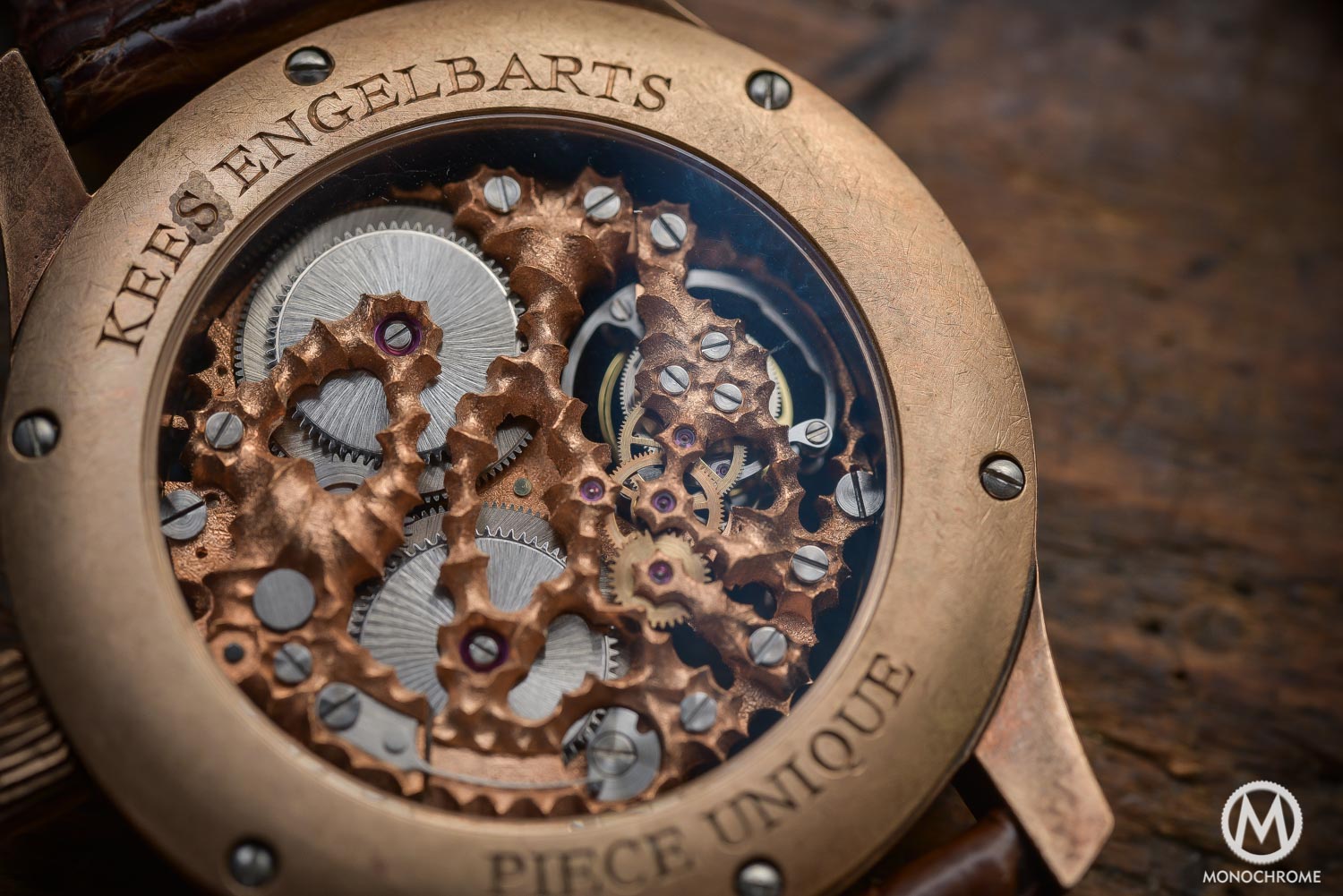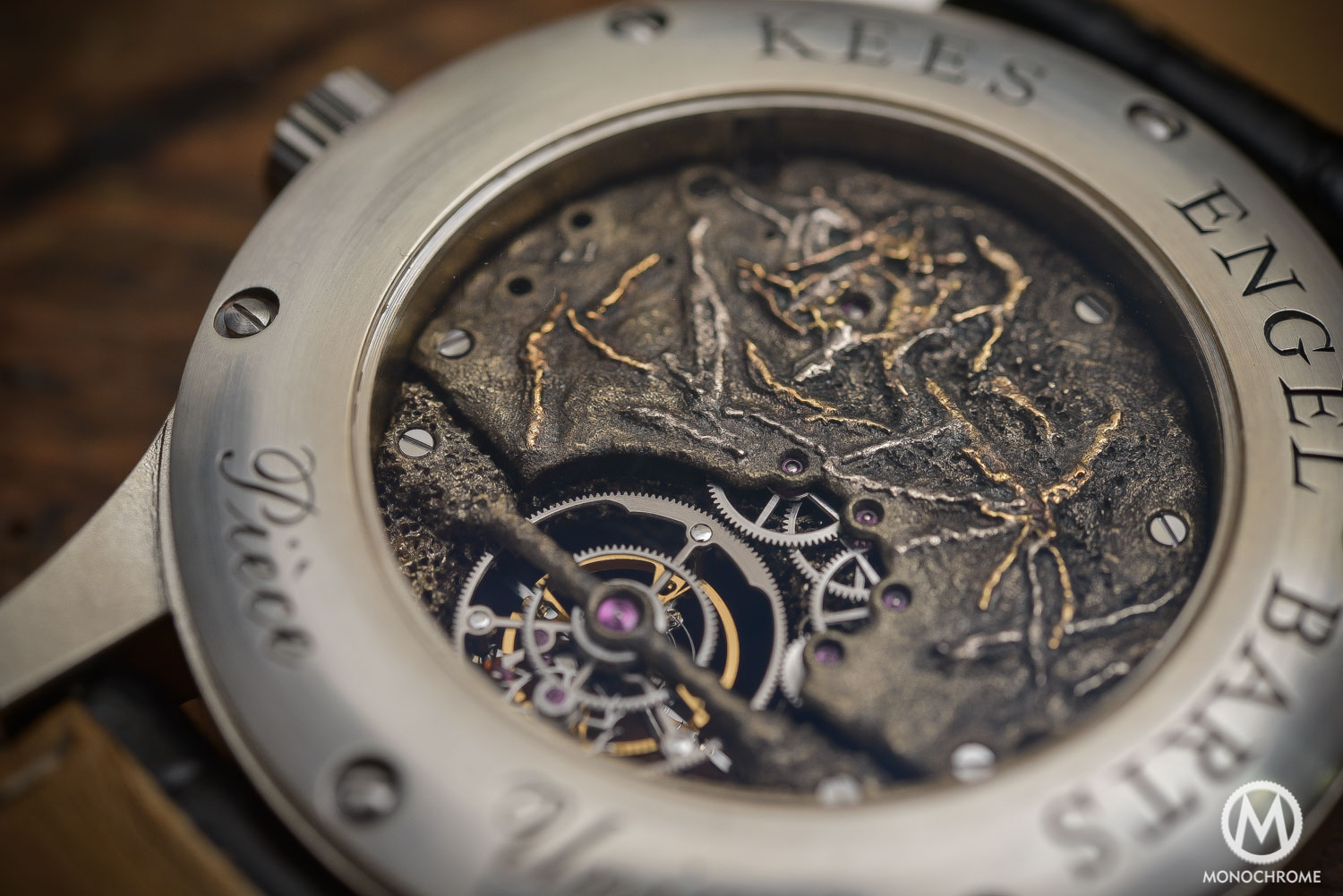 The second type of watches created by Kees feature (unusual) techniques from long-forgotten times. For instance, if you look at the watch below, you’ll see that it shows a texture that resemble vegetal mosses… How did Kees achieved this? Well, by experimenting, testing, trying new things, learning from faults and trying again. The main plate, visible from the front side of the watch, and that also serves as dial, has been achieved by literally bombarding the plate with a plasma cutter, to create holes and reliefs… Of course, this was not a smooth process and several attempts were required, but admit it, even if the final look is not to your taste, the texture achieved is simply unique and mesmerizing.