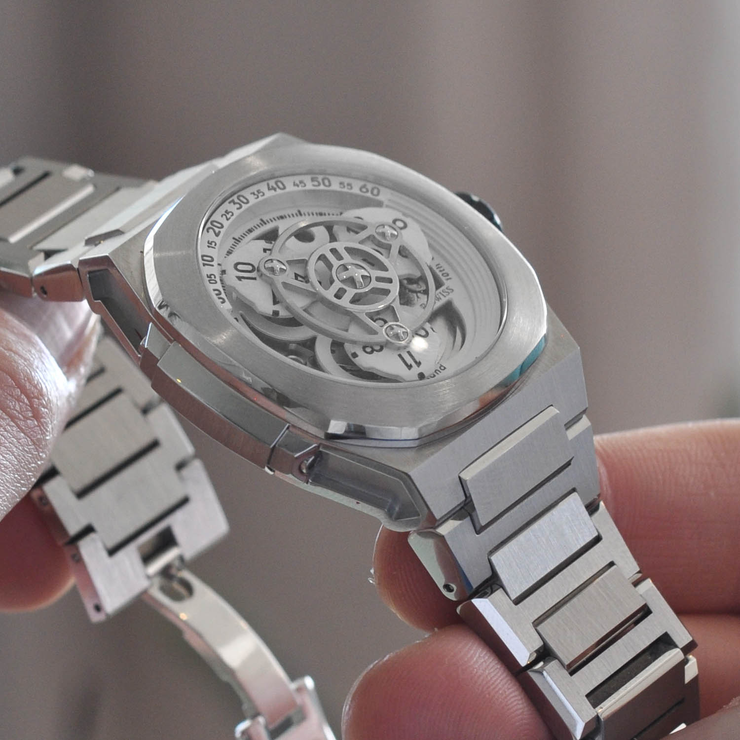 It all looks complicated, but it’s actually an easy time display to read. The current hour simply glides under the minute track, pointing to the current minute as it goes. Each disc has four numbers and rotates prior to reaching the start of the minute track to display the correct hour. The three discs are supported by an open-wheel structure and it kind of resembles a carnival ride.
