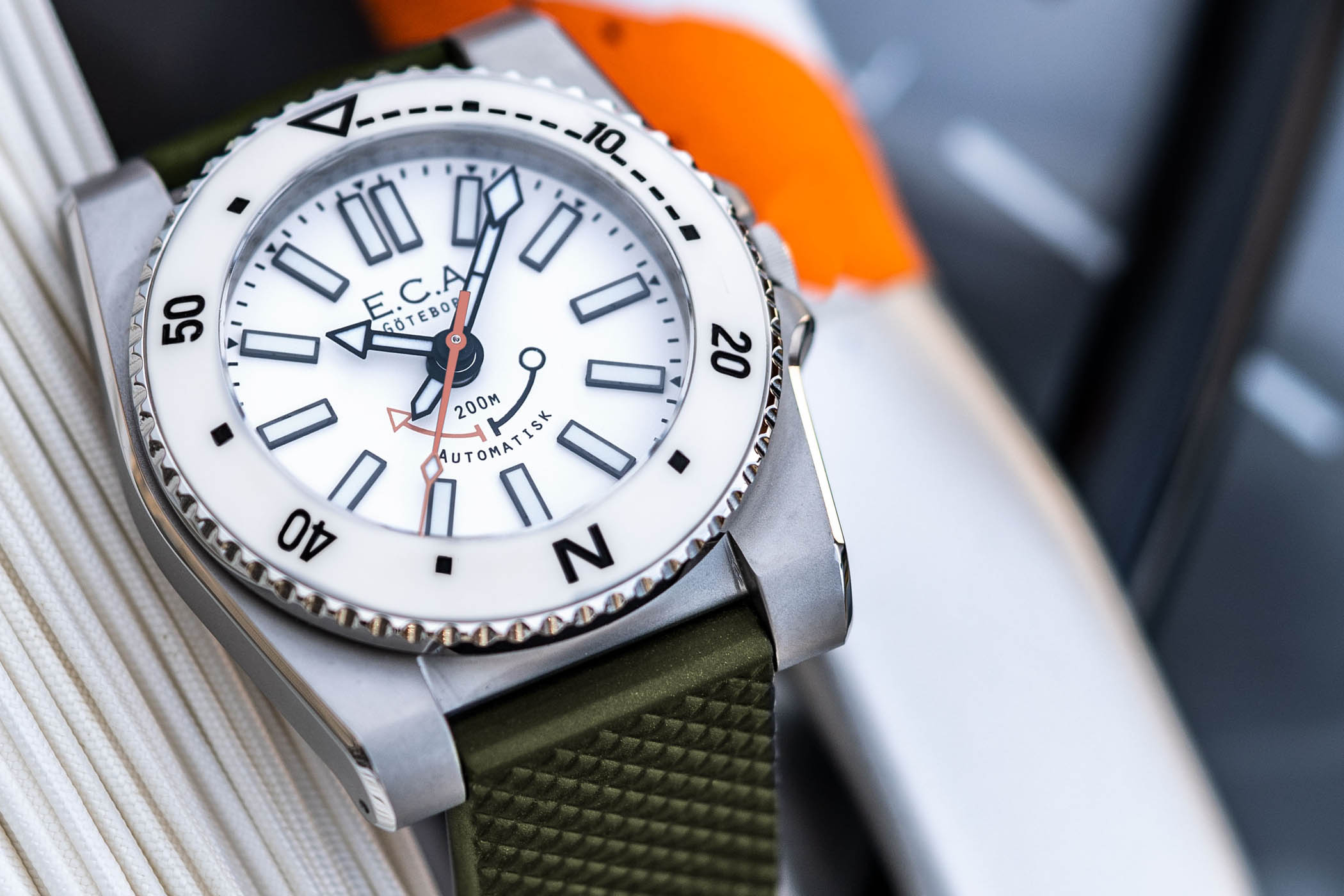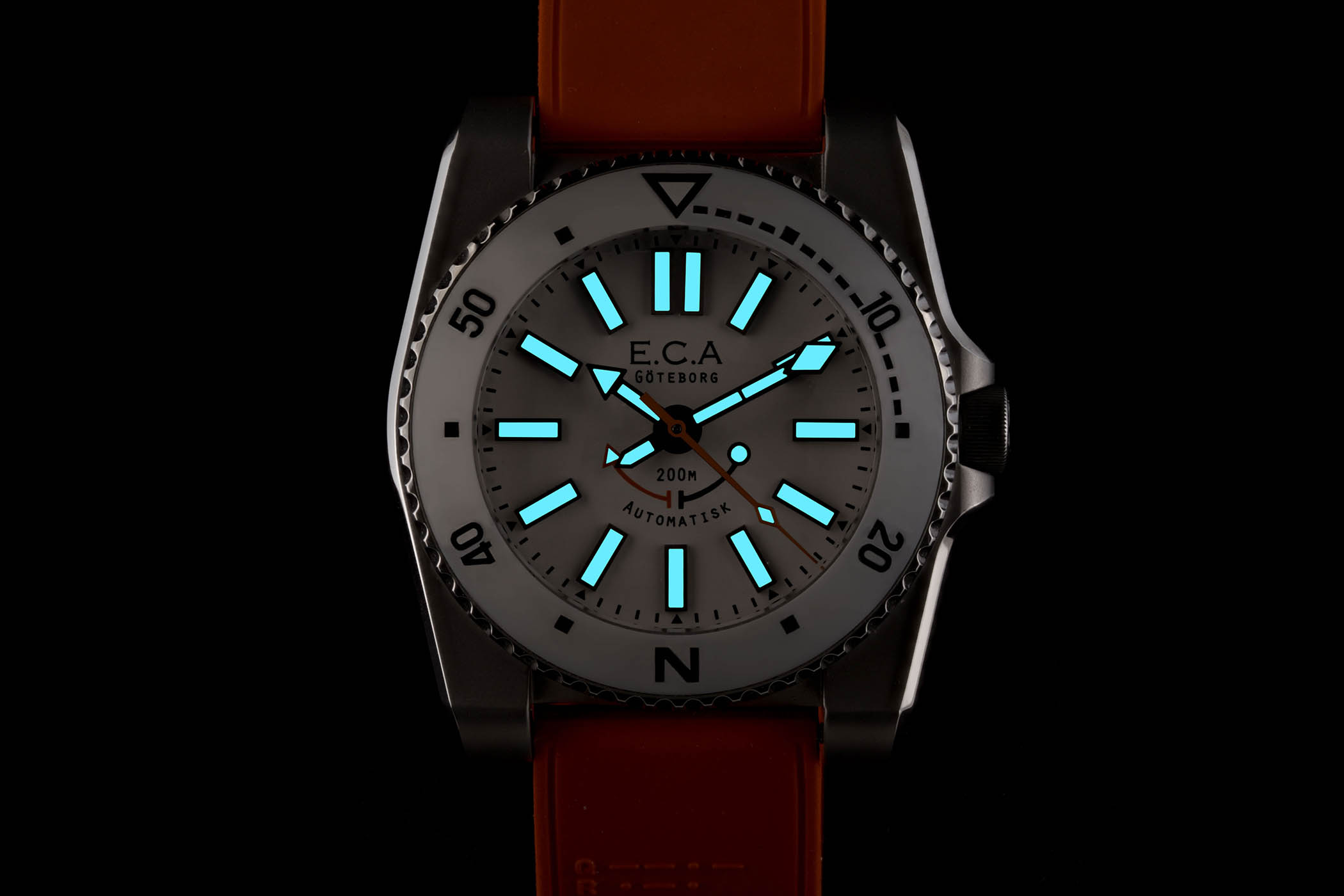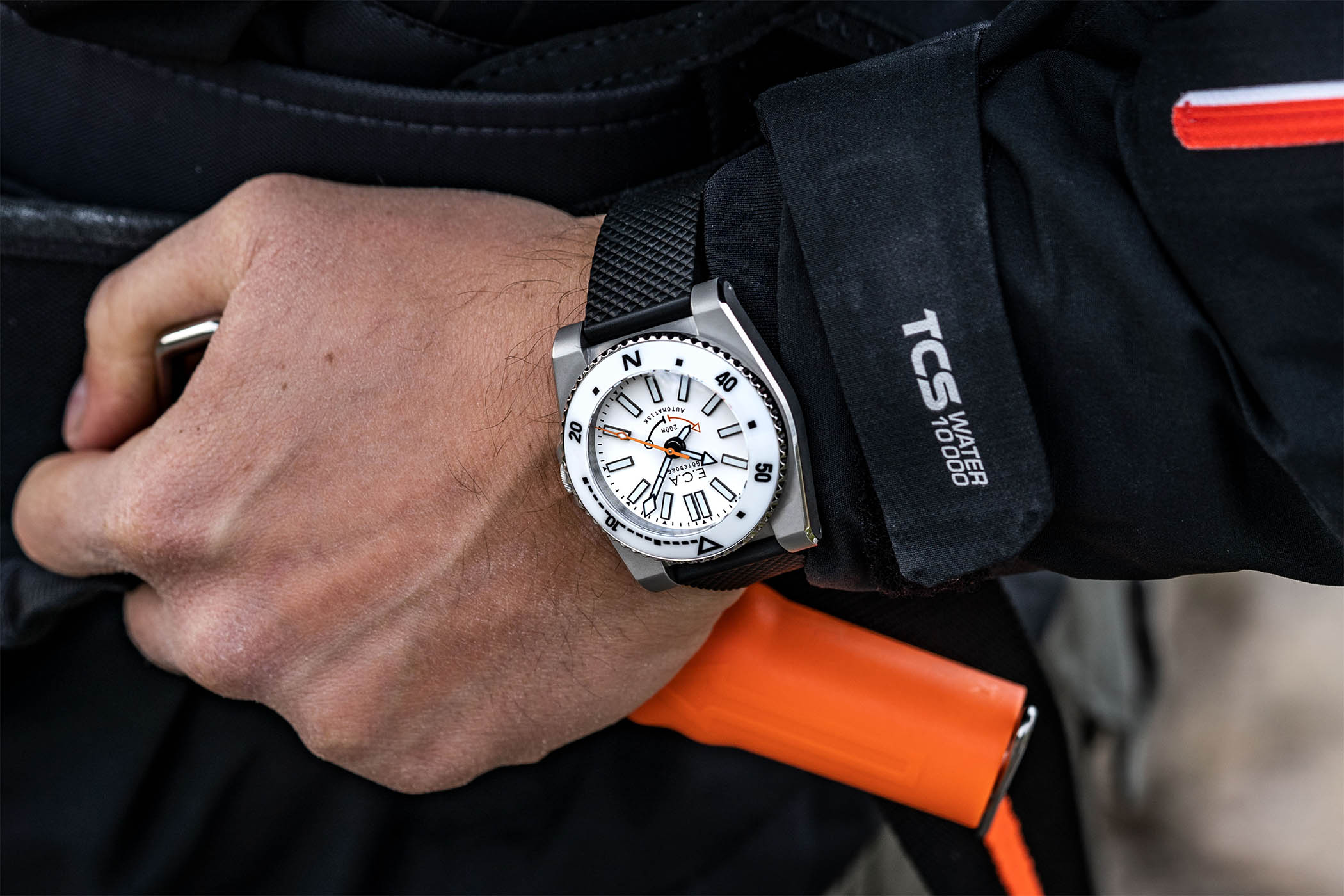 The dial of this E.C.Andersson Denise Arctic Sport is frosted white with white luminescent indices framed in black. The black “Bohuslän” style hands are filled with white luminescence as well (an arrowhead hour hand and diamond-pointing minute hand). Along with the change from black to white, the dial also features a modified power-reserve indicator above 6 o’clock. It’s a simpler, thinner arch with a lume-filled circle and triangle marking empty and full respectively. A short, matching third hand sweeps across it from the central position. A contrasting orange seconds hand is easily visible on glary, snowy days.