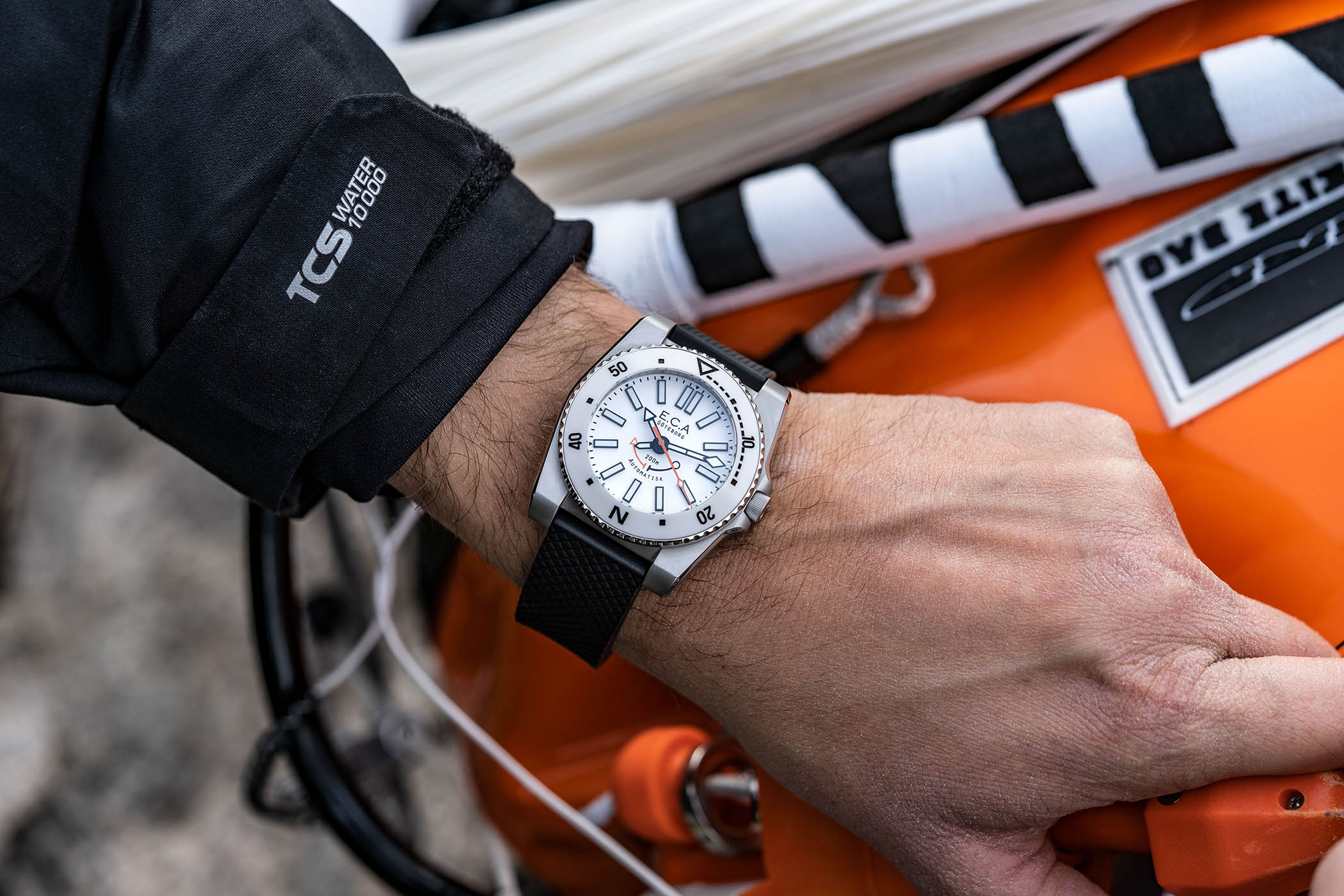 The 20mm strap is a textured Italian rubber with an extension buckle and an extra-long orange strap is included for use over a heavy jacket or drysuit. A new stainless steel Jubilee bracelet is now offered with sandblasted side-links and polished mid-links, and a micro-adjustable deployment clasp. The bracelets are made largely in-house and by hand, resulting in limited availability (no photo available yet).