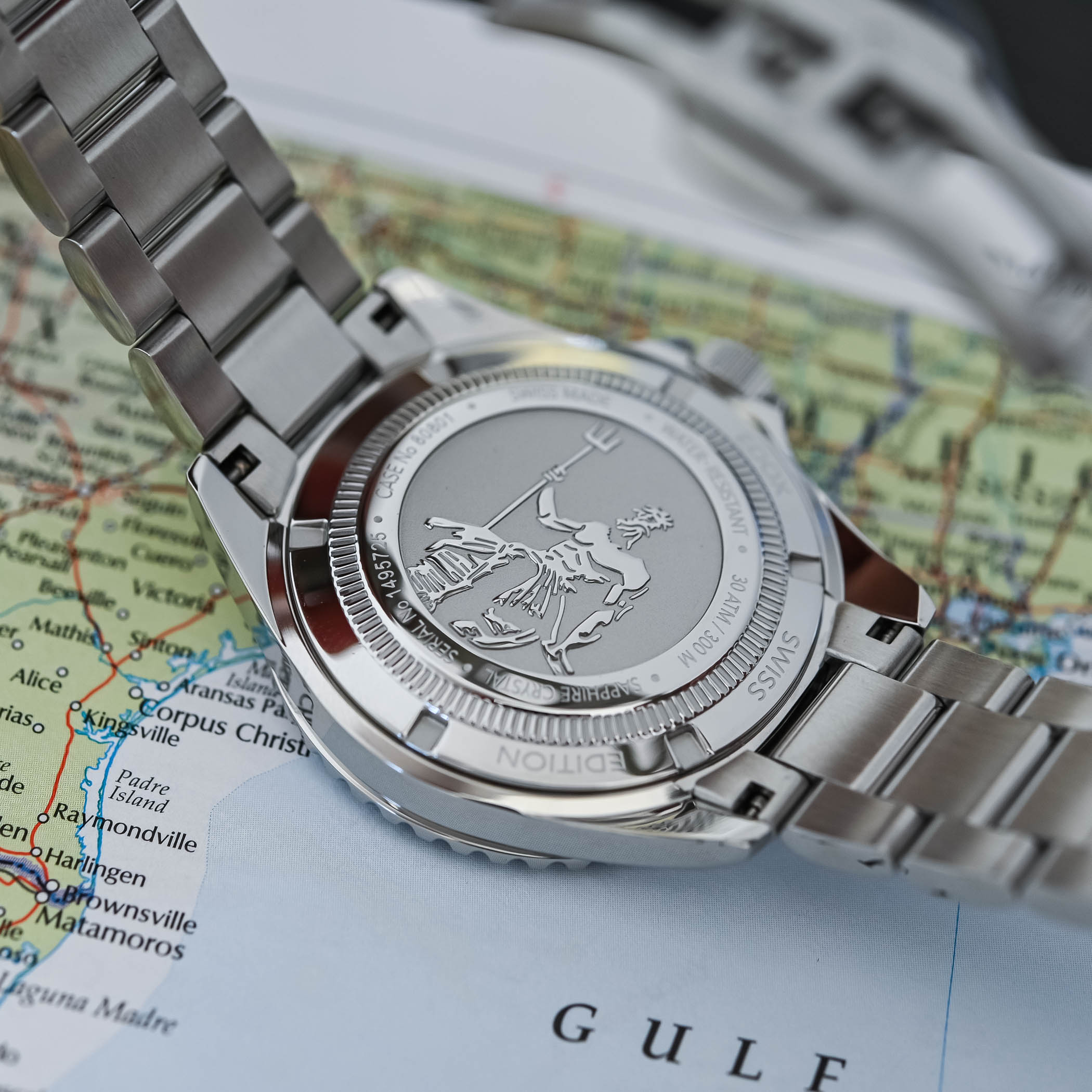 Until recently, The Neptunian collection consisted solely of various iterations of the Automatic model, which the introduction of the new Grande Réserve Date Automatic in stainless steel has now bolstered. These new timepieces come in a 42mm diameter, 12.30mm high case equipped with a unidirectional 60-click rotating bezel featuring a ceramic insert. The 3mm thick sapphire crystal tops the dial, and the overall case construction, including the screw-down crown with a double O’ring system and the solid screw-down stainless steel caseback, ensures the watch is water-resistant up to 300 meters. The caseback is adorned with a Neptune image and relays pertinent information about the watch’s qualities and case number.