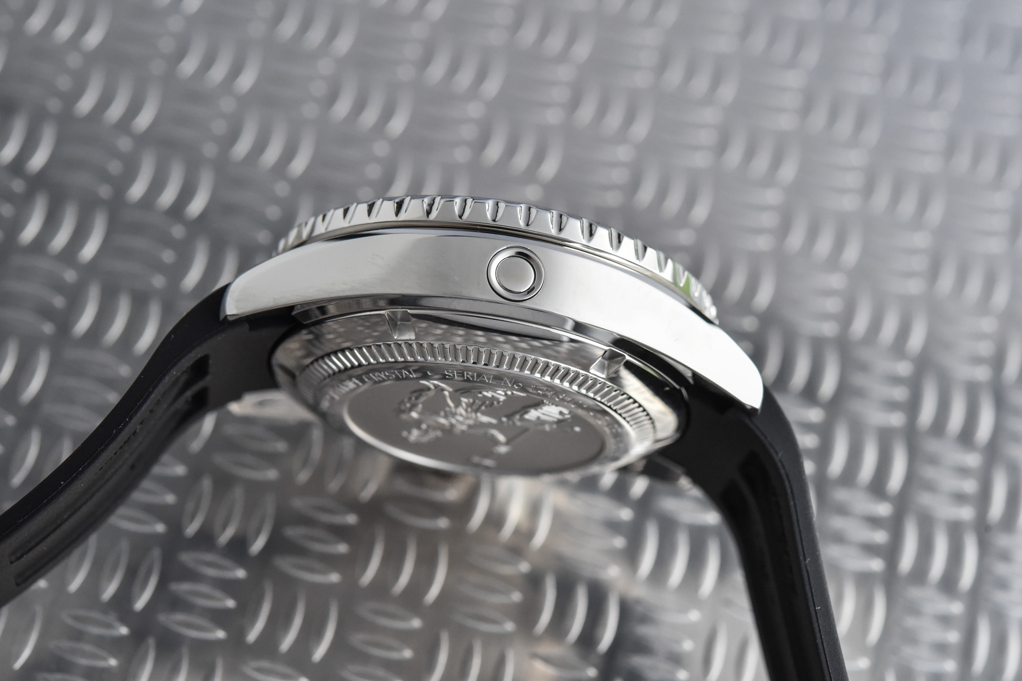 The Edox SkyDiver Neptunian is based on a model from 1973 and comes with a contemporary stainless steel case at 44mm in diameter and 15.6mm in height. It stays true to its classic styling while bringing many things up to date. For starters, there’s a requisite helium escape valve at 9 o’clock and the sapphire crystal is a full 3mm thick to withstand the pressure of saturation diving. Very few will actually descend to 1,000 metres, but it’s always cool knowing you can (well, the watch anyway). The screw-down crown is protected by integrated guards with an improved seal over classic models, while strap options include black rubber or a matching 3-link stainless steel bracelet with a deployant clasp. The solid case back has a detailed engraving of Neptune, the Roman God of the Sea, hence the name.