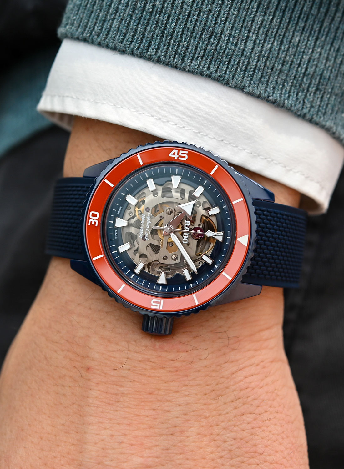Rado is synonymous with high-tech ceramic, which is used to great effect on its sleek, geometric designs and vintage models alike. Rado’s 1962 Captain Cook dive watch, resurrected in 2017, was given a high-tech plasma ceramic makeover in 2021. Not only did it feature a ceramic case and bracelet, but its dial was also skeletonised to reveal the movement. In this same vein, Rado releases a duet of Captain Cook High-Tech Ceramic Skeleton models with vibrant coloured bezels for some fun in the sun.