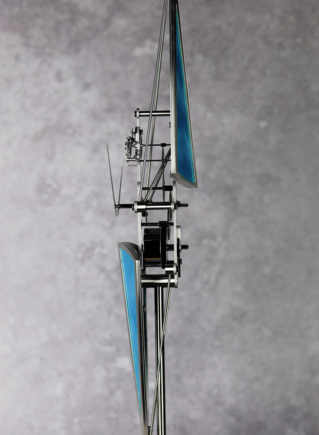 Designed as a vertical table clock, its slender form is inspired by the profile of a racing skiff. The minimalist architecture hides an in-house eight-day movement, whose vertical gear train mirrors the symmetry and balance of a rower’s motion. The escapement and barrel are aligned at opposite ends for a visual balance.