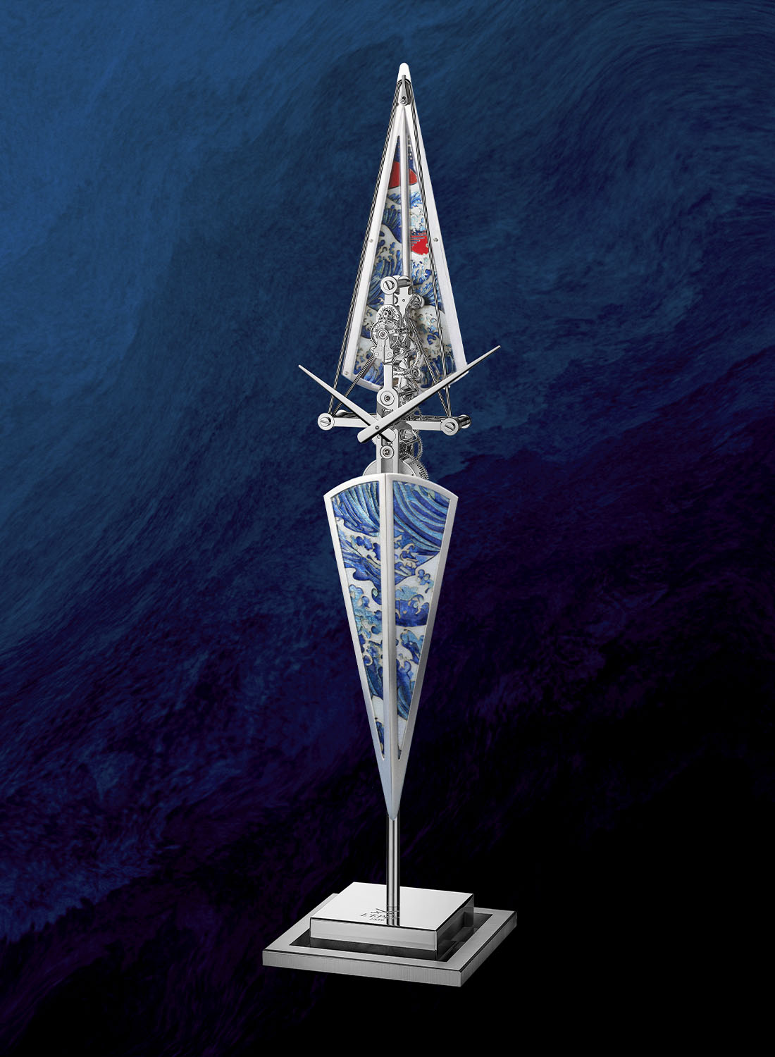 La Regatta’s enamelled hull is hand-decorated by the Georgian atelier David Kakabadze Enamel, internationally renowned for its mastery of the Grand Feu technique. Each piece is a one-of-one artwork, showcasing different enamelling methods, from cloisonné with gold wires to paillons with silver leaf, flinqué over guilloché metal, or plique-à-jour, which evokes stained glass suspended in light.
