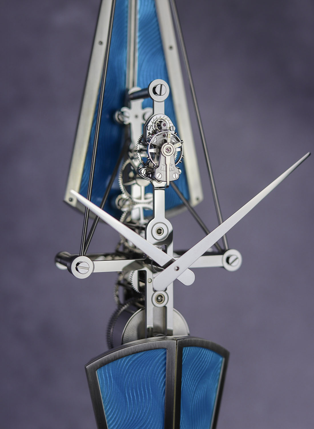 Designed as a vertical table clock, its slender form is inspired by the profile of a racing skiff. The minimalist architecture hides an in-house eight-day movement, whose vertical gear train mirrors the symmetry and balance of a rower’s motion. The escapement and barrel are aligned at opposite ends for a visual balance.