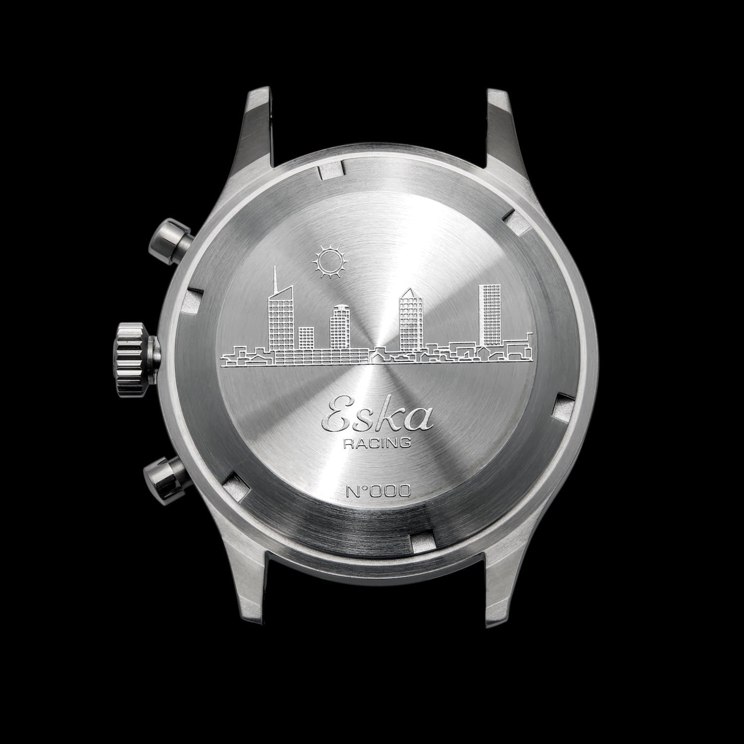 The Eska Racing Chronograph is housed in a 316L stainless steel case, measuring 41mm in diameter and 12.8mm thick (14.9mm including the sapphire crystal on top). The screwed caseback is engraved with an image of Lyon’s skyline, a nod to Eska’s new home and the city’s long watchmaking tradition. The case design, the chronograph pushers, and the fluted crown present a familiar image that is thus reassuring. Water-resistance is 50m.
