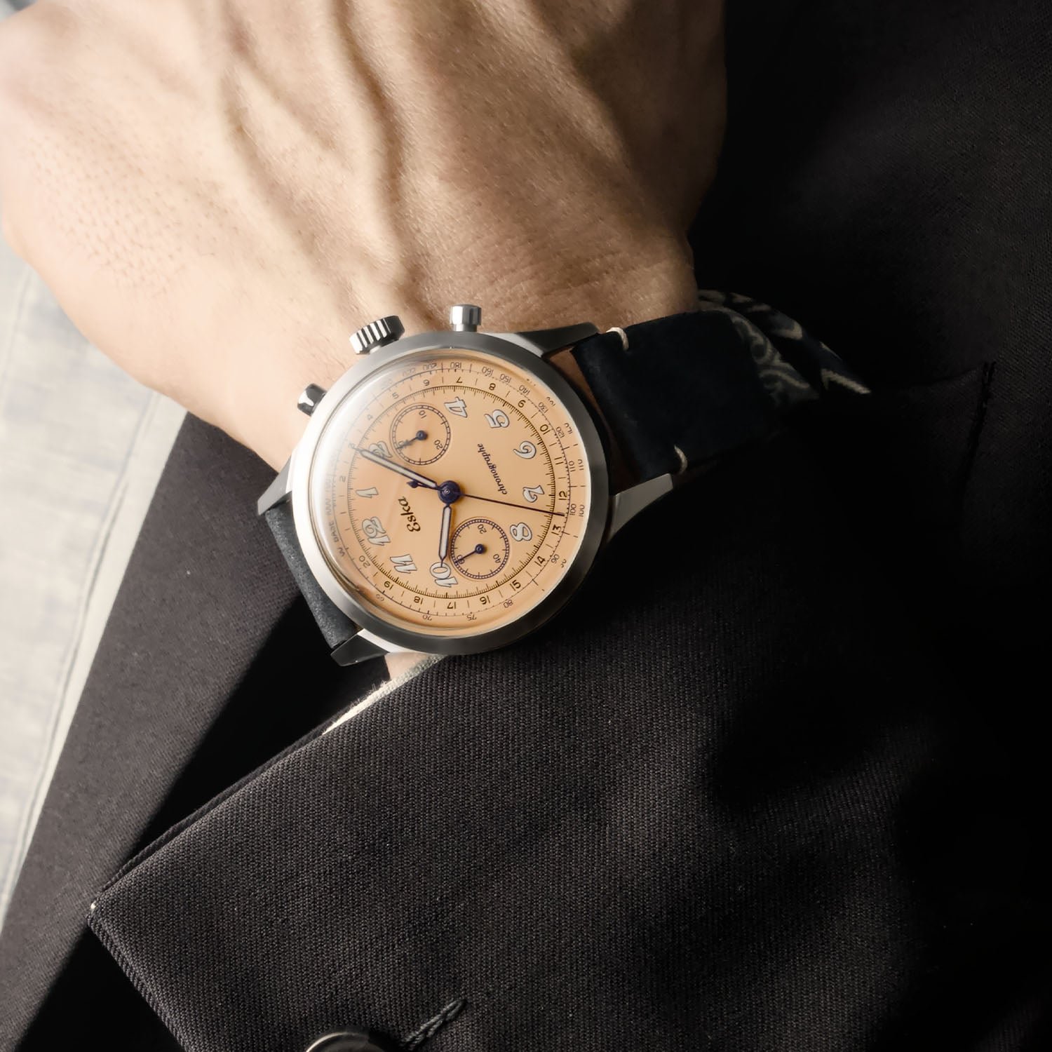 The new model offers a bi-compax layout and comes in two versions: the Racing Azur, with a vertically brushed blue dial accented by white tracks and a red central chronograph hand; and the Racing Sunset, pairing a matte salmon dial with blue minute tracks, white indices, and a contrasting blue chronograph hand. The Sunset features italic numerals for a vintage look, the Azur opts for baton indices and large numerals at 12 and 6 only: two designs with distinct personalities but the same retro spirit. On both, the 30-minute chronograph counter is positioned at 3 o’clock, balanced by the small seconds at 9.