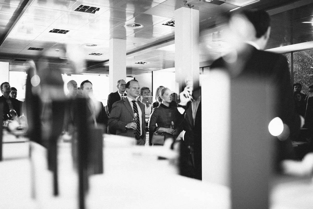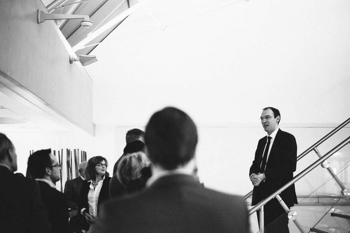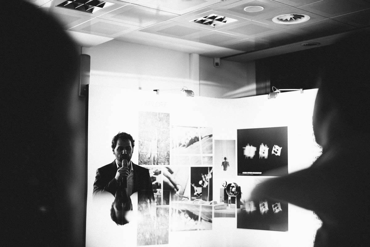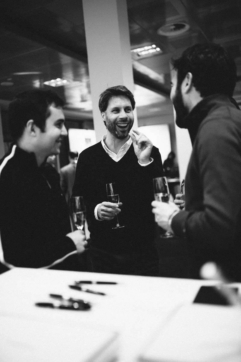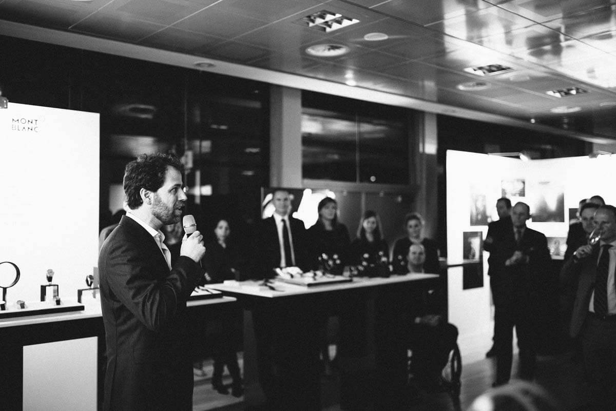 The location of the event was just superb. Of course Montblanc could have organized it in one of Amsterdam’s beautiful hotels, however they choose for the superb event room, at the top floor of the Richemont offices. This huge room offers space for the 50+ people that gathered that evening, and (in day light) offers a great view over the city centre. Everything is made of steel and glass, and even the stairs to enter the room are made in glass. The photo below shows Montblanc’s Managing Director for BeNeLux and Germany, Oliver Goessler, inviting the guests to the event room.