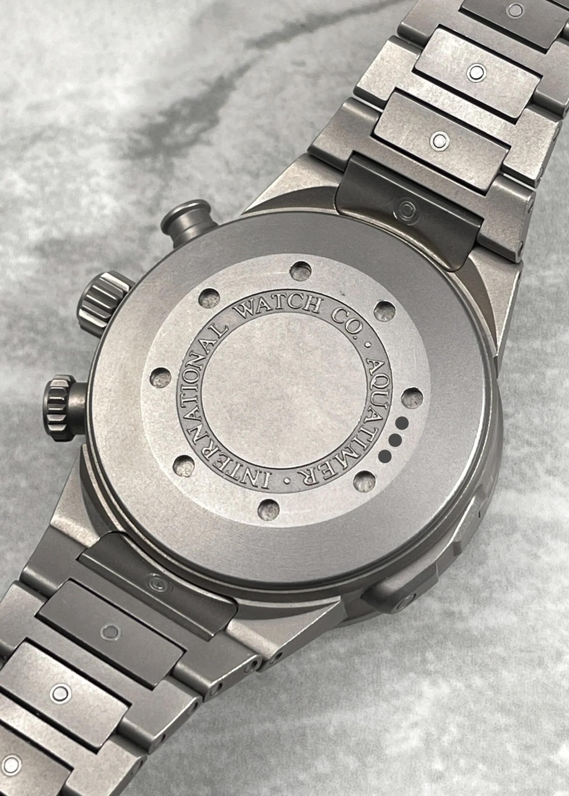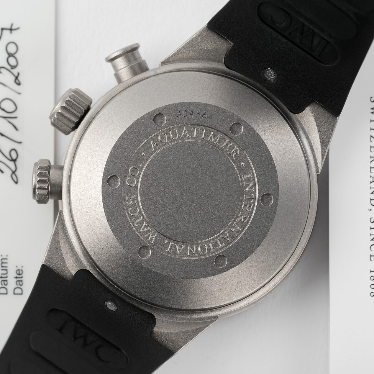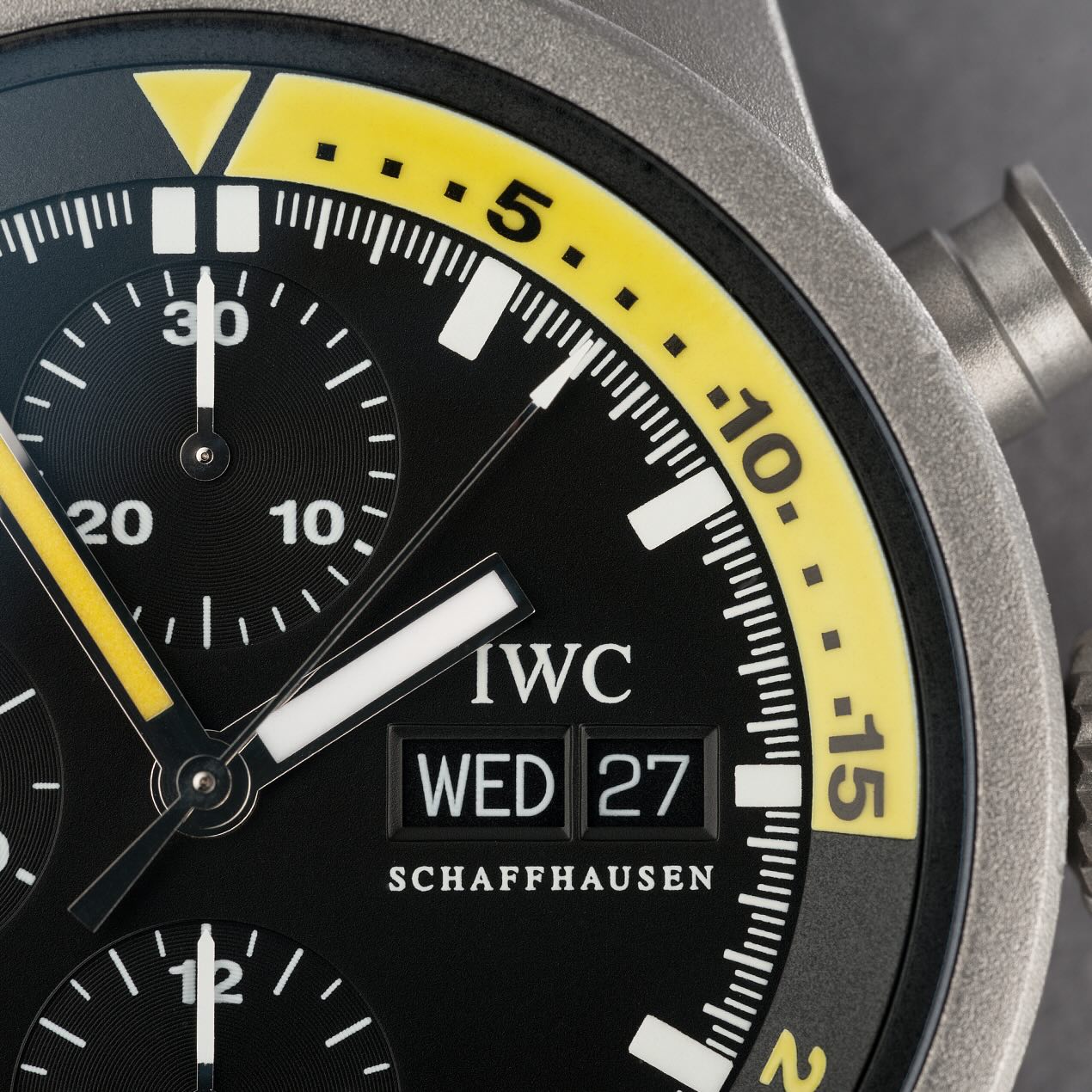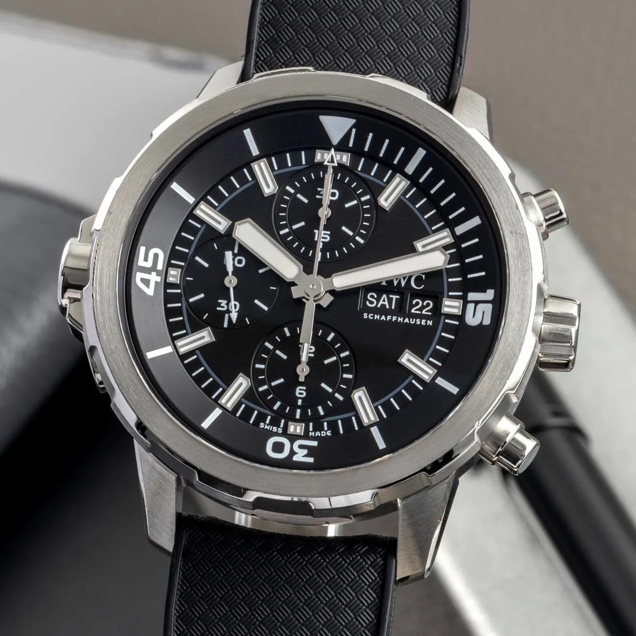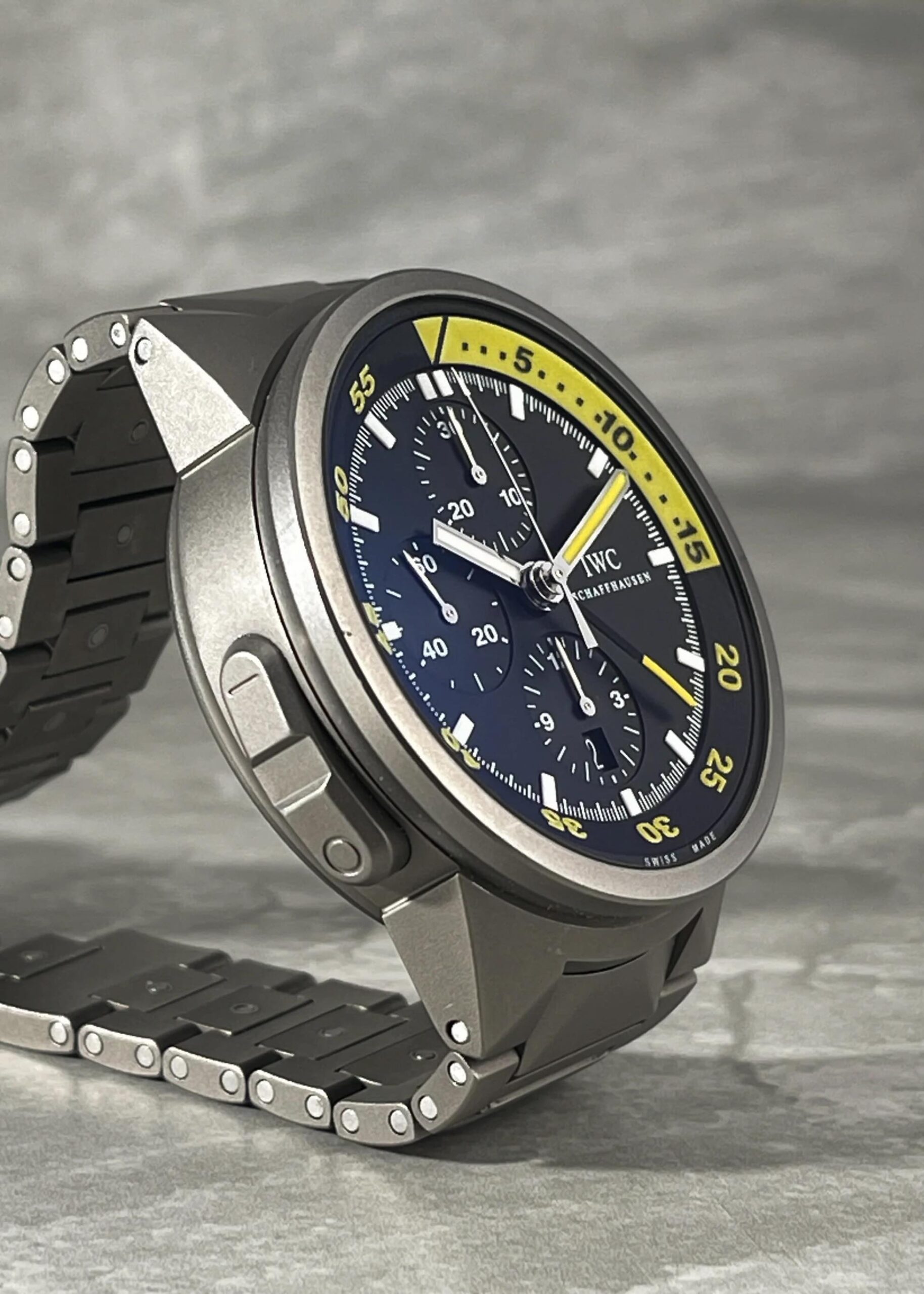 The black dial was designed for underwater legibility, with bold Super-LumiNova-coated hands and markers, and a prominent split-minute hand for instant recognition of intermediate times. The watch was paired with a titanium bracelet for durability and hypoallergenic comfort. By combining a patented diving-specific rattrapante with robust case engineering, the Aquatimer Split Minute Chronograph delivered a professional-grade utility, cementing IWC’s reputation for innovation in the Aquatimer line.