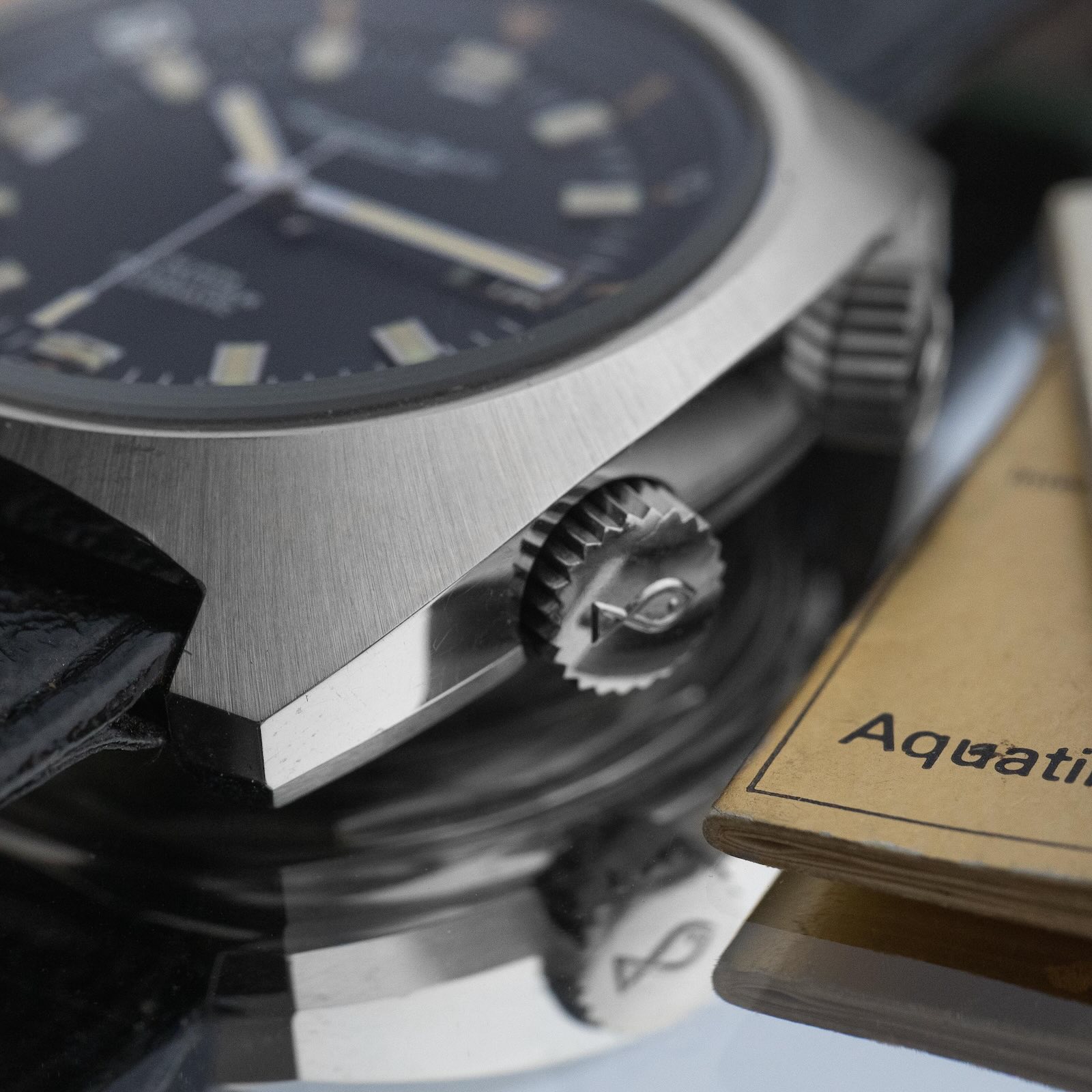 The Ref. 812 was built with the EPSA Super-Compressor case, a patented system by Ervin Piquerez S.A. in which increased water pressure strengthened the case’s seal the deeper it went. Measuring 37mm in diameter, with a modest profile and sharply defined lugs, it offered 200m of water resistance. Its most recognisable feature, the twin screw-down crowns with the newly developed spring system seals, at 2 and 4 o’clock, served two separate functions: the lower one rotated the internal dive bezel, protected under the crystal, while the other handled winding, setting, and date adjustment. This protected bezel system reduced the risk of accidental knocks during a dive and gave the watch its clean, functional look.