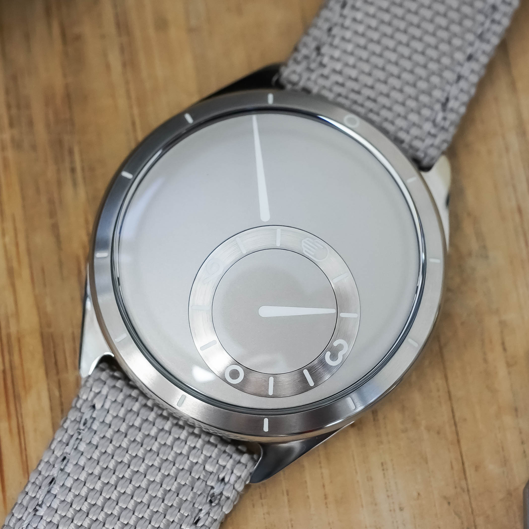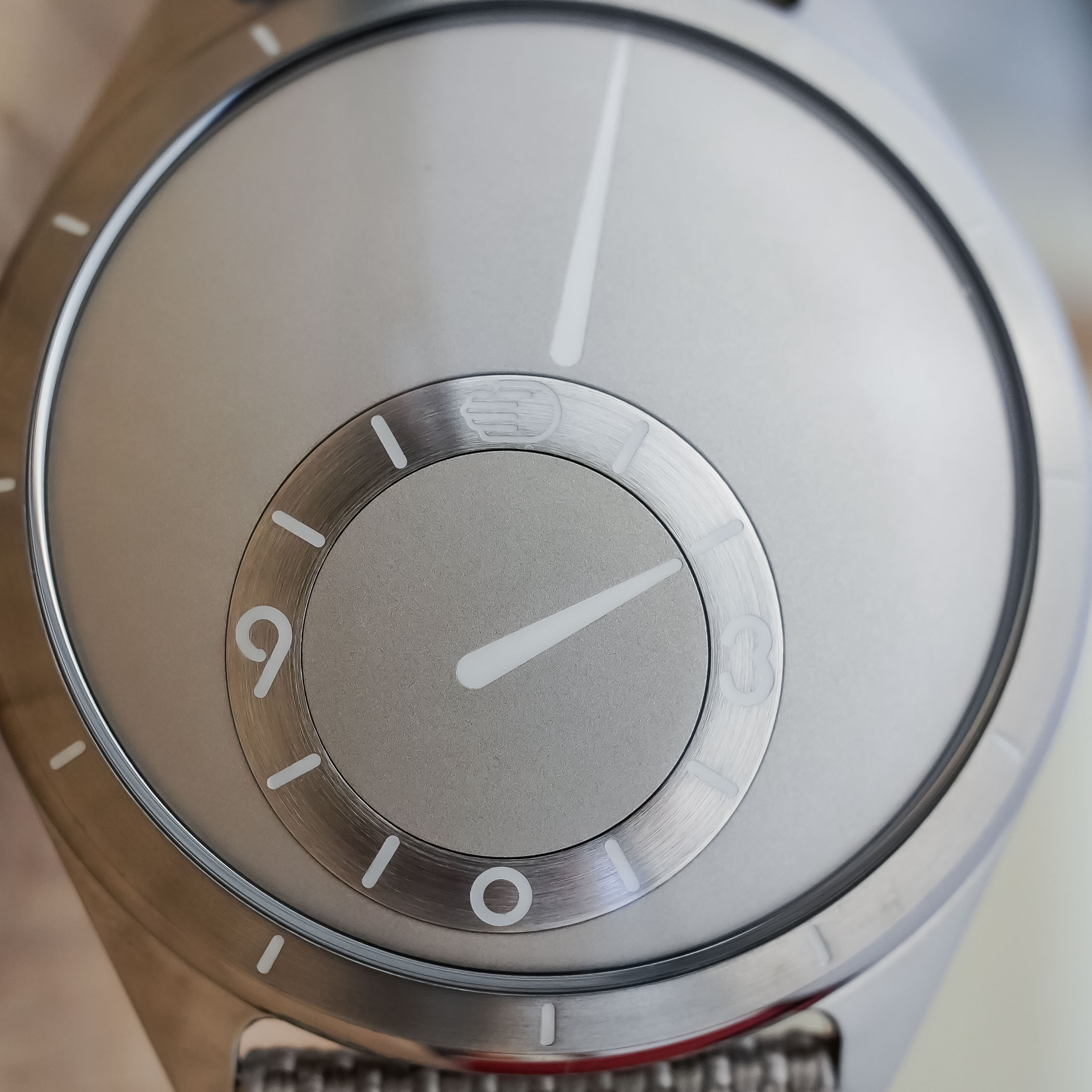 Made from grade 5 titanium, the fixed, circular-brushed external bezel has engraved markings at 5-minute intervals and, like a regulator, is indicated by the long central hand. The domed matte grey surface of the dial (75mm radius) rotates once an hour to align the printed minutes hand with the bezel, while the smaller sub-dial for the hours rotates once every 12 hours, following the minutes around the dial in a never-ending dance.