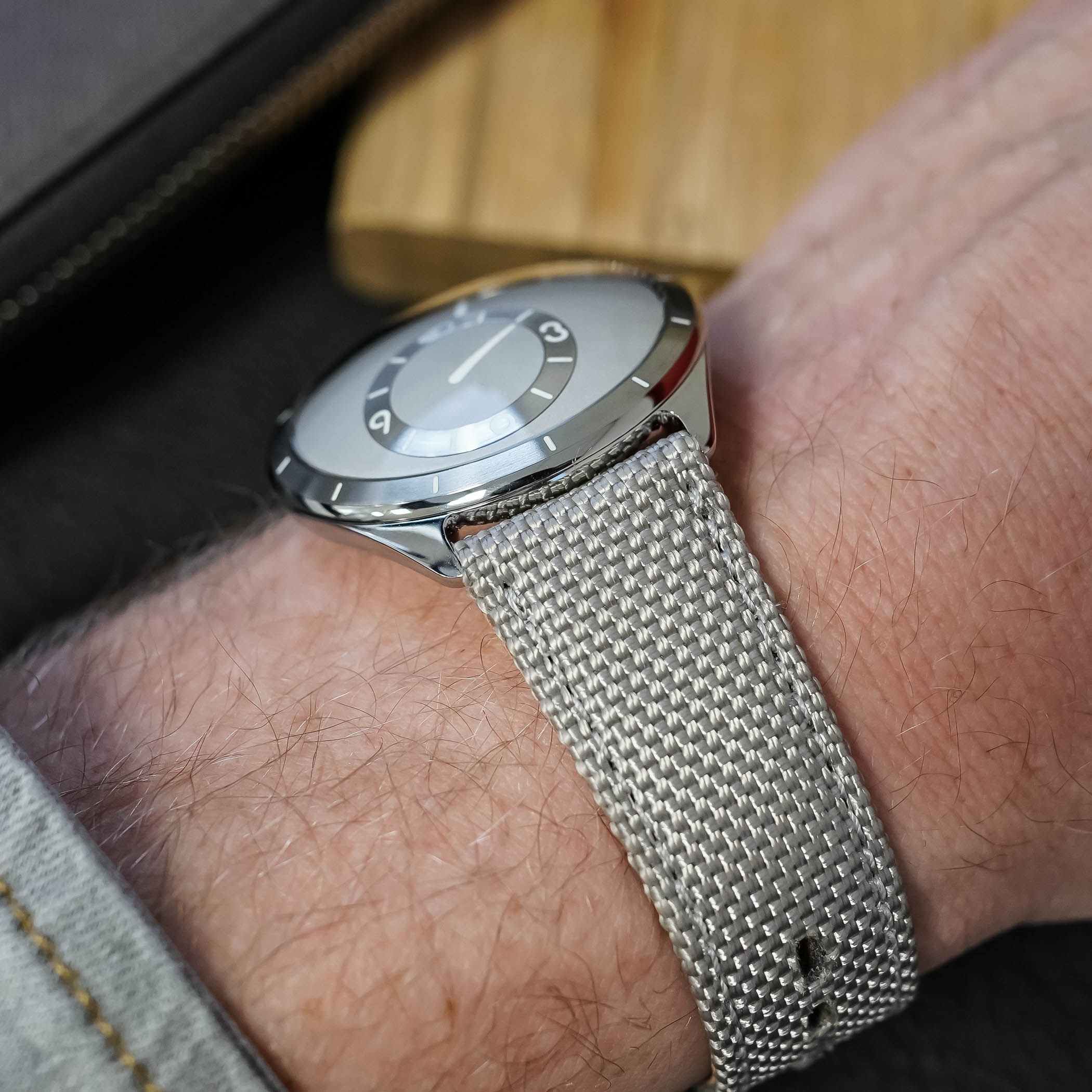 The ROCS 9 module in the new Ressence Type 9 is powered by the minute axle of a customised automatic movement based on the ETA 2892/2, offering a 36-hour power reserve. Fitted with small lugs, the Type 9 comes with a grey synthetic textile strap and a titanium pin buckle.