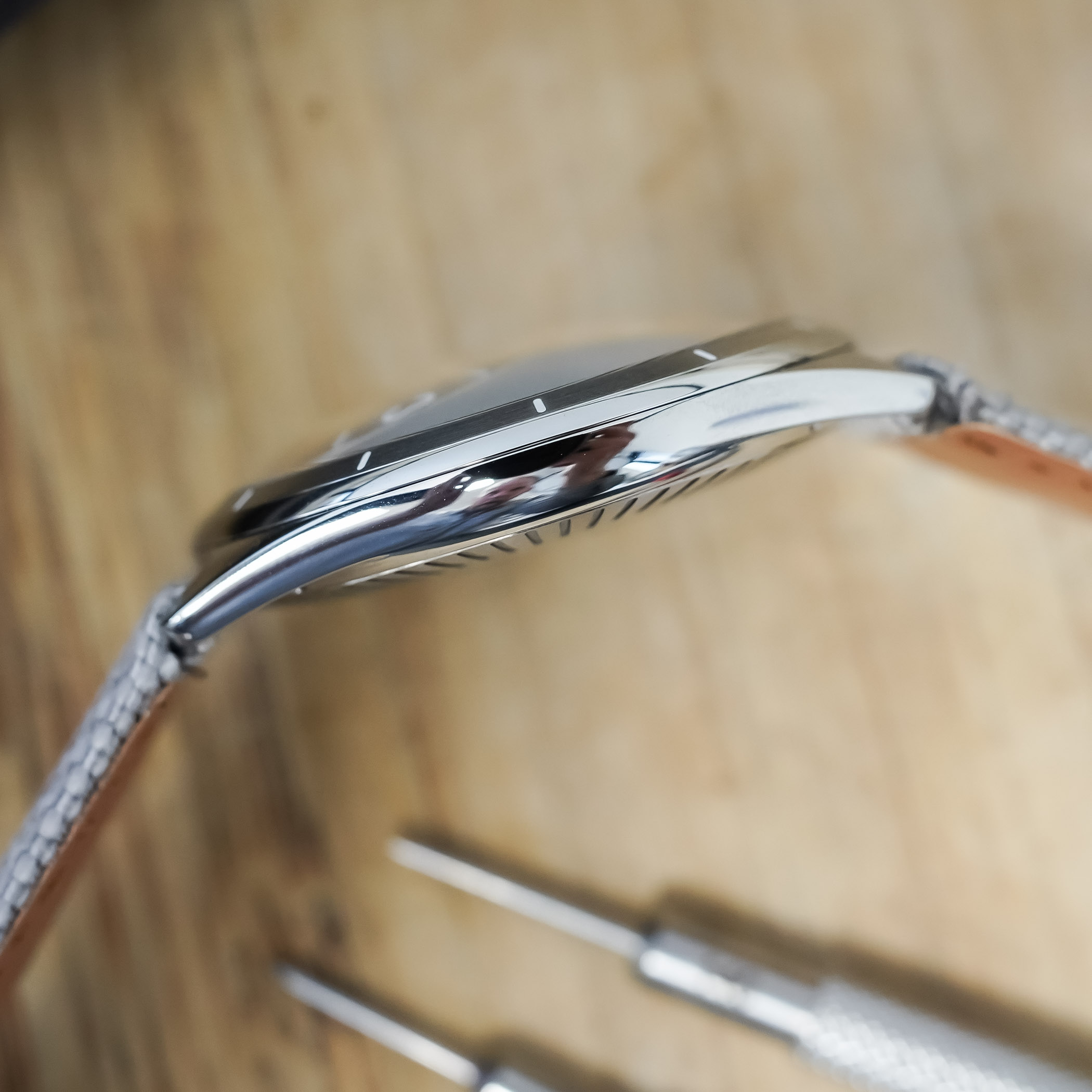 Although the Type 8 and Type 9 share the same case height of 11mm, the double-domed flying saucer profile of the Type 8 is visually attenuated with the flatter caseback, the short lugs and the incorporation of an external bezel of the Type 9.