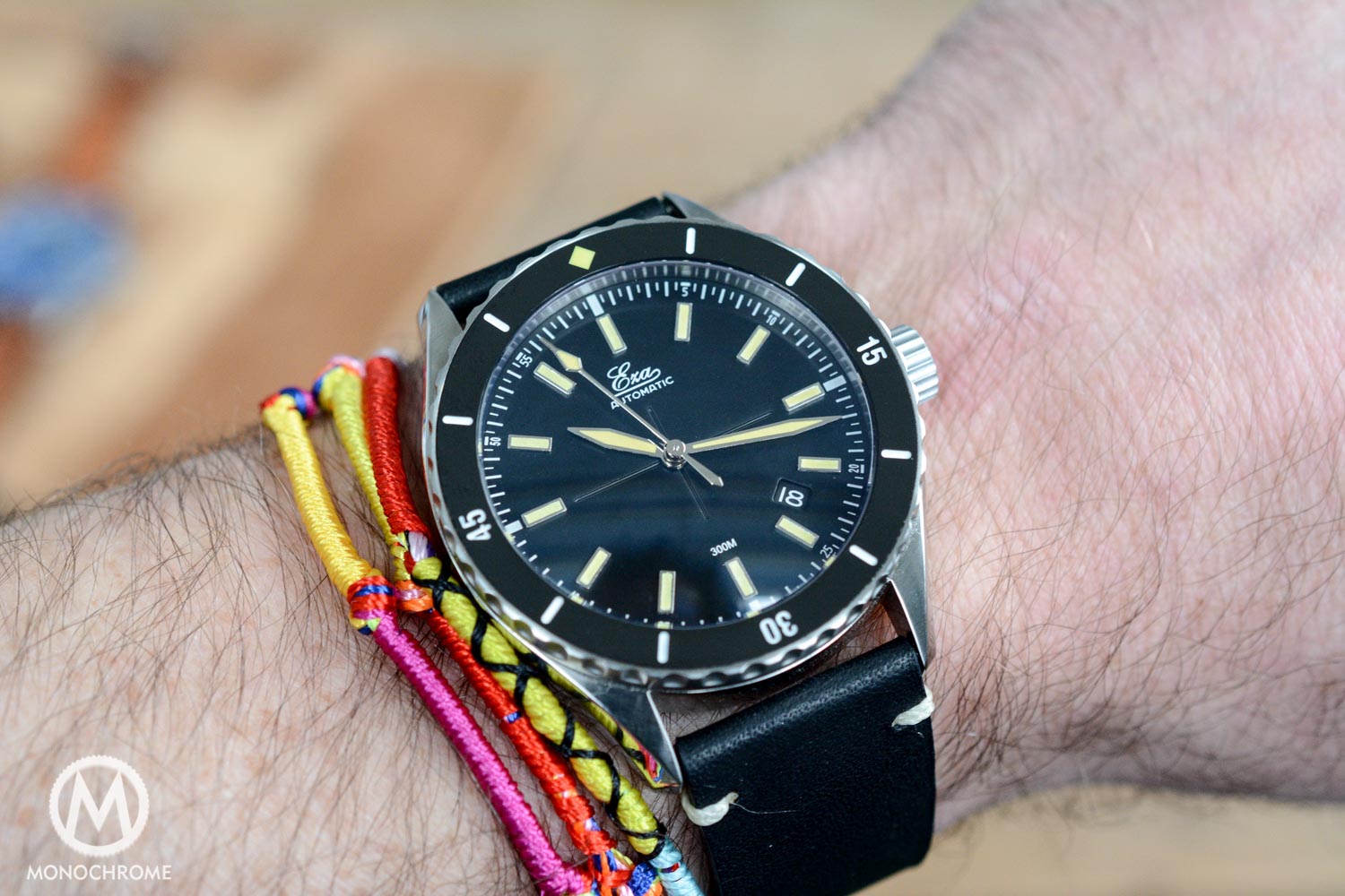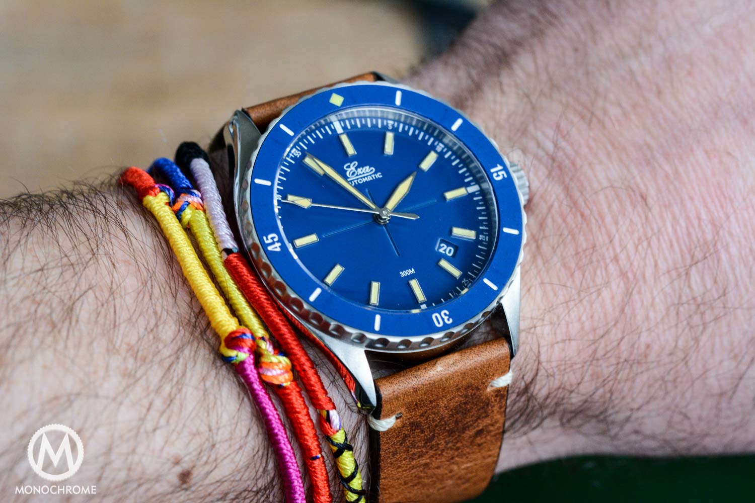 Being a dive watch, the EZA Watches Sealander is of course examined as one. Does it meet the requirements? Well, yes. Quite easily actually. It features a clean, legible dial and a tool-like built case with rotating dive bezel (unidirectional of course). Water resistance is on par too, at 300 meters. You can argue if that is enough or not, but for 99.9% of the owners, it will be. Who takes their dive watches further below the surface of a swimming pool when on vacation, or maybe snorkeling or scuba diving, raise your hand! Exactly, virtually no-one – well, only a very few of us.