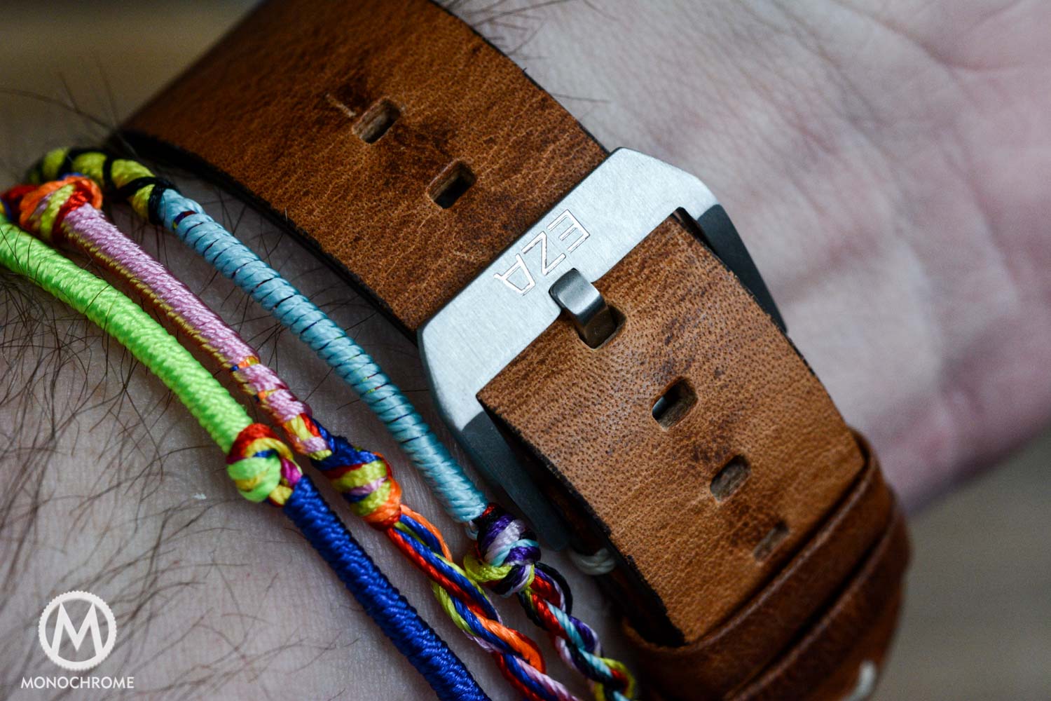 The strap of the EZA Watches Sealander can be black, dark brown or cognac leather, vintage-style, with minimal stitching. These straps are nice and soft, and fits with the vintage theme. The second strap that comes with each and every EZA Watches Sealander is a NATO strap, in grey and black Bond-like style, with bespoke EZA Watches hardware.