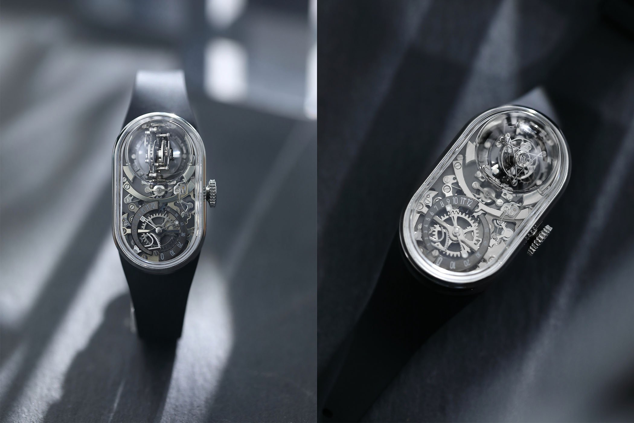 The Fam Al Hut Mark I’s case construction, dial architecture, and movement layout reflect a clear dedication to aesthetic refinement. The design is neither overly traditional nor excessively avant-garde, striking an appealing balance. Elongated yet compact, its capsule-shaped case is topped with a domed sapphire crystal, with a secondary, pronounced sapphire bubble dome to accommodate the bi-axis tourbillon. They both provide excellent views of the Mark I’s highly detailed, openworked movement while accentuating its futuristic, avant-garde design.