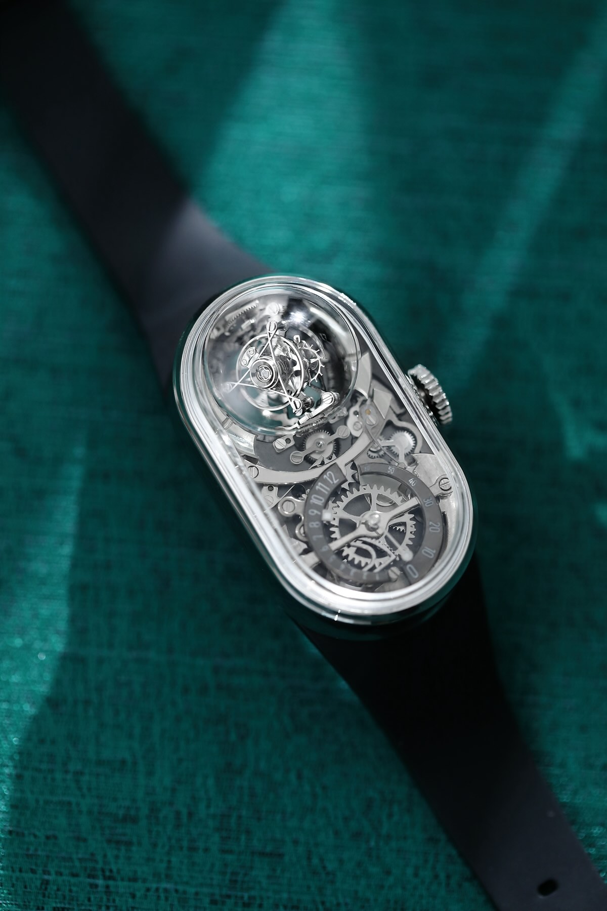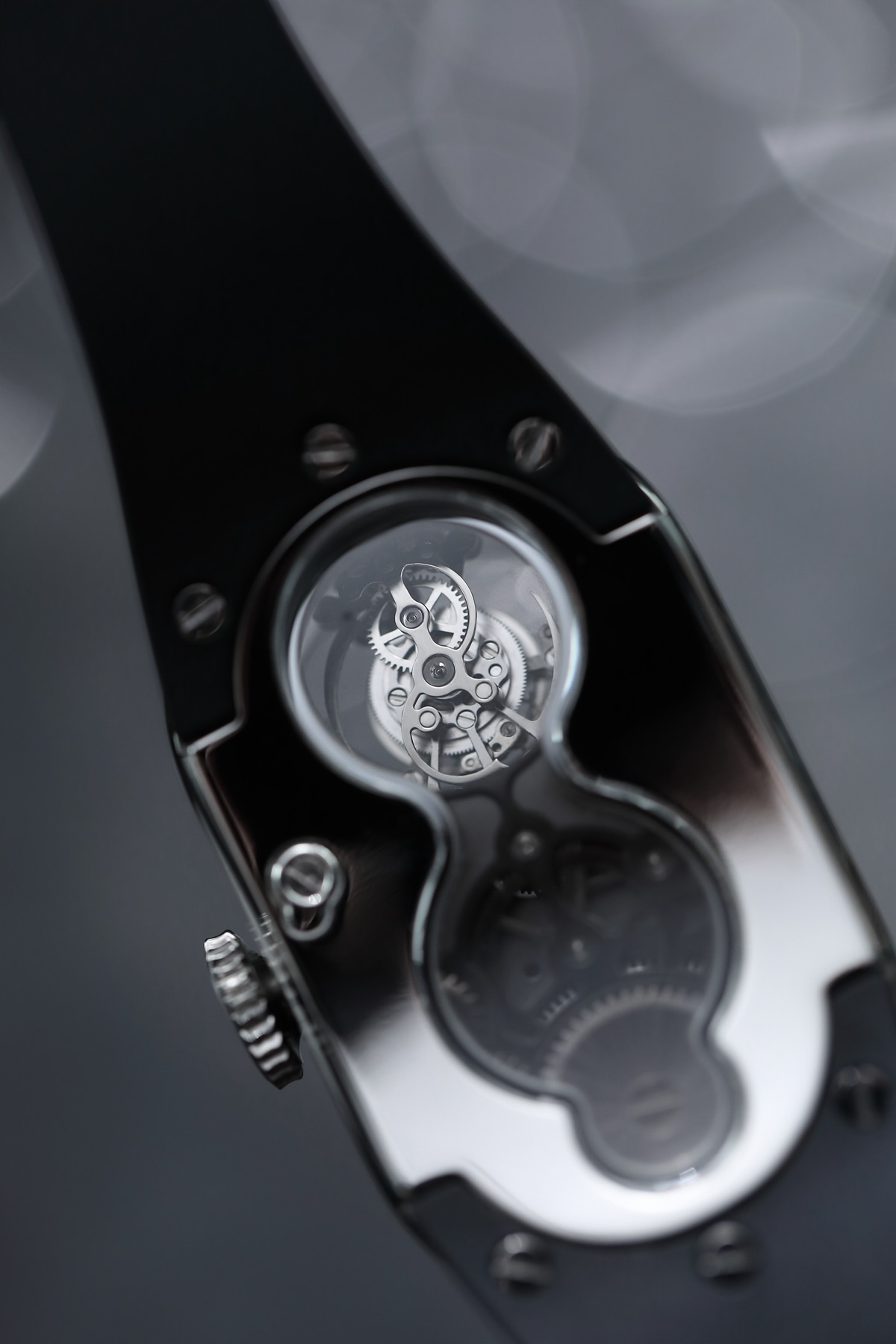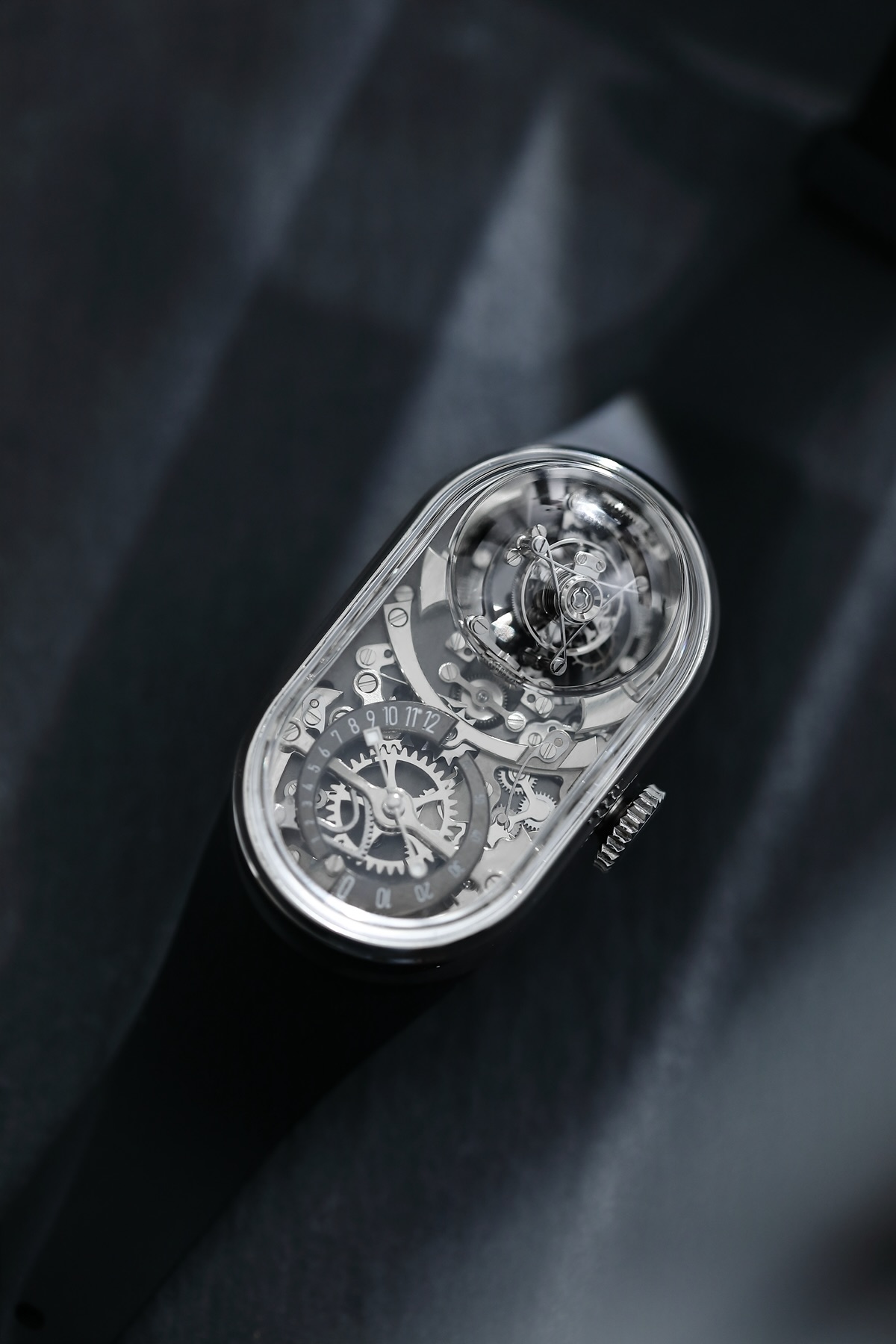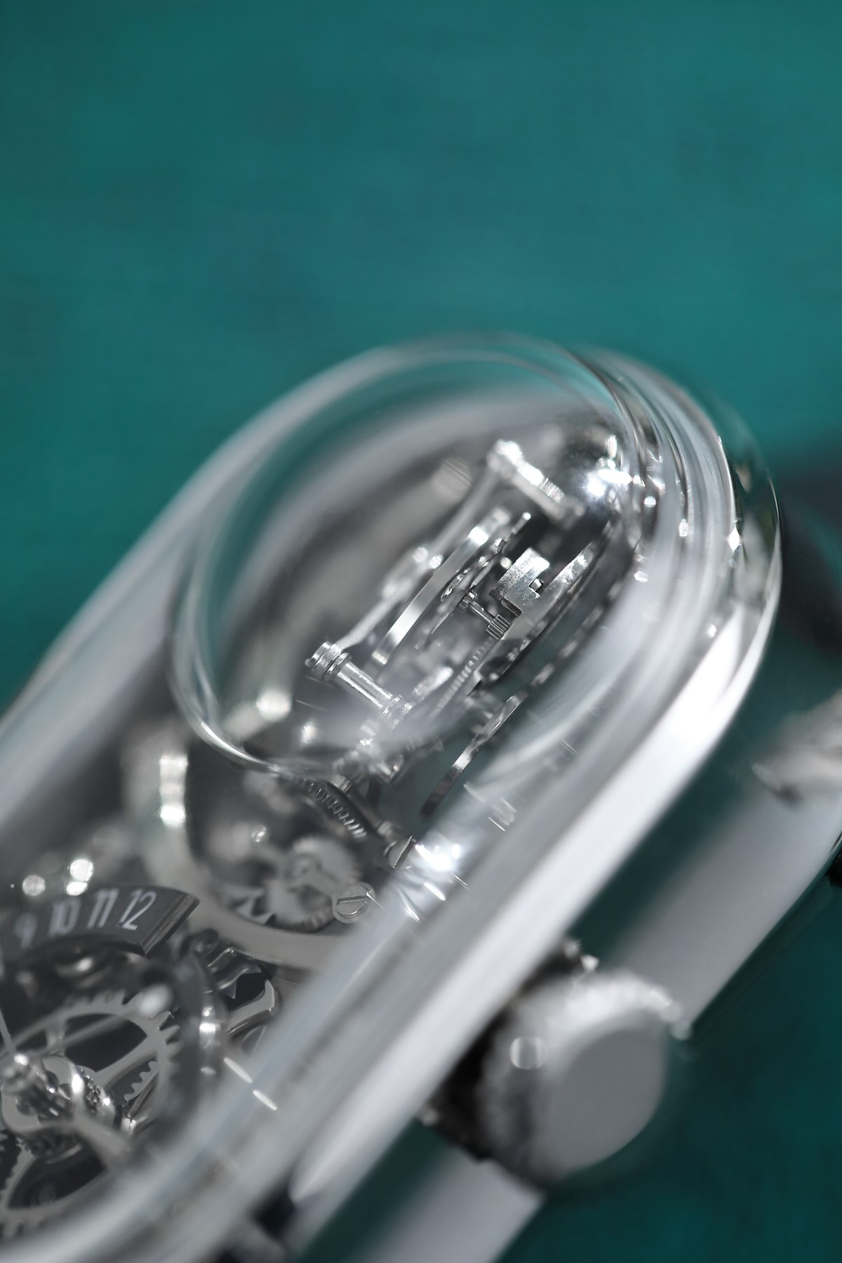 The Fam Al Hut Mark I’s case construction, dial architecture, and movement layout reflect a clear dedication to aesthetic refinement. The design is neither overly traditional nor excessively avant-garde, striking an appealing balance. Elongated yet compact, its capsule-shaped case is topped with a domed sapphire crystal, with a secondary, pronounced sapphire bubble dome to accommodate the bi-axis tourbillon. They both provide excellent views of the Mark I’s highly detailed, openworked movement while accentuating its futuristic, avant-garde design.