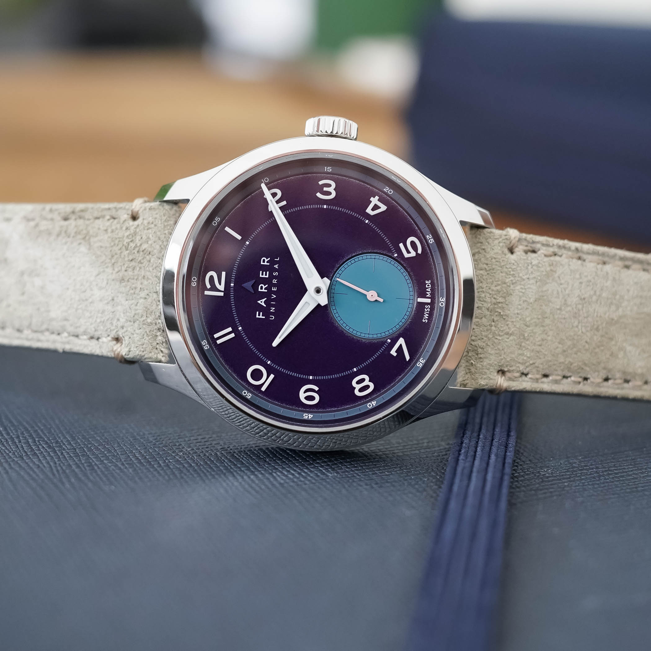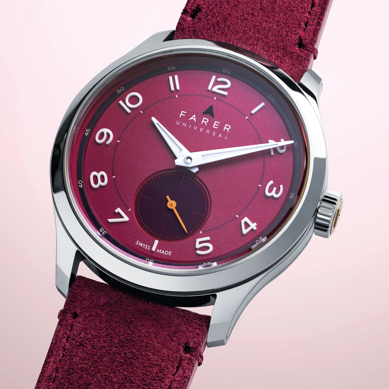 The model photographed here is the Lindley, featuring a deep purple dial paired with a powder blue recessed sub-dial at 6 o’clock. The sunken minutes track in blue is punctuated by pink double-digit numerals at five-minute intervals, echoed by a pink small seconds hand. White hands and applied Arabic numerals complete the look, all glowing thanks to Lumicast – a mix of Super-LumiNova and ceramic – while the hands are filled with high-intensity X2 Super-LumiNova.