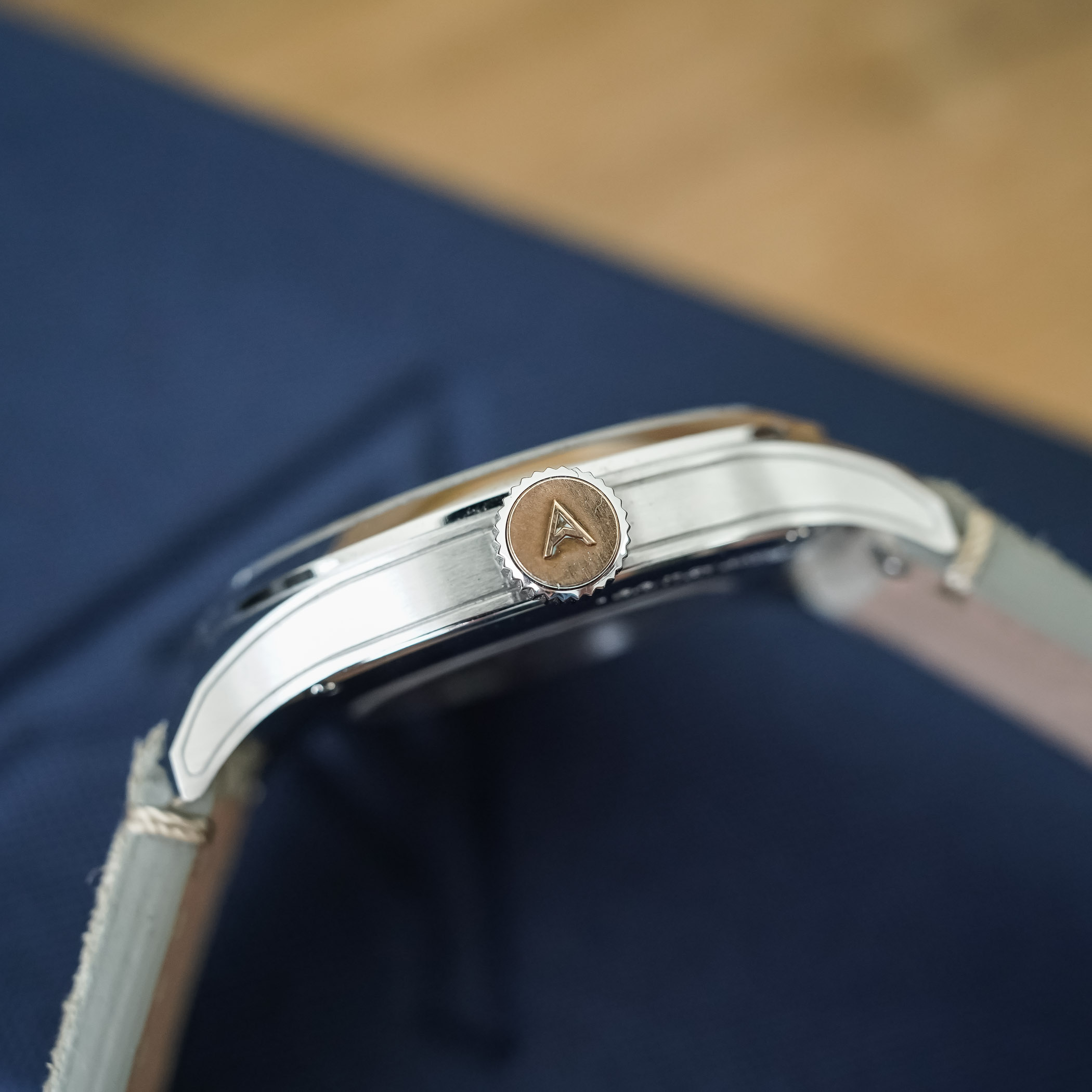 The Farer Lissom collection debuts with a sleek 38mm stainless steel case. True to its name, lissom, the case is just 7.95mm thick and has a comfortable 42.8mm lug-to-lug length. The short, slightly curved lugs enhance wearability, while the brushed mid-case features deep contours for added texture. A polished bezel and lugs provide contrast, and the push-pull crown at 3 o’clock is finished with a bronze insert bearing the Farer logo (a classic for the brand). Up top, a flat sapphire crystal protects the dial, and a transparent caseback offers a view of the movement. Water-resistance is 50 meters, which is sufficient considering the vocation of the Lissom.