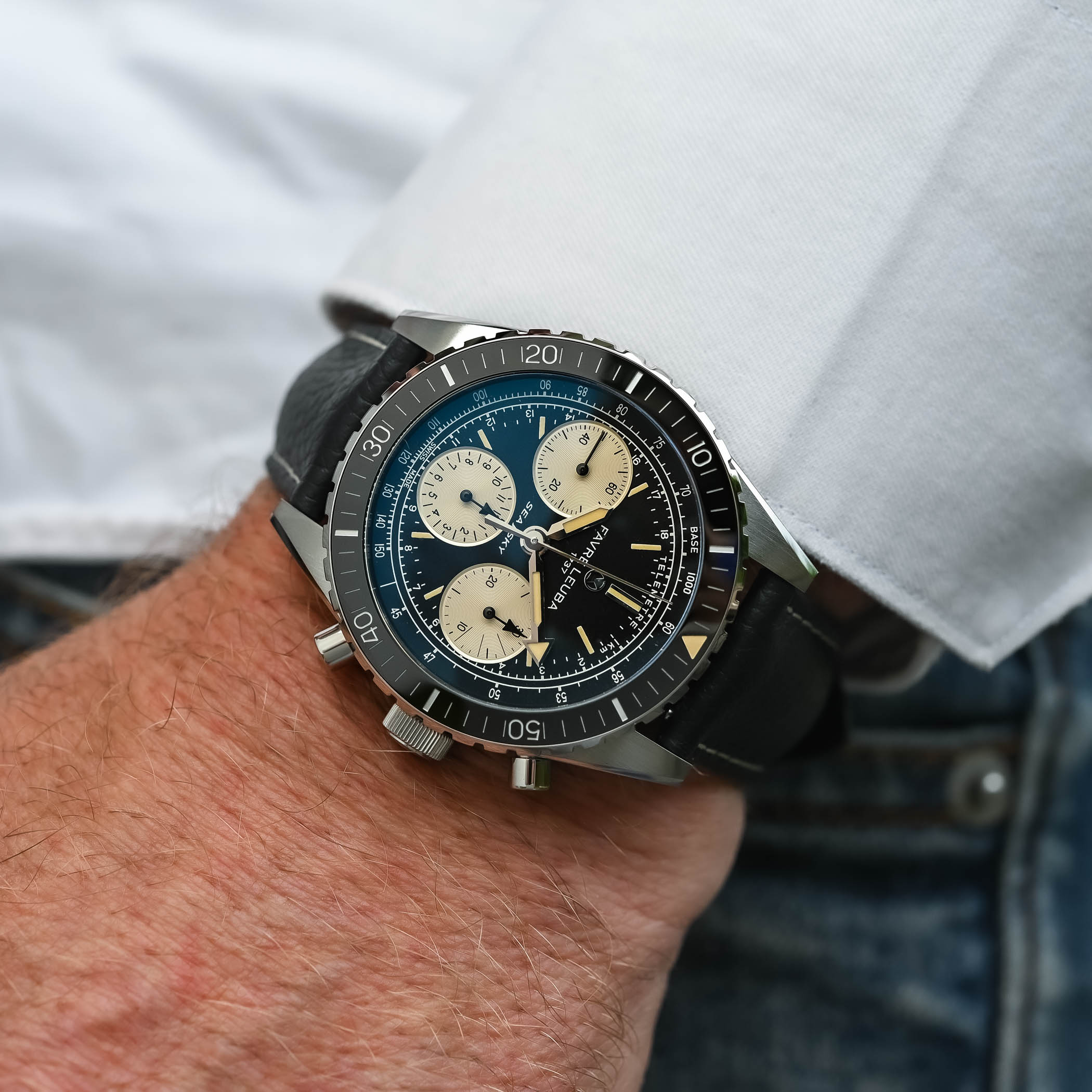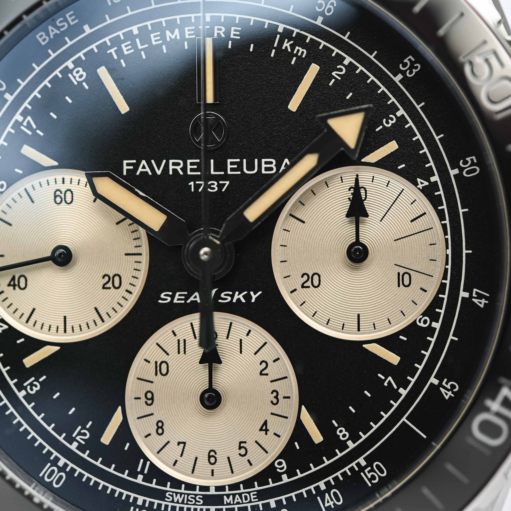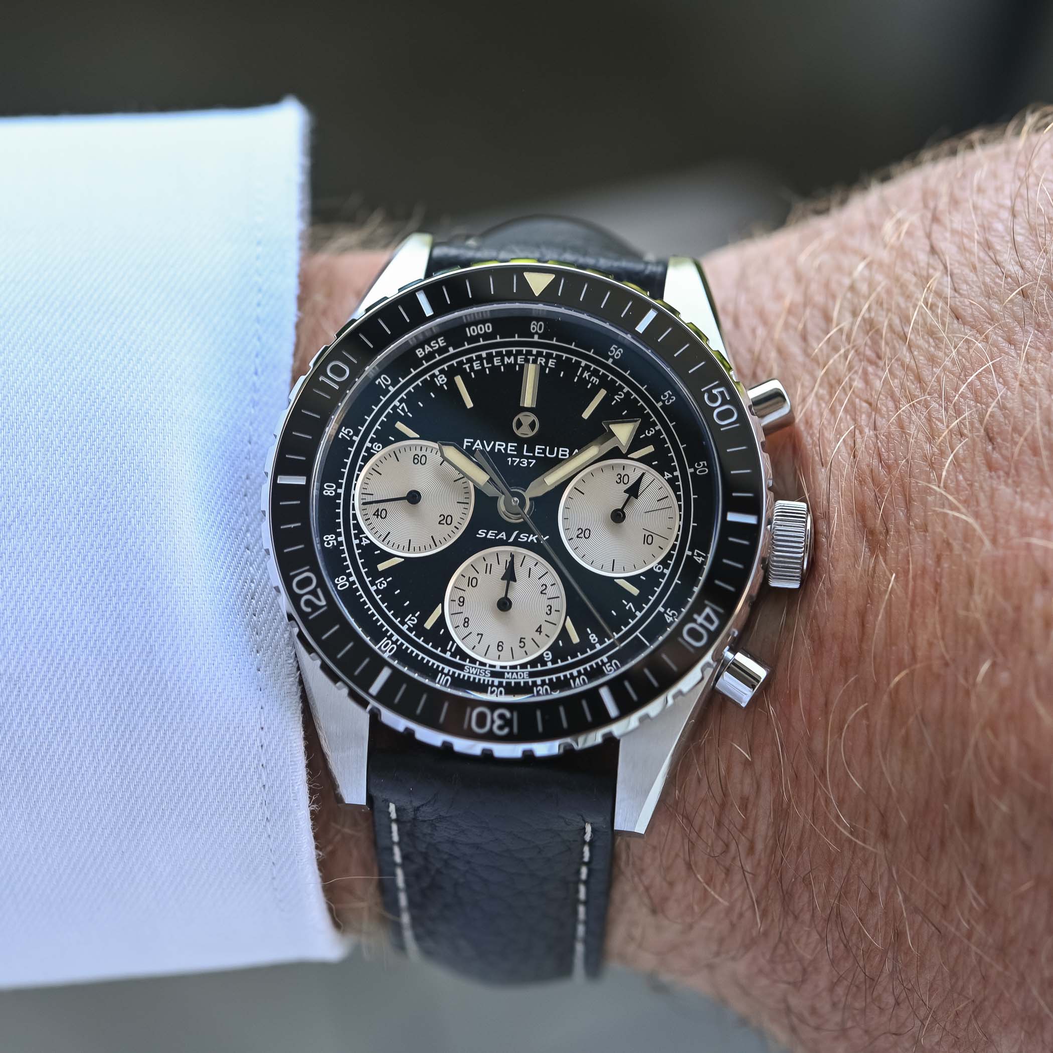 It might come as a surprise to learn that Favre Leuba is the world’s second-oldest watch company. Founded in 1737 by Abraham Favre in Le Locle, the brand reached a high point in the mid-1960s with its rugged purpose-designed tool watches. Now in the hands of industry veteran Patrik Hoffmann, his “revival and renaissance” strategy is combined with relatively affordable prices. Headquartered in Grenchen, Hoffmann’s roadmap for the brand is ambitious, foreseeing the production of 80,000 to 100,000 pieces in the next decade. Relaunched during Geneva Watch Days 2024, Favre Leuba staged its grand return with 22 references across three collections. One of those references is the Sea Sky Revival, a model inspired by a vintage Favre Leuba chronograph for divers and pilots with an inverted panda dial and tachymeter and telemeter scales.