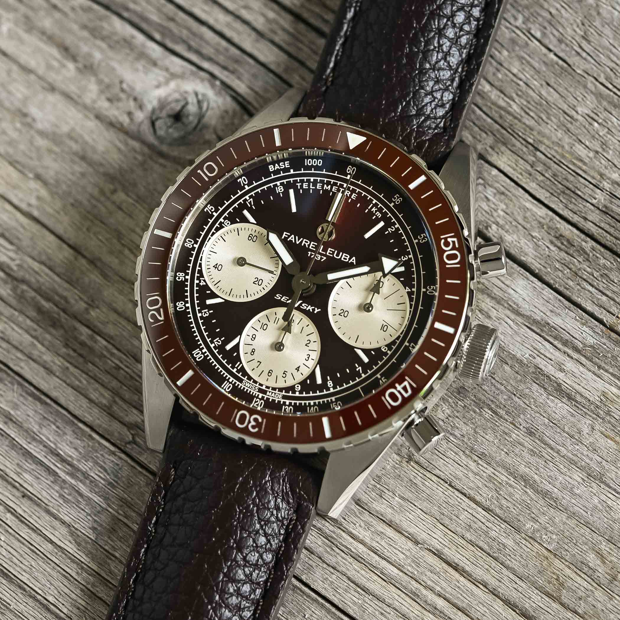 Below: a circa 1960s Reference 33033 Sea Sky Chronograph from Favre-Leuba (image by watchesofswitzerland.com) next to the 2024 Sea Sky Revival, here with a brown dial
