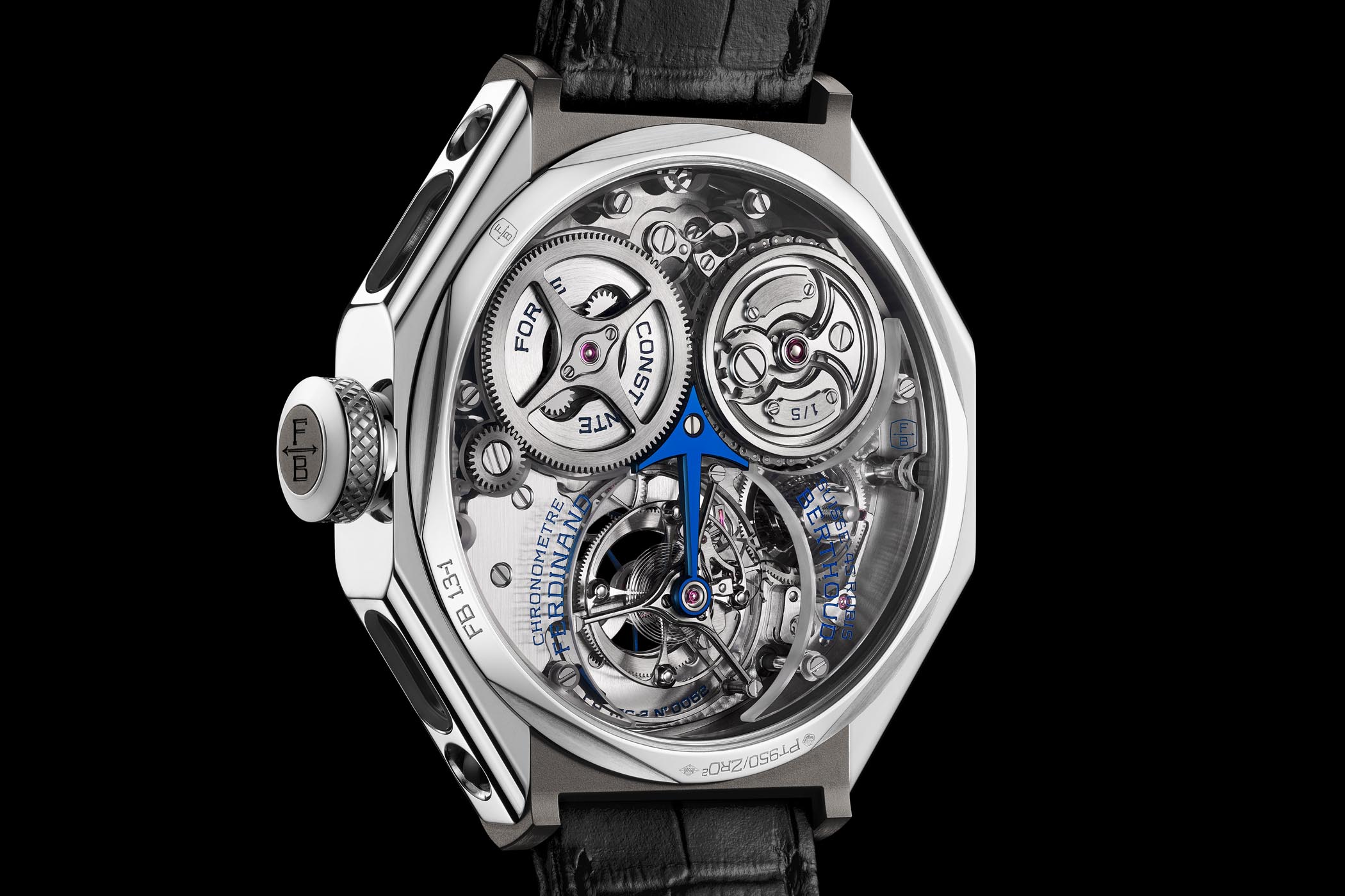 Inside is the hand-wound FB-T.FC-2 calibre, a version of the brand’s inaugural movement featuring three sapphire bridges. Together with the exhibition caseback, these transparent bridges offer an unimpeded view of the watch’s sophisticated and flawless inner workings. A pillar architecture, the movement includes a fusée-and-chain and a one-minute tourbillon. The large tourbillon is secured by a blue CVD-coated arrow-shaped bridge. Operating at 3Hz, it features a balance spring with a Phillips terminal curve.