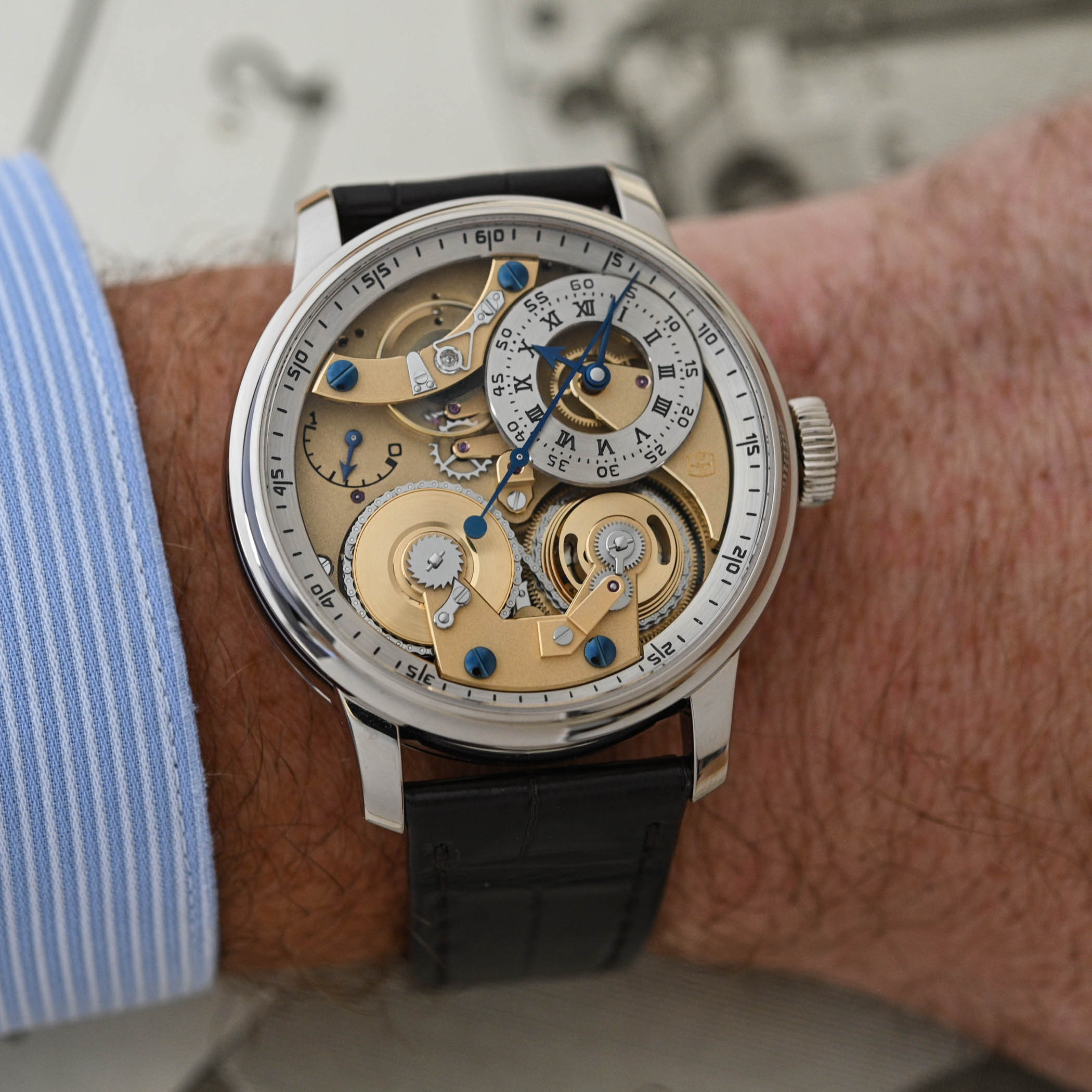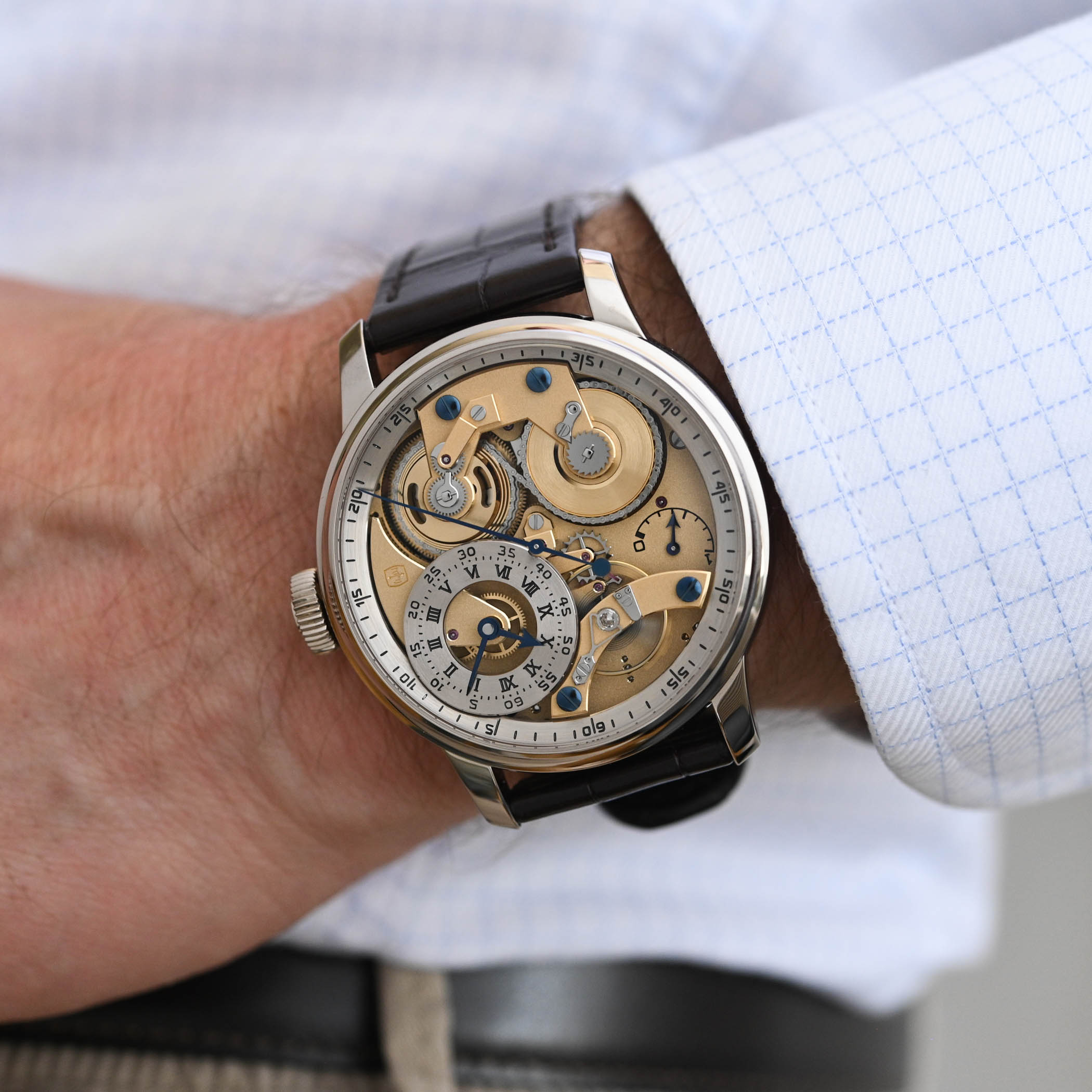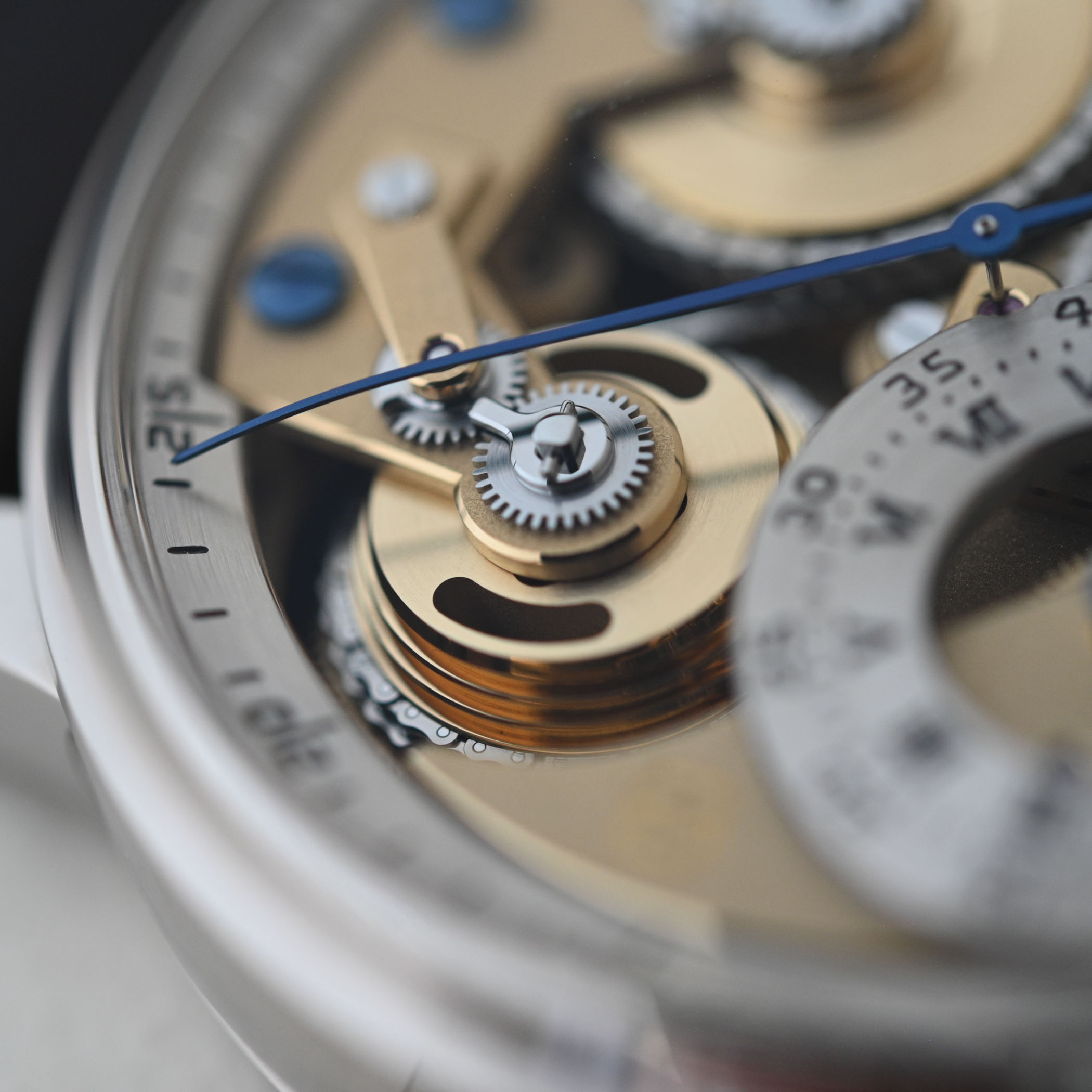 In pure Berthoud fashion, all the structure of the movement, with its stepped bridges and pillars, is entirely visible. The focus on chronometry is also evident, with a constant-force mechanism (fusée-and-chain), a bimetallic Guillaume-type thermo-compensated split balance, a stop-seconds mechanism, and more.