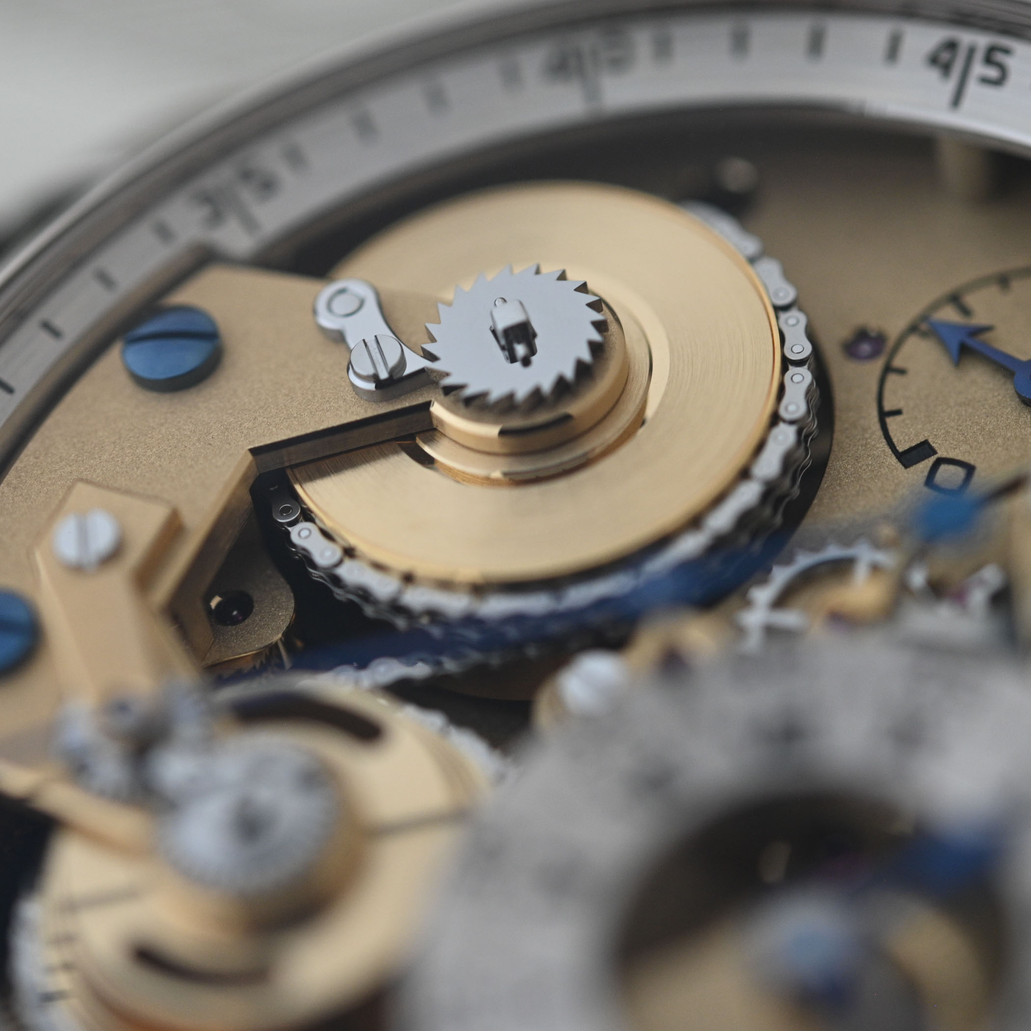 The fusée developed for the FB-BTC.FC calibre features a direct drive stopwork to prevent overwinding. An interesting feature for this chronometer, to prevent the watch from stopping during winding, a winding pawl and an auxiliary spring integrated into the fusee provide torque that enables the movement to continue running (for approximately up to 30 minutes, which is more than sufficient). When fully wound, the barrel delivers 50 hours of autonomy. Specifically developed for this calibre, the chain measures 172 mm in length with 477 components. Although they are handmade, the 285 links are thinner than those used in previous Berthoud watches.