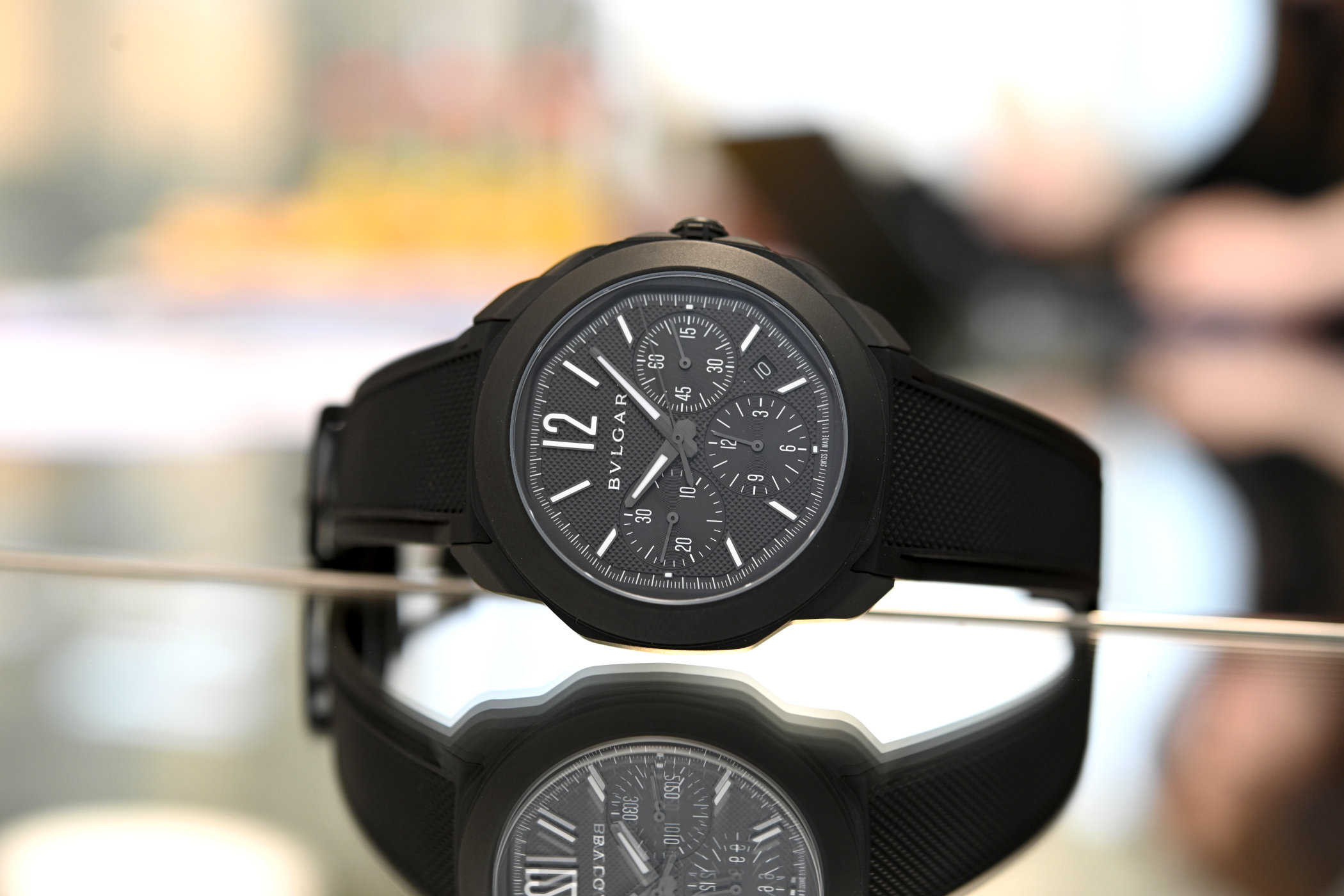 Introduced in 2023, the Octo Roma Chronograph is the first to be powered by the new BVL399 calibre (a Bulgari base with a Dubois-Dépraz module). Available with blue and black Clous de Paris dials, the latest version varies in that its stainless steel case is coated with black DLC. One of the most admired features of the 42mm case, with a thickness of 12.4mm, is the way the chronograph pushers have been integrated. In fact, they are so well integrated that they are almost invisible and could pass as part of the Octo Roma’s complex geometry. The screw-down crown, with its black ceramic tip, is protected by crown guards, ensuring a water-resistance of 100 metres.