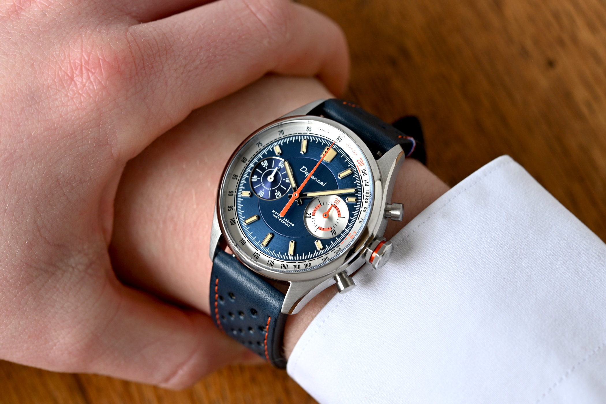 Where the Allure Manual Chronograph turns in another direction compared to its predecessor is the dial, which comes in grey or blue. Contrasting elements like the black or silvery-white tachymeter & pulsometer scales and 30-minute chronograph counter, and the Tangerine orange (or McLaren Papaya-orange with a bit of imagination) details all add to the racing flair of the watch. The retro racing theme continues with applied markers and central hour and minute hands with beige Super-LumiNova and a Tangerine orange central chronograph seconds hand. The marker at 12 is exchanged in favour of the brand’s shield-like logo, which keeps things neat and tidy. The central section is finished with the script “Depancel” and “Motor racing instrument”.