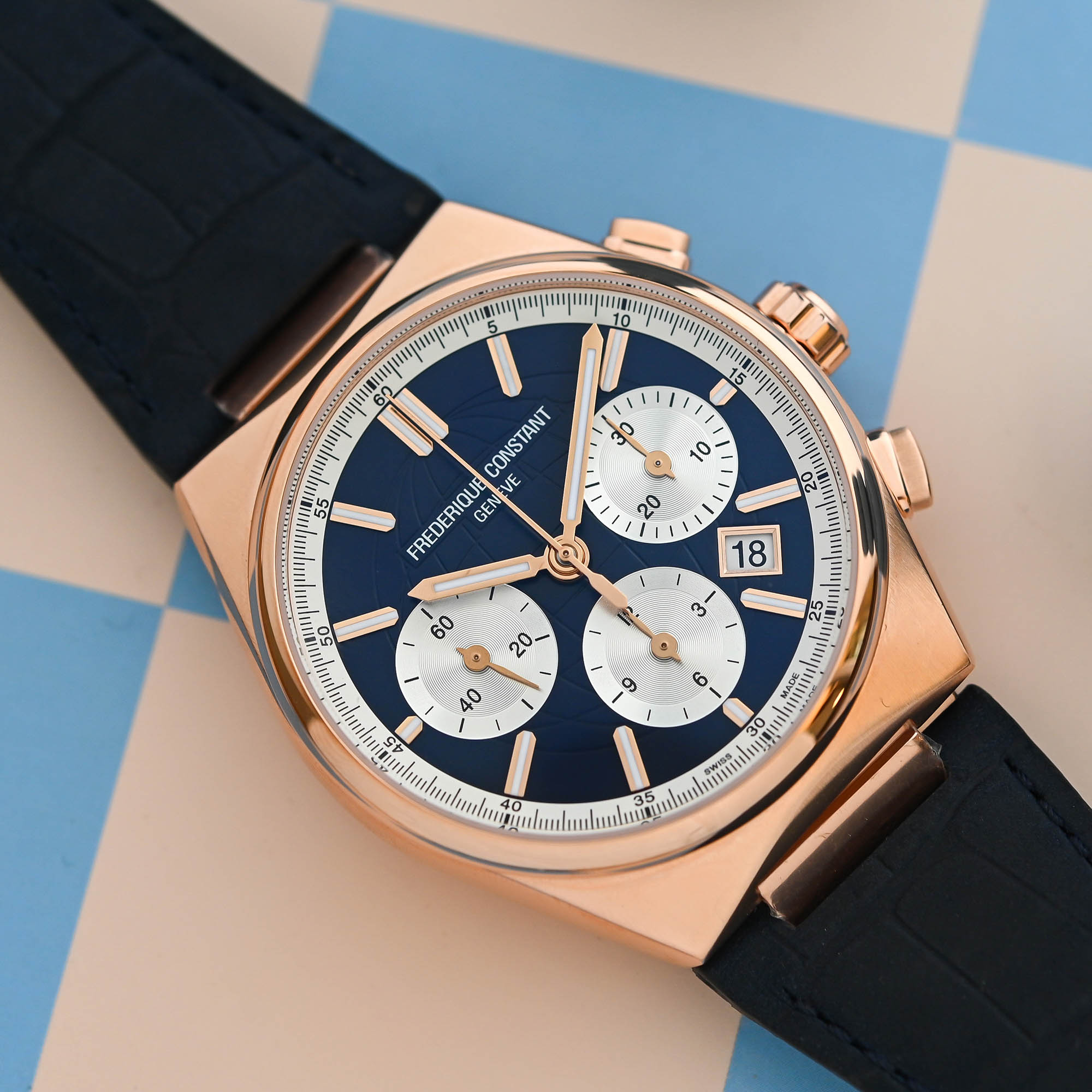 Powering the new Highlife chronographs is the same FC-391 automatic calibre from the earlier models. It’s a column wheel chronograph based on the Valjoux 7750 (then modified by La Joux-Perret) with 26 jewels, a beat rate of 28,800vph (4Hz) and an extended 60-hour power reserve. Functions include central hours, minutes and chronograph seconds, small seconds, 30-minute counter, 12-hour counter and date in a tri-compax layout. Finishing includes Côtes de Genève on the plates and gold rotor.