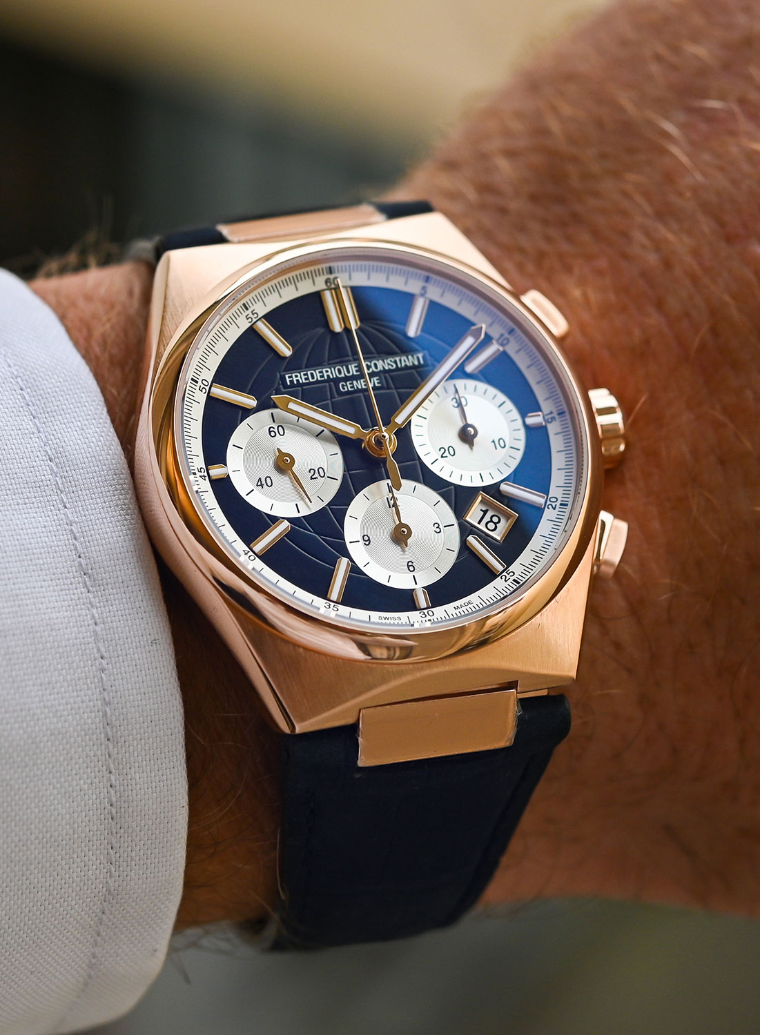 The dial designs are the main feature and really separate these from the earlier models. The steel finish piece has a matte silver dial with three dark green sub-dials – a 30-minute counter at 3 o’clock, a 12-hour counter at 6 o’clock and small seconds at 9 o’clock. A white date window is tucked between 4 and 5 o’clock. Silver-coloured applied indices and hour/minute hands have white Super-LumiNova inserts and sit above an embossed globe pattern that spans most of the dial. The rose gold-plated model has a matte navy blue dial with silver sub-dials. The hands and indices are rose gold-plated with Super-LumiNova, the white date window is in the same place and both models have an outermost minute/seconds track that matches the sub-dial colours.