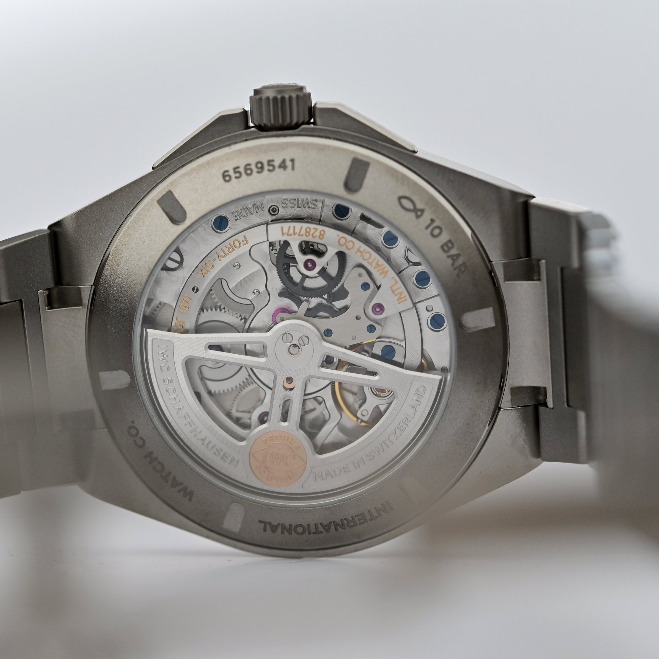 Powering the watch is the IWC-manufactured calibre 82600, visible through a sapphire caseback. This automatic movement integrates Kurt Klaus’ mechanically programmed perpetual calendar, allowing all indications to be adjusted via the crown. The Pellaton winding system uses ceramic components for high-wear parts such as the automatic wheel and clicks, improving durability and long-term efficiency. Operating at 28,800 vibrations/hour, the movement delivers a 60-hour power reserve and is finished with Geneva stripes, circular graining and blued screws.