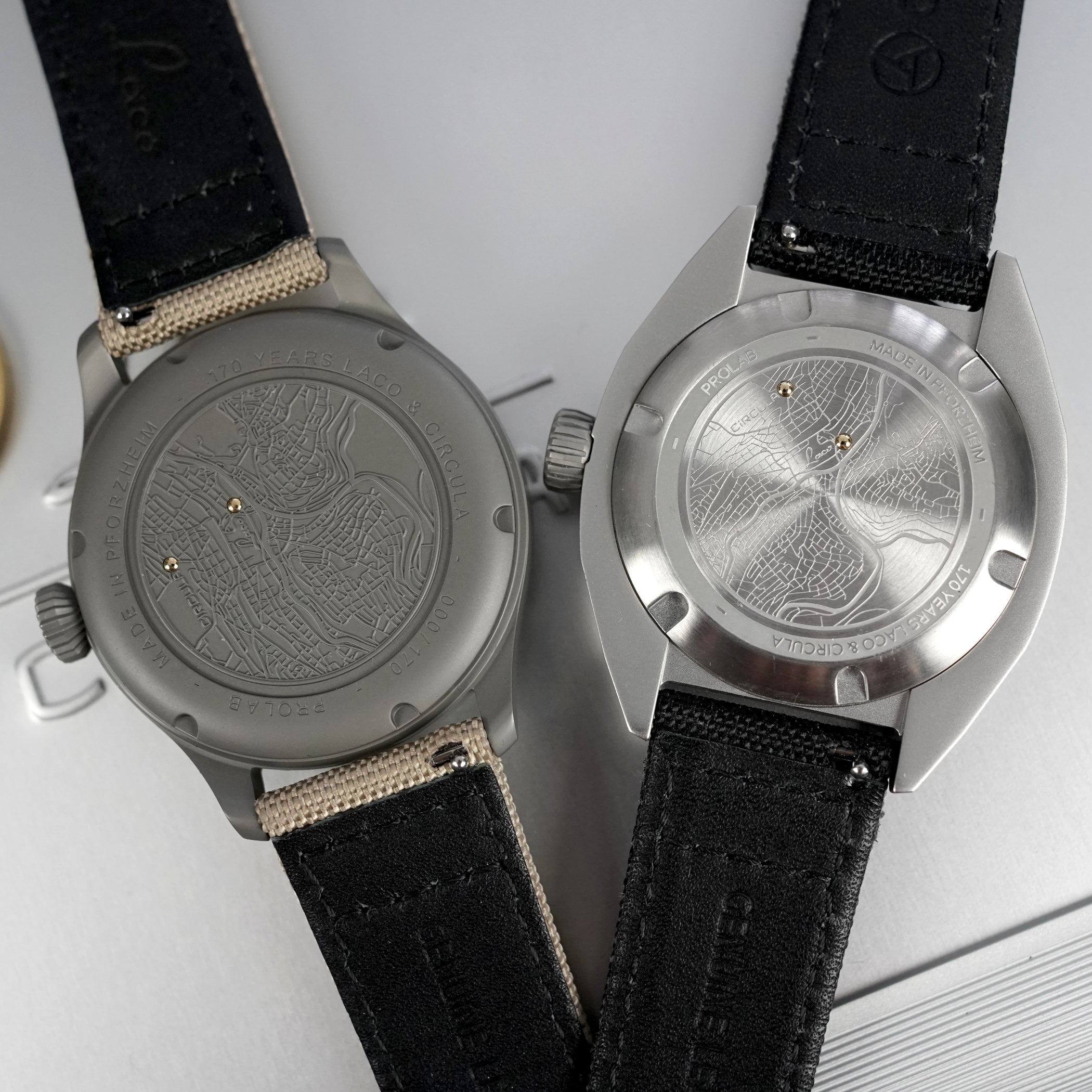 The ProLab – 170 Years set can’t be separated, so both watches are sold together as a limited package of 170 – that number comes from 100 years of Laco and 70 years of Circula. The sets come in an aluminium case with a gold (coloured) coin with the limited-edition number. Uwe Rücker and Cornelius Huber, Owners & Managing Directors of Laco and Circula, respectively, have formed a unique partnership highlighting competitors coming together to honour watchmaking in the same city of Pforzheim.
