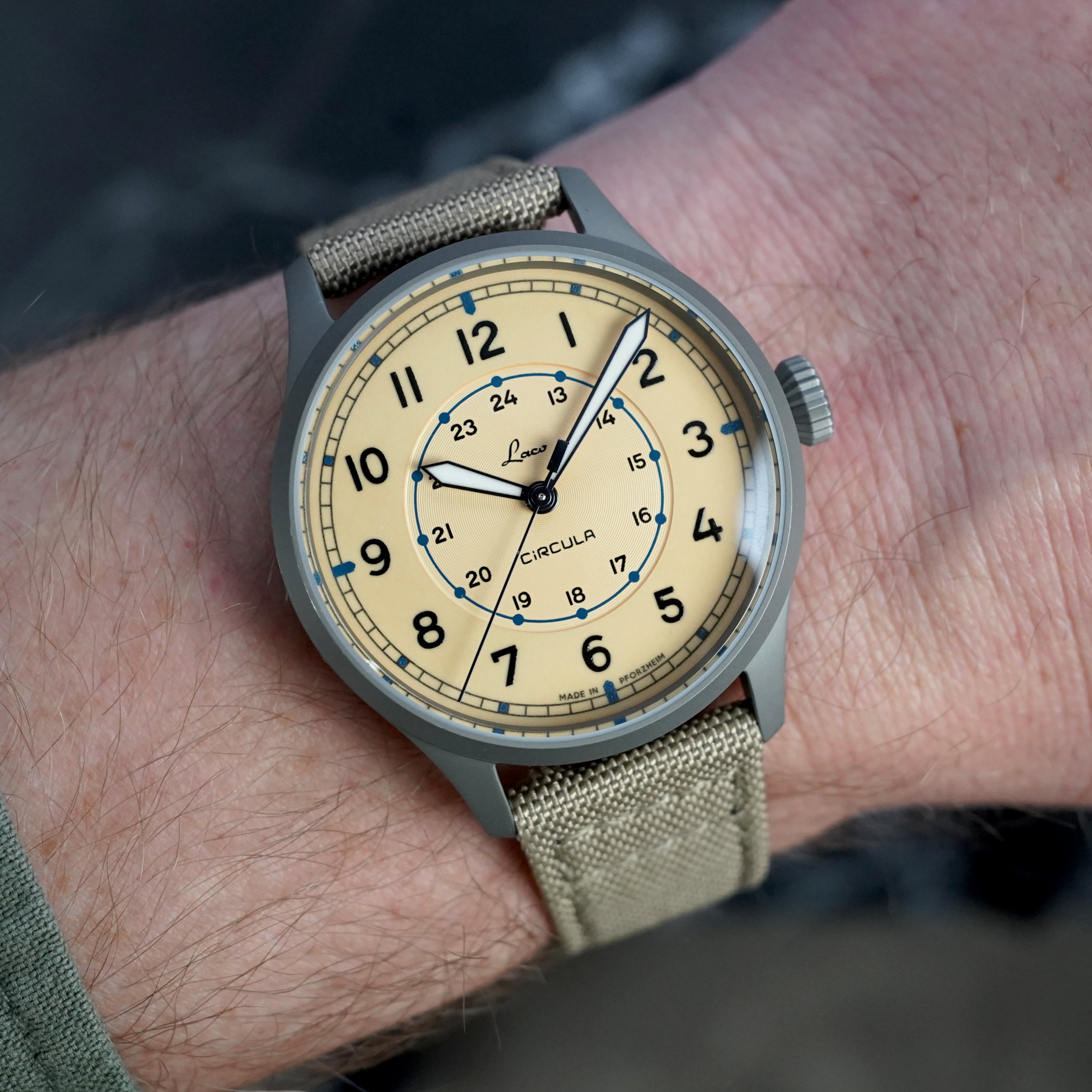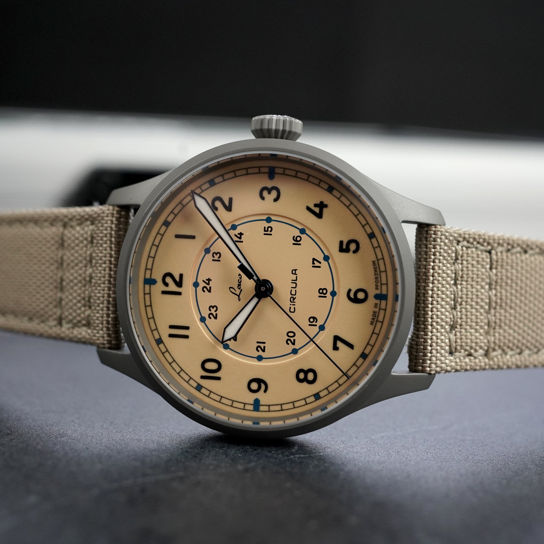 Old Radium Super-LumiNova is used on the entire outer ring, and the thermally blued hour and minute hands have Super-LumiNova BGW9. Both Laco and Circula are printed on the dial of both watches, with the watch-specific brand name at the top. The watch is fitted with a 20mm sand-coloured sailcloth strap with leather lining and quick-release levers. Powering Laco’s watch is a Sellita SW200-1 Elaboré automatic with 26 jewels, a beat rate of 28,800vph (4Hz) and a 41-hour power reserve. It’s adjusted in three positions for an accuracy rating of +/-7 seconds per day. Functions include central hours, minutes, hacking seconds and date (the latter not utilised here).