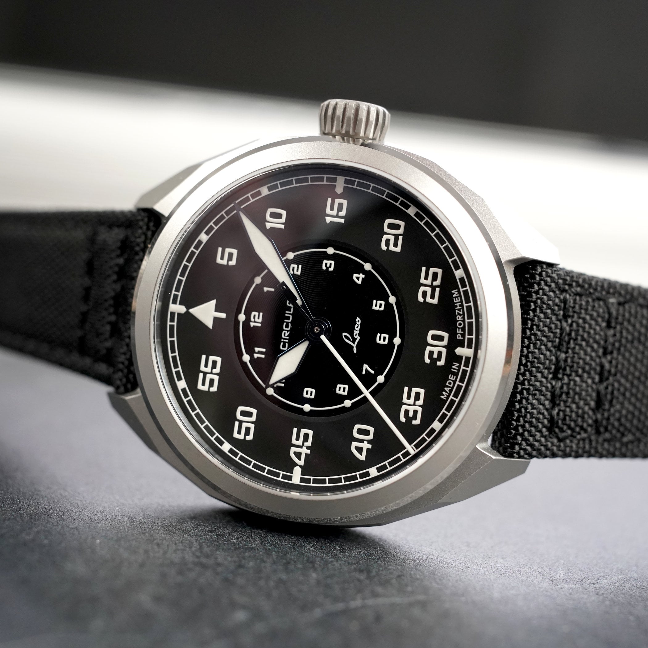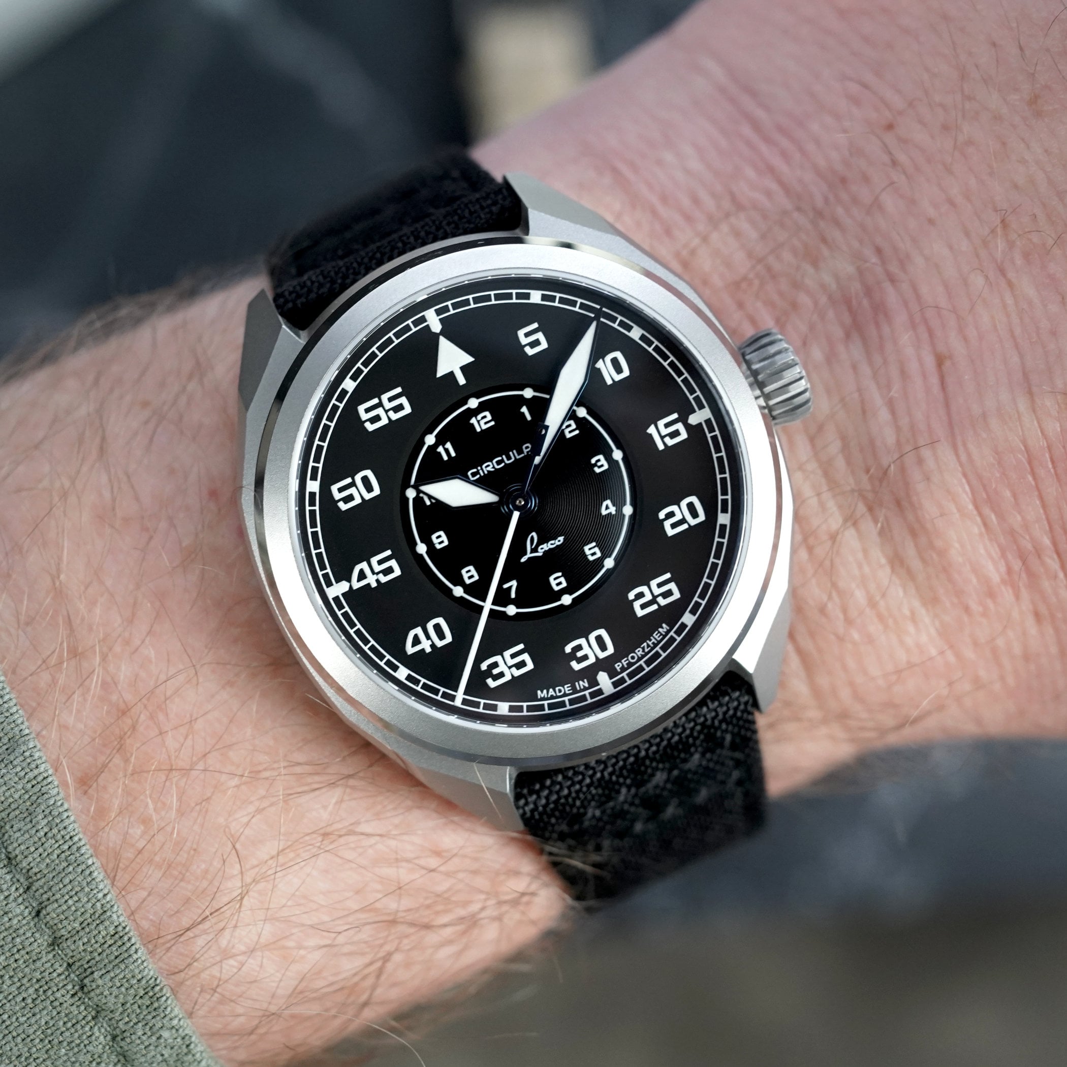 Circula’s piece starts with the 40mm stainless steel ProTrail case that’s treated for scratch resistance to 1,200 Vickers hardness. It’s a bit thicker than the Laco counterpart at 12.3mm and has additional antimagnetic protection. The screw-down crown ensures 150 metres of water resistance (50m less than the Laco), and the solid case back is engraved as the Laco piece. An AR sapphire crystal protects the black dial with circular graining on the inside and 12-hour numerals and a matte finish on the outer ring with a Type-B-inspired setup (large Arabic numerals going from 5 to 55).