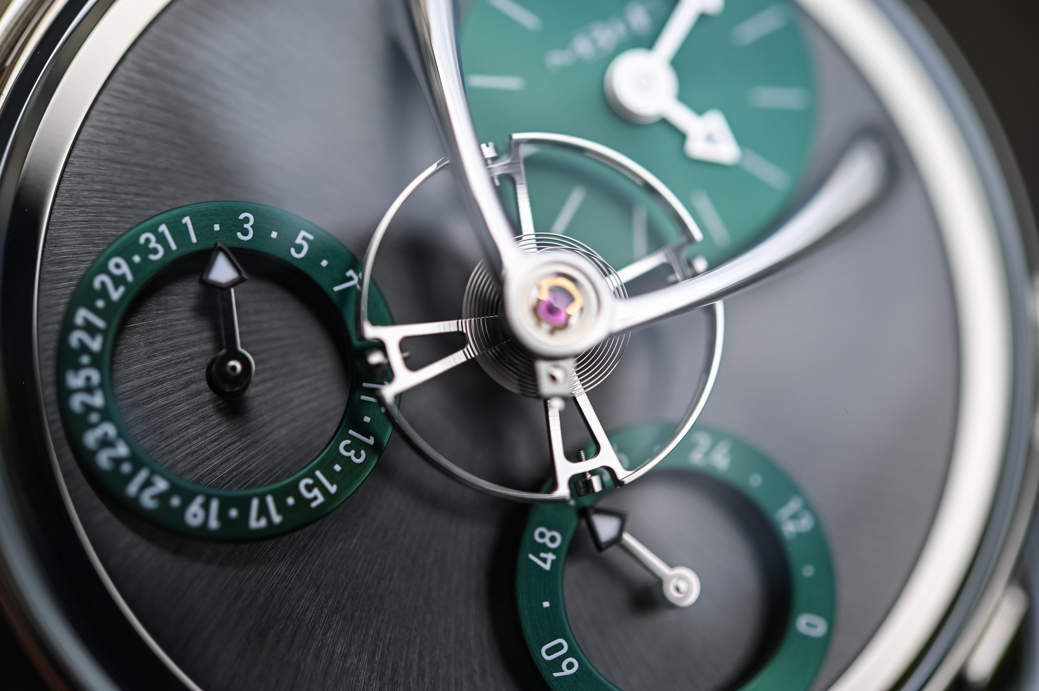 The LM Split Escapement EVO references have been available for a couple of years, both as limited and serial production pieces. In 2021, the brand quietly released a 10-piece limited edition with a salmon dial, marking 50 years since the founding of the United Arab Emirates. An appealing version with an “Icy Cool” dial and slate grey sub-dials became part of the serial production lineup in 2022. That same year, a limited edition of 25 LM Split Escapement EVO watches with a black base dial and dark blue sub-dials was exclusively produced for the Beverly Hills MB&F LAB. And now, this new edition enters the equation with a black & green colour scheme exclusive to the MB&F Lab in Taipei, Taiwan.
