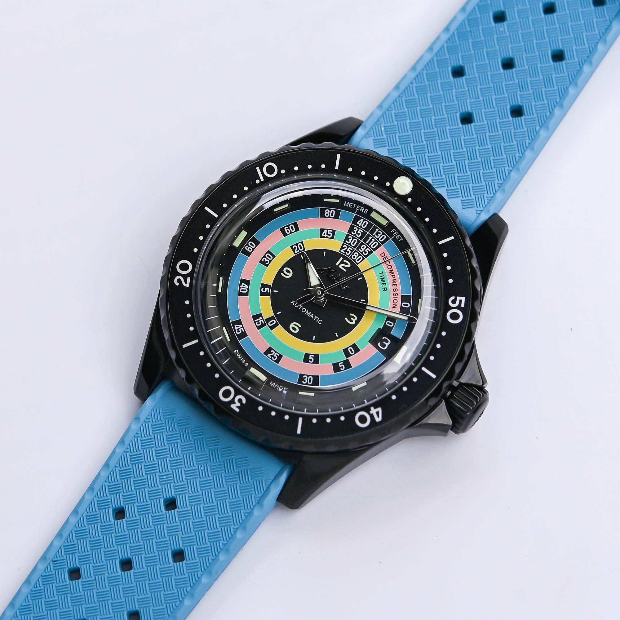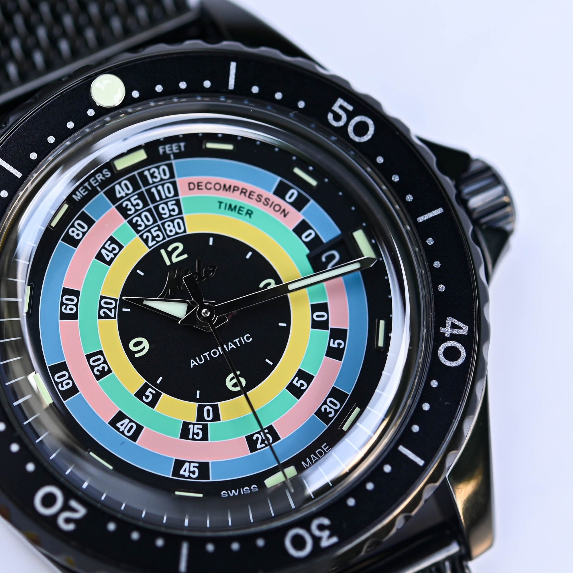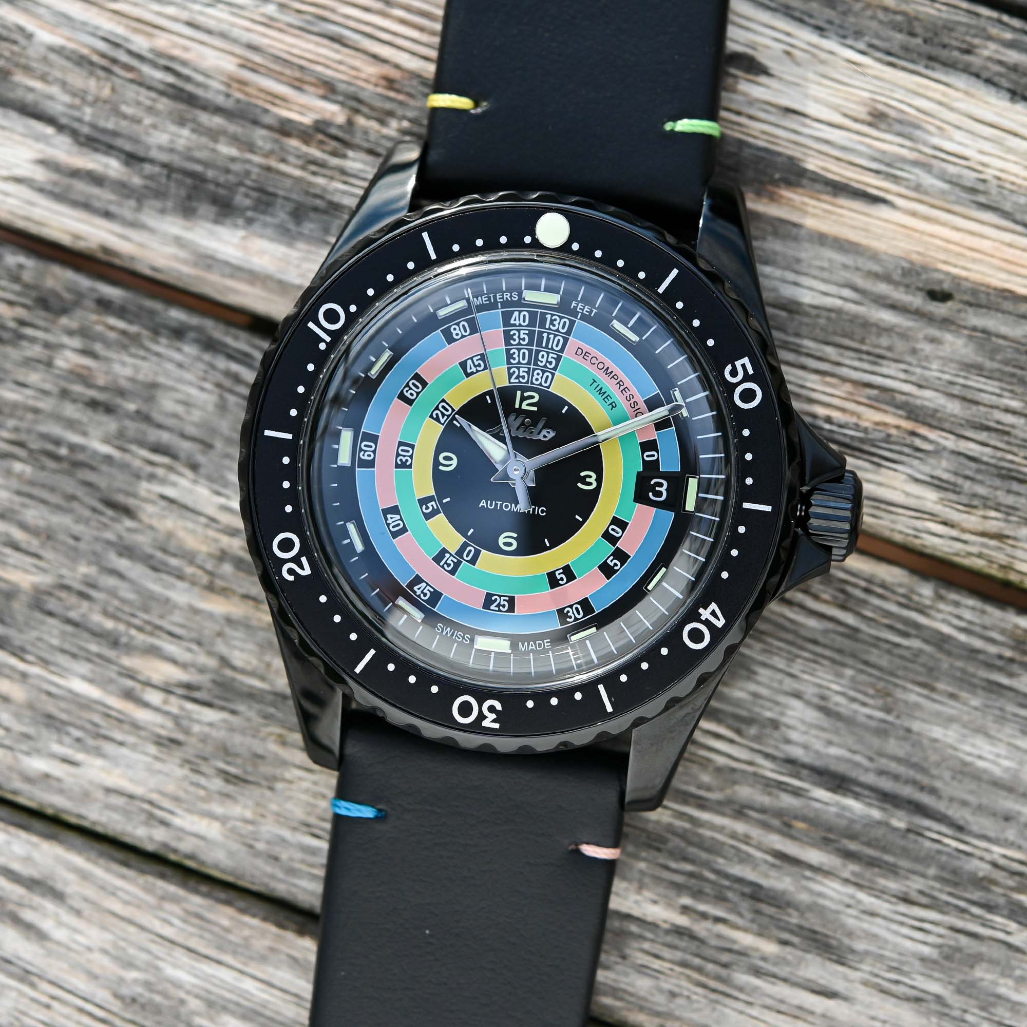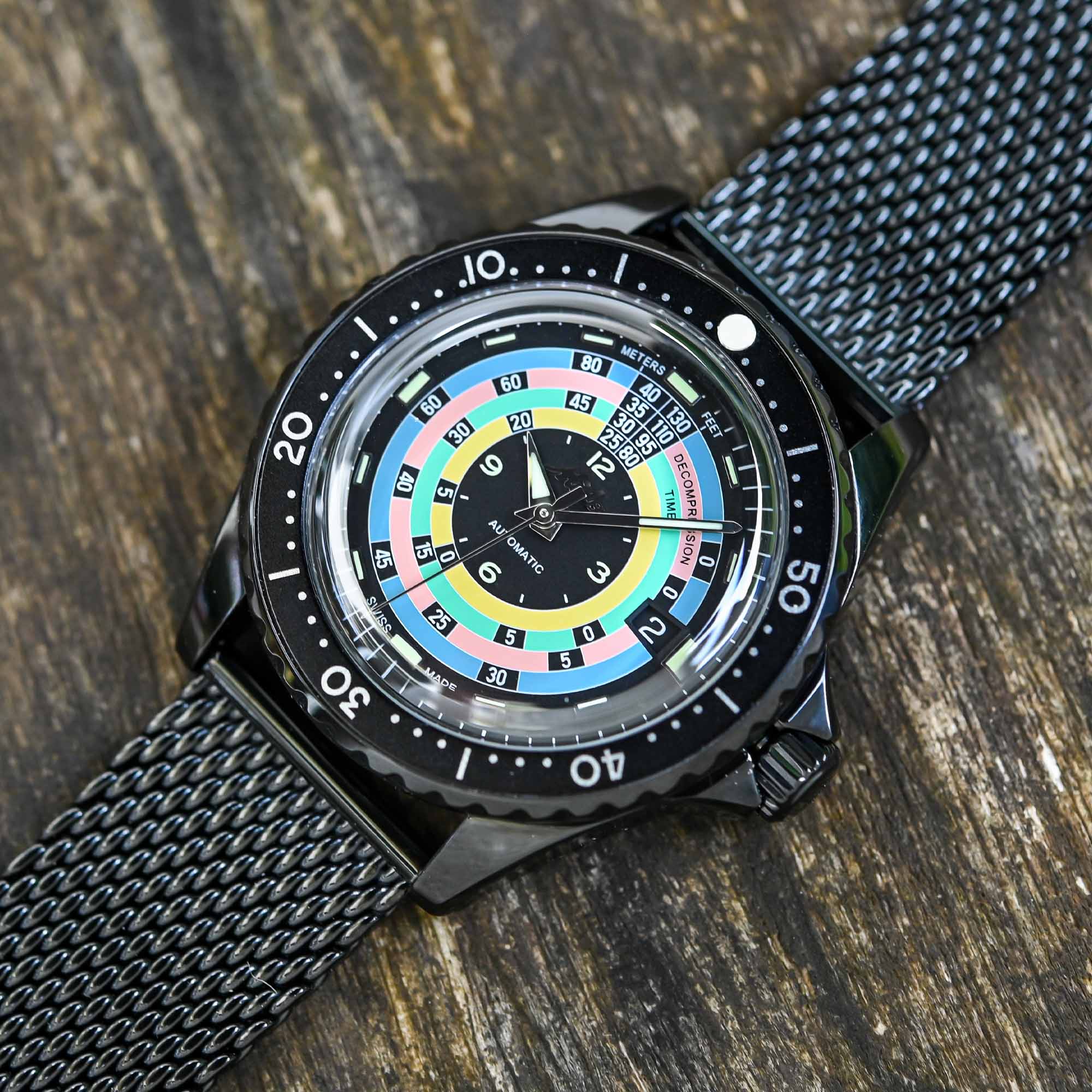 Solid vintage content, modern specs, groovy rainbow colours and a bold black PVD case give this retro diver its unique and inimitable character
