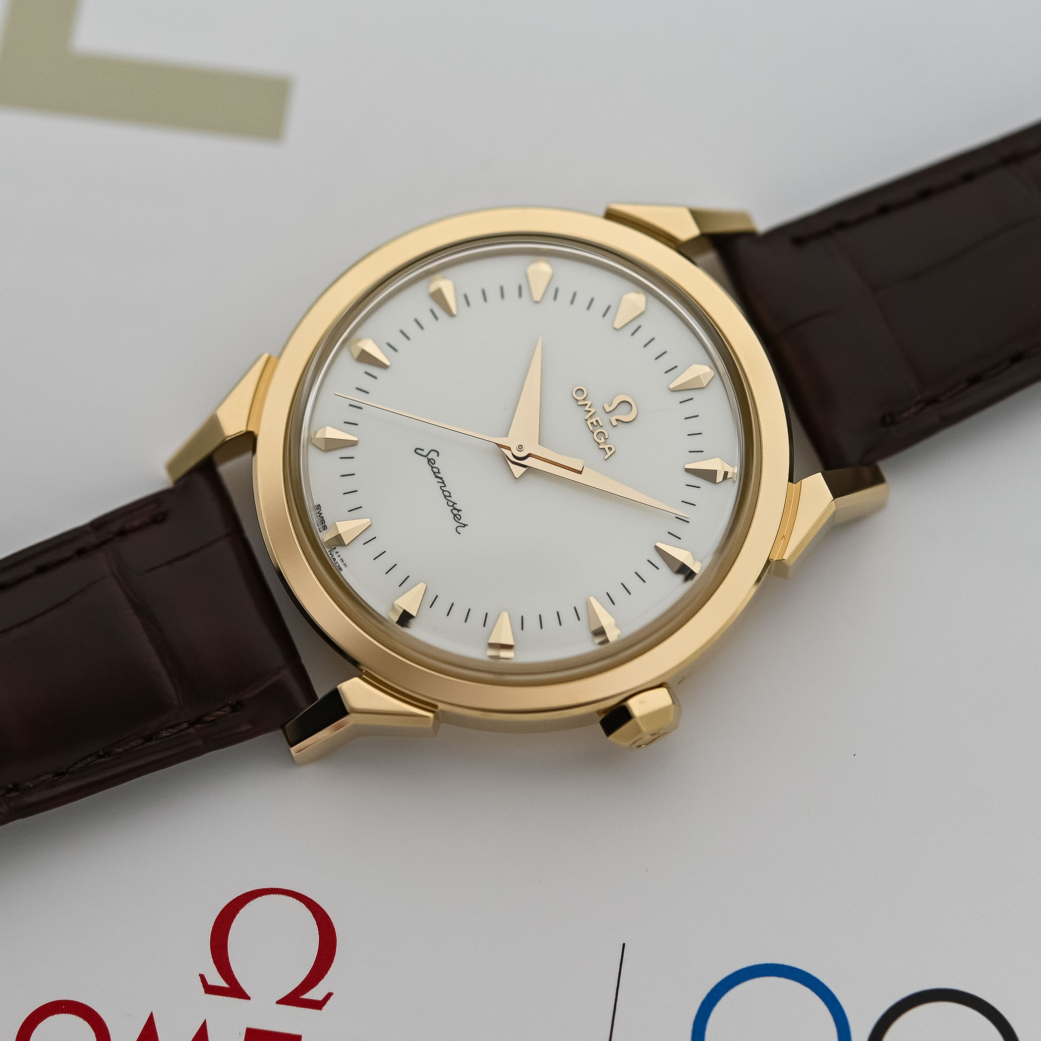 In 2008, as Omega was once again appointed official timekeeper of the Beijing Olympics, the brand released several limited edition watches, including the Seamaster XXIX Limited Edition, the direct descendant of the 1956 model seen above. Still made of yellow gold and bearing characteristic “dog leg” lugs, the case measured 37mm, now featured a sapphire crystal and was 100m water-resistant. The ivory-toned dial retained the original applied markers of the vintage version yet the logo at 6 o’clock was replaced by the adequate Roman numeral XXIX, referring to the 29th Summer Games. The Seamaster XXIX Limited Edition was equipped with the Omega 2403 calibre, an automatic chronometer movement with Co-Axial escapement. It was limited to only 88 pieces and thus remains a rare gem in Omega’s Olympics-themed watch history.