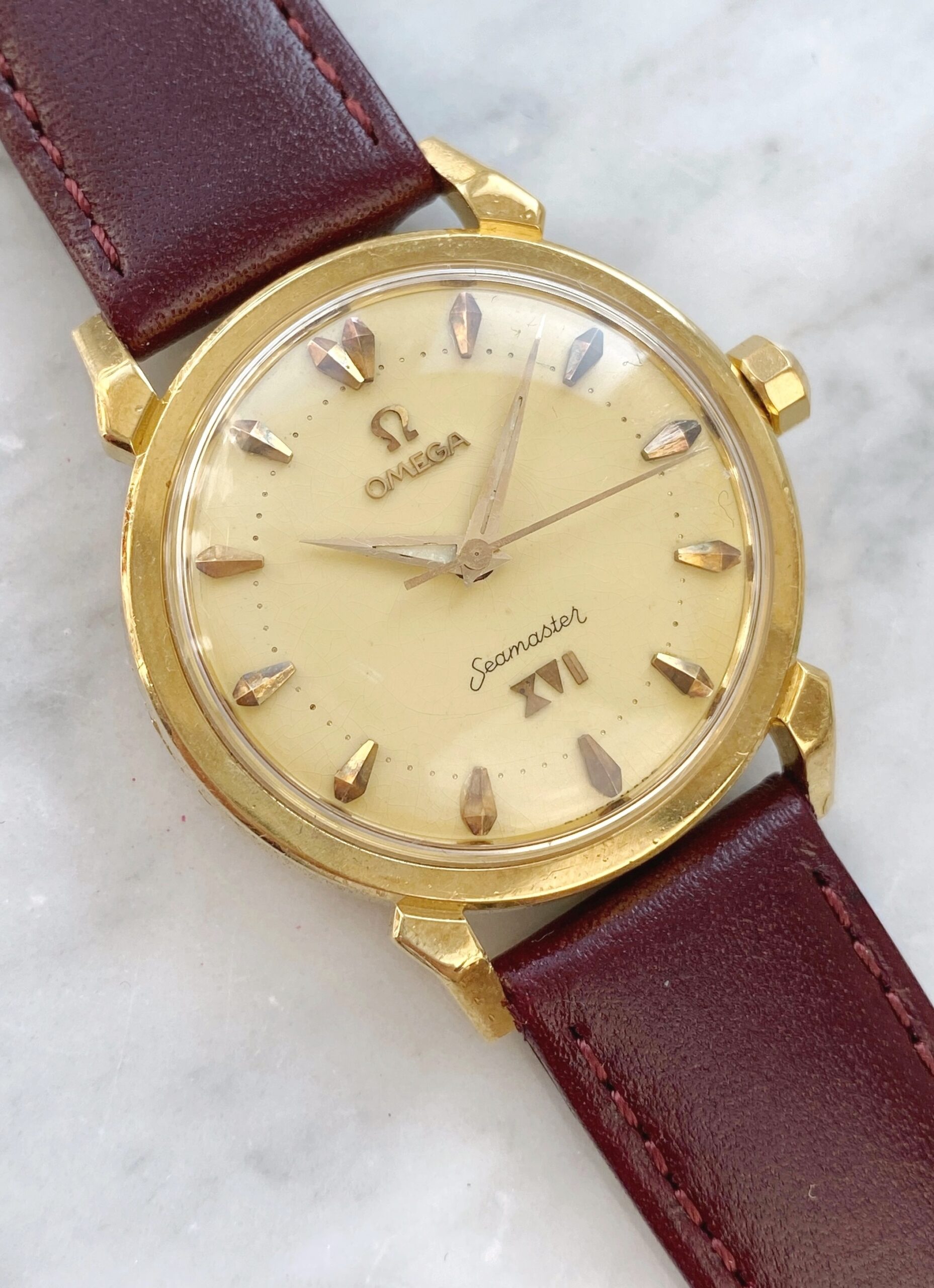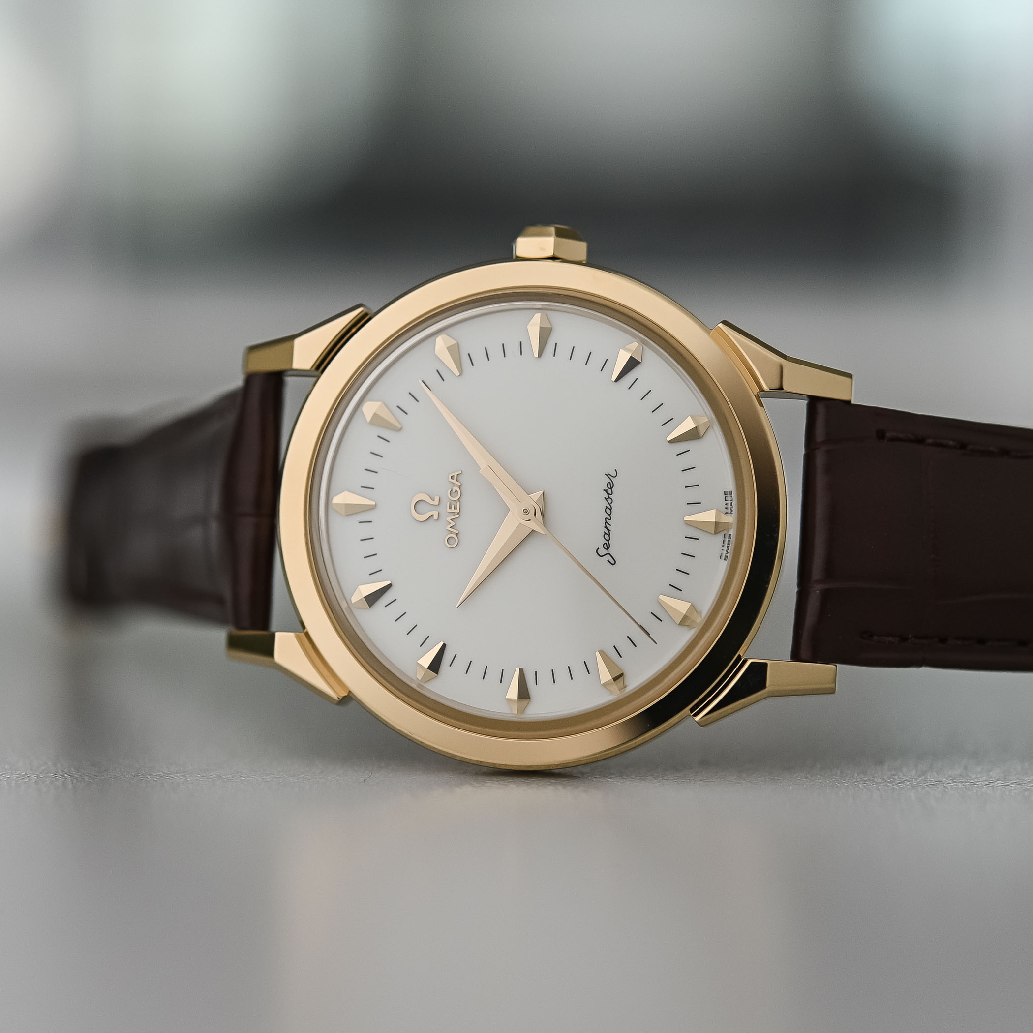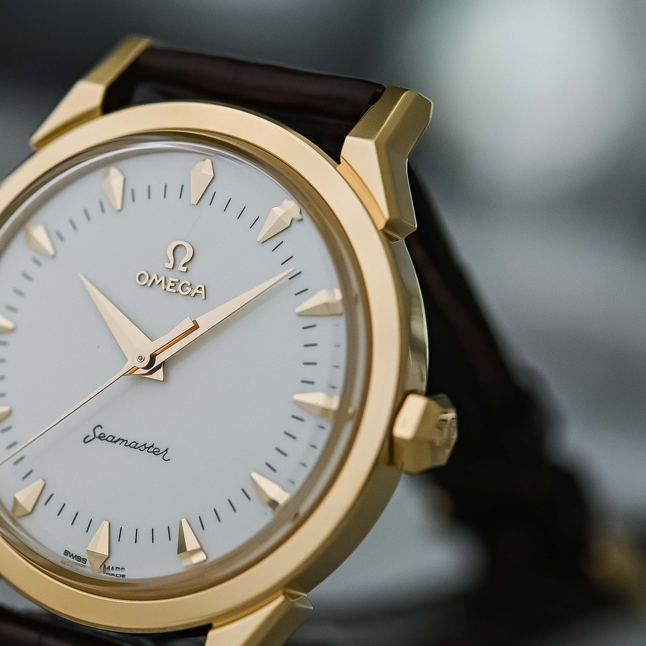 The Seamaster XVI was produced in two versions, one classic, and one with Cross of Merit dials and casebacks. In 1952, following the Olympic Games of Helsinki, Omega were presented with the Olympic Cross of Merit for their contribution to timekeeping. As a result, in 1956 to celebrate the Melbourne Olympics (the 16th Olympiad), Omega introduced this reference 2850 with its highly distinctive lugs, a 34mm gold case, a flat coin-edge bezel, a Calibre 471 automatic movement inside and a dial decorated with faceted triangular markers and an applied XVI logo at 6 o’clock.