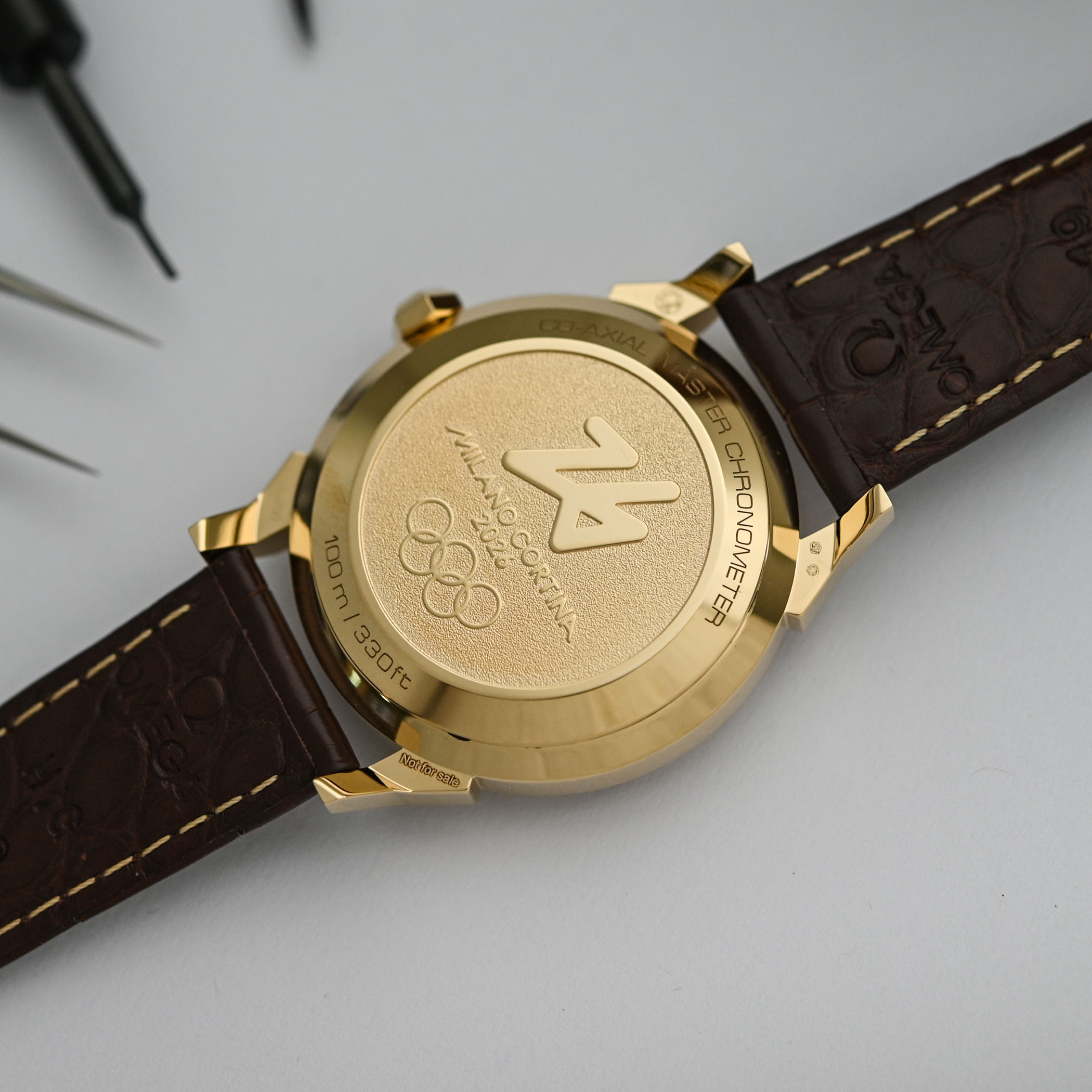 Turning the watch over reveals a solid caseback emblazoned with the Milano Cortina 2026 logo for next year’s Winter Olympics. Although it would be lovely to see the movement underneath, I do feel a closed back is the way to go as it’s in keeping with the style of the original. Also, it ties in neatly with last year’s Omega Paris 2024 Bronze Gold Edition. On the back, you also get the hallmarks of the material stamped into the back of the lugs, the movement’s co-axial construction and Master Chronometer certification, and the watch’s water resistance of 100m.