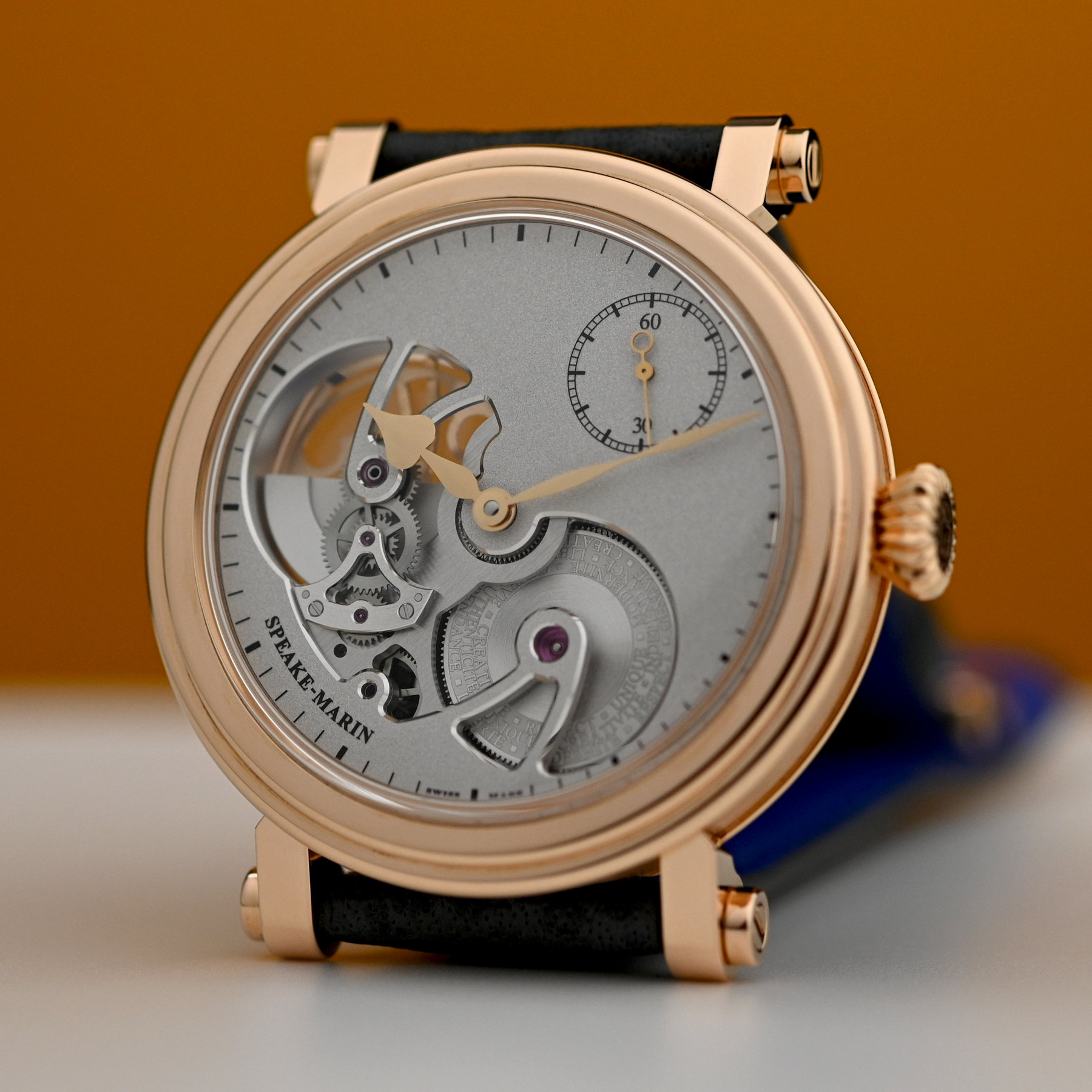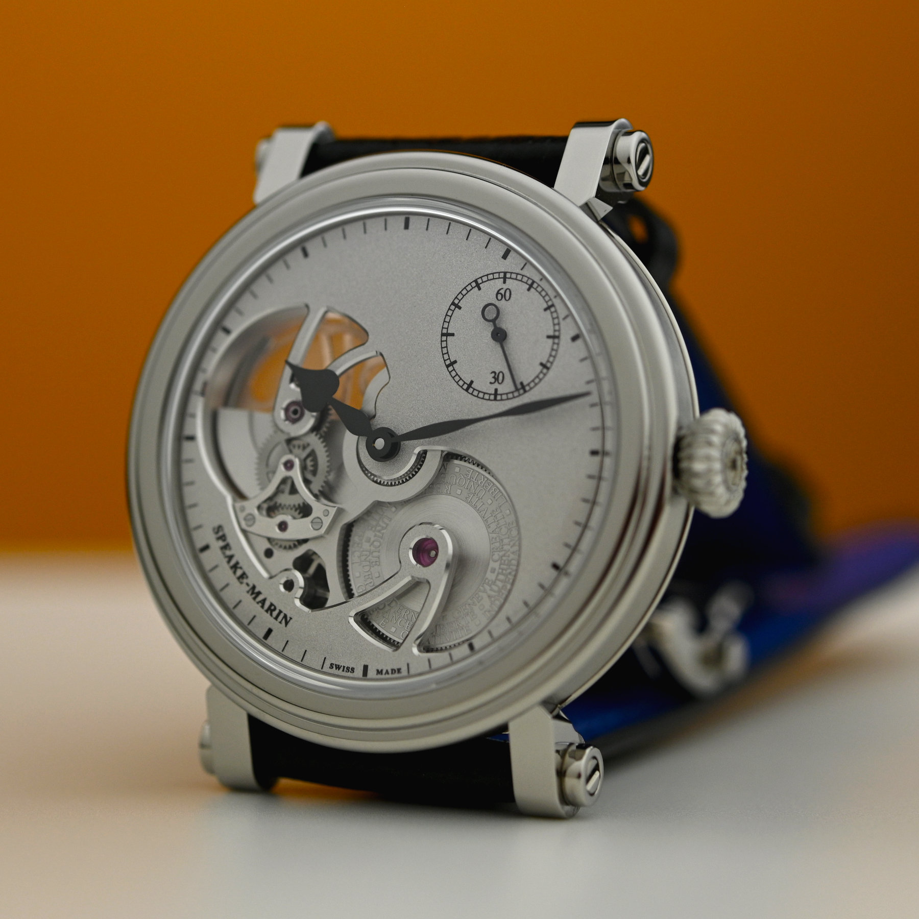 As their name suggests, the latest iterations of the model feature a sandblasted version of this movement. The rough yet elegant silver-coloured grained surface of the main plate and bridges contrasts with their polished chamfers and jewel sinks resulting in a captivating play of lights. The main plate features an 8-shaped opening revealing the micro-rotor and the barrel engraved with the brand’s values: RESPECT, INDEPENDENCE, LIBERTE, UNIQUE, AUTHENTICITE, GENEVE, CREATIVITE, MODERNITE. The matte black minute indications and the small seconds counter are applied in 3D. In characteristic Speake Marin style, the hours and minutes are indicated by spade & whip hands. These are polished and coated in black or gold to provide a pleasing contrast with the blasted surface of the movement.