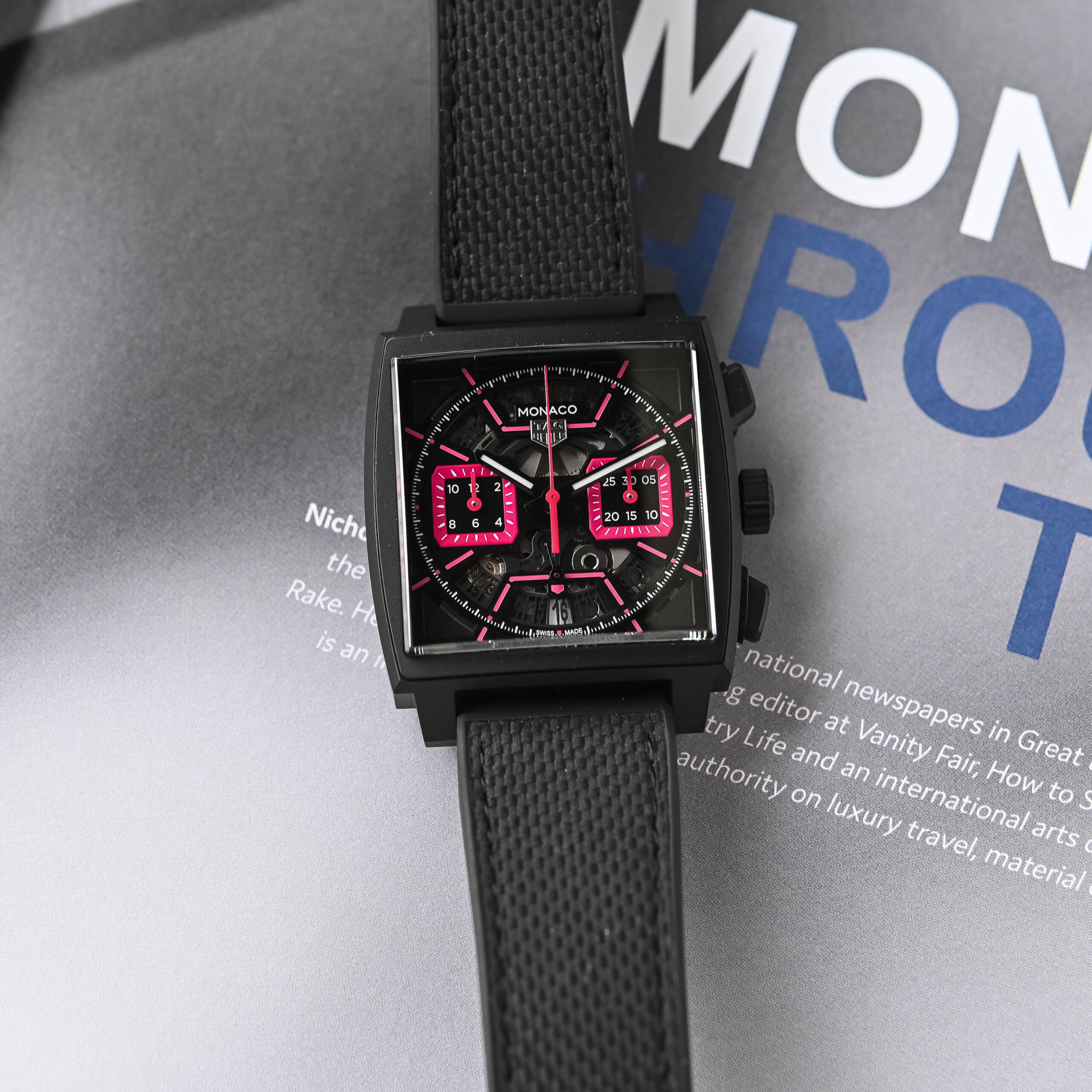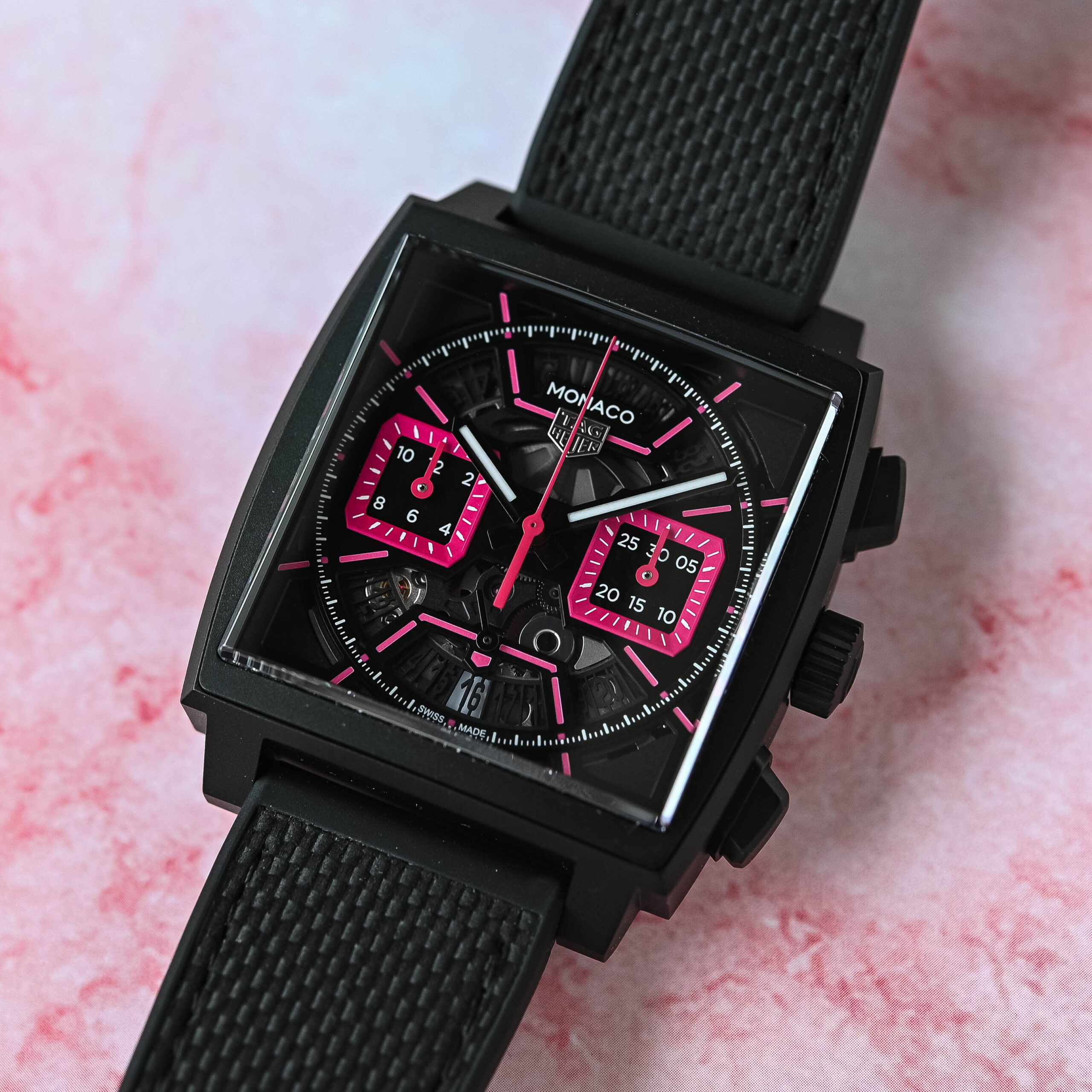 TAG Heuer is synonymous with the racetrack, and Jack Heuer’s legendary motorsport-inspired chronographs have not lost an iota of popularity. Following fast on the heels of the 1963 Carrera chronograph, in 1969, Heuer produced a bold, square chronograph with a blue dial and a crown on the left side and named it after the Monaco Grand Prix. Immortalised on Steve McQueen’s wrist in the cult 1971 film Le Mans, the Monaco has adapted to the new materials and technologies of the watch panorama over the past fifty-five years. The latest Monaco has enjoyed a pit stop in Las Vegas as it reveals its engine with a skeletonised dial and bright pink accents inspired by the neon lights of the Strip.