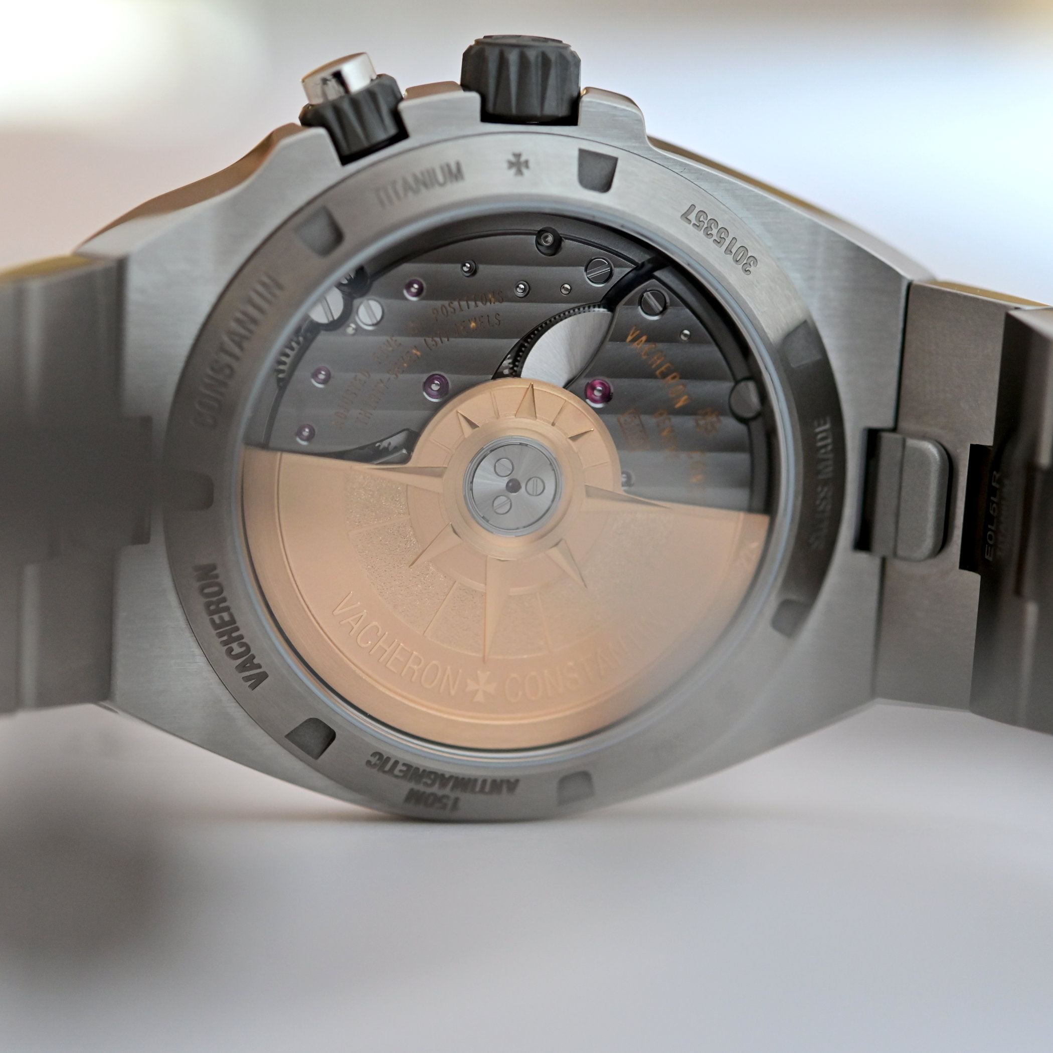 Turning the watch over reveals the automatic Calibre 5110 DT/3, which is the latest version of the 5110 DT, introduced with the Overseas Dual Time Ref. 7900V in 2018, developed and manufactured in-house by Vacheron Constantin. The movement operates at 28,800 vibrations/hour and delivers a power reserve of approximately 60 hours. Comprising 234 components, it is finished to the standards required by the Geneva Seal, guaranteeing both performance and high levels of decorative finishing. Through the caseback, the bridges display Geneva stripes and polished bevels, and the 22k gold oscillating weight features a wind-rose engraving.