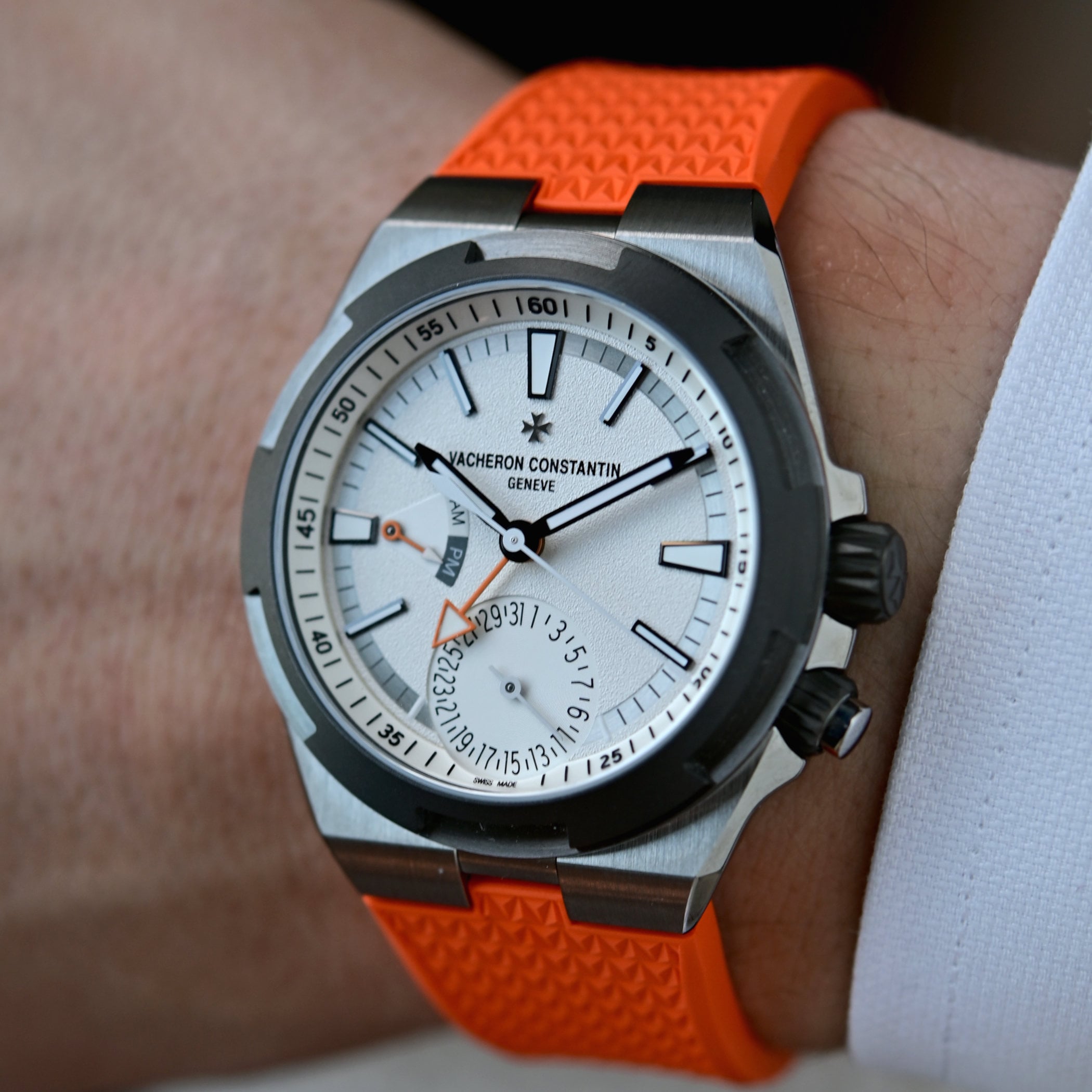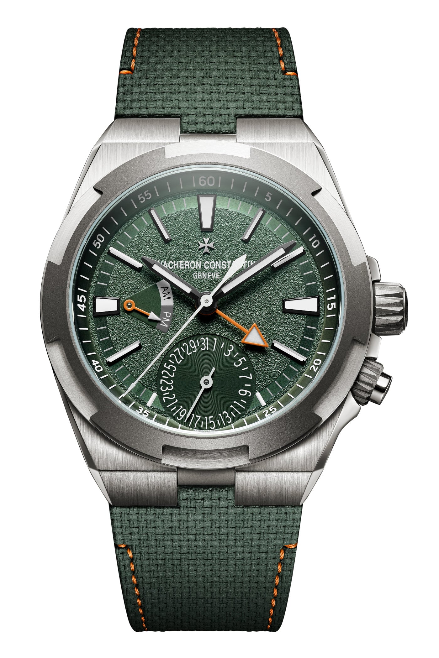 The watch is delivered on an integrated titanium bracelet with a triple-blade folding clasp and the “Easy-fit” micro-adjustment system. Two additional rubber straps are also included: one in bright orange with a Maltese-cross-inspired texture, and another in the dial colour with a woven-style finish and orange stitching. The straps use interchangeable titanium folding clasps, and the price is CHF 33,700. More information at Vacheron-Constantin.com.