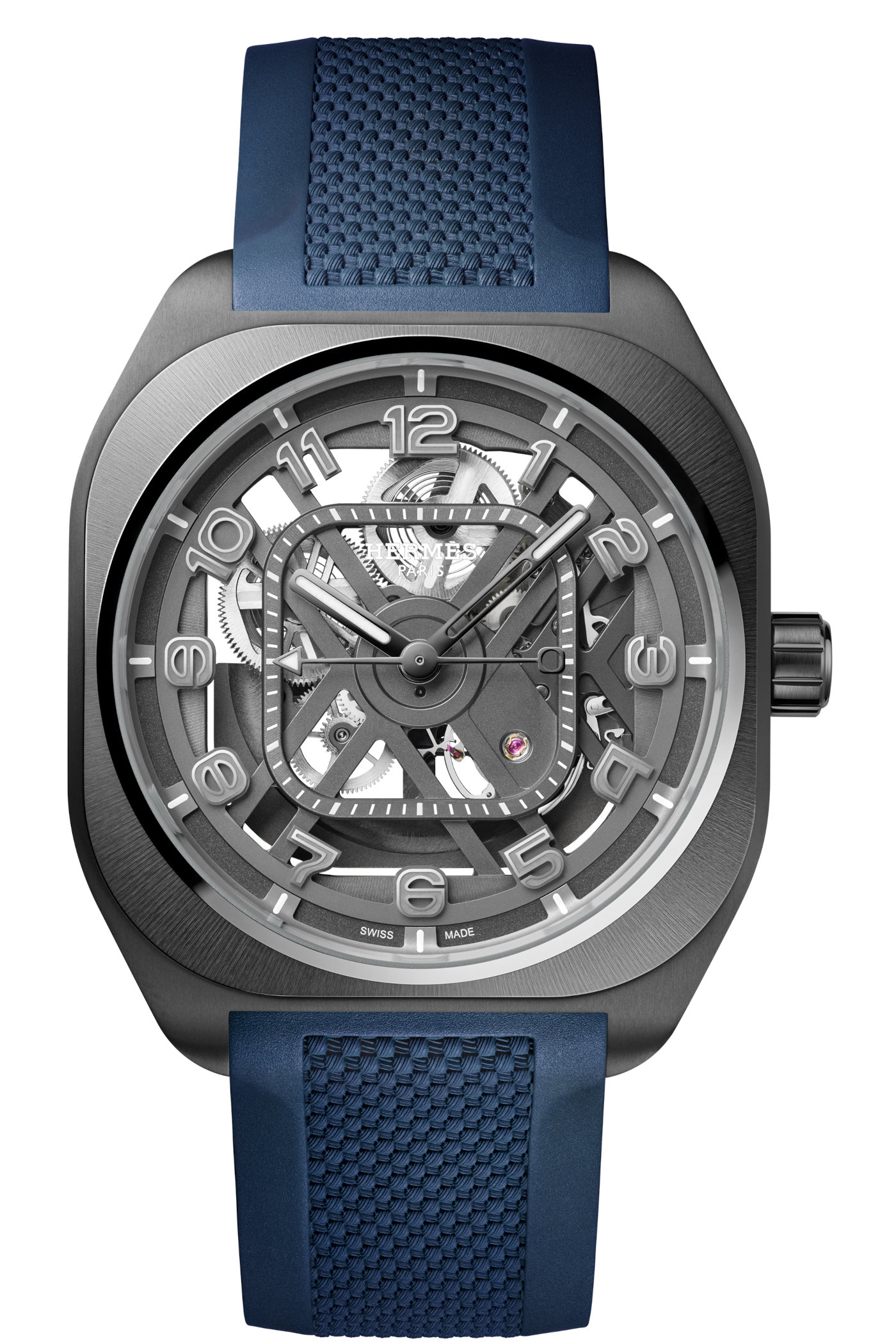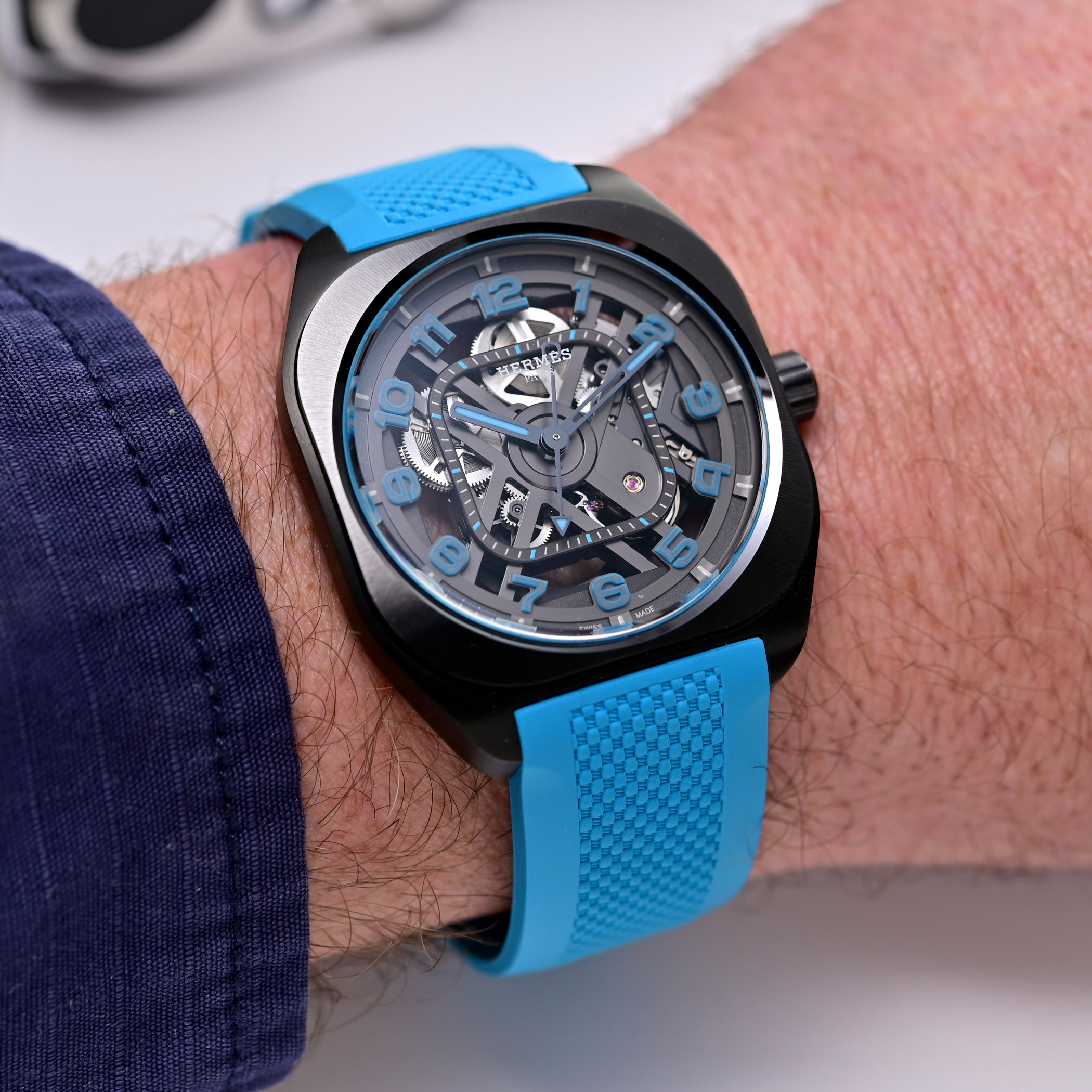 The Hermès H08 Skeleton comes on a textured rubber strap in a range of colours. The bright blue version comes on a Zanzibar or black rubber strap, while the grey one comes on a Dune, Vert Moyen or Blue Abysse coloured strap. All are fitted with a black DLC-coated titanium folding clasp. It’s added to the permanent collection and retails for EUR 20,000 incl. VAT. The H08 Skeleton continues the refreshing style set in motion by the original H08, yet offers a deeper vision of mechanical watchmaking, with that same unmistakable Hermès touch.