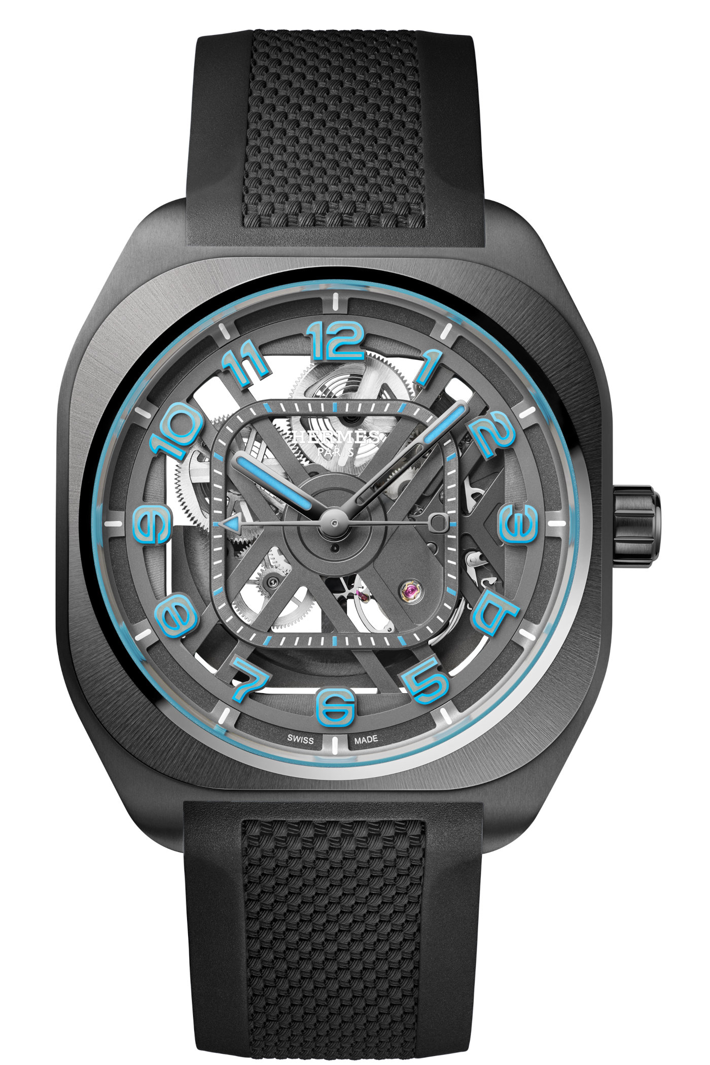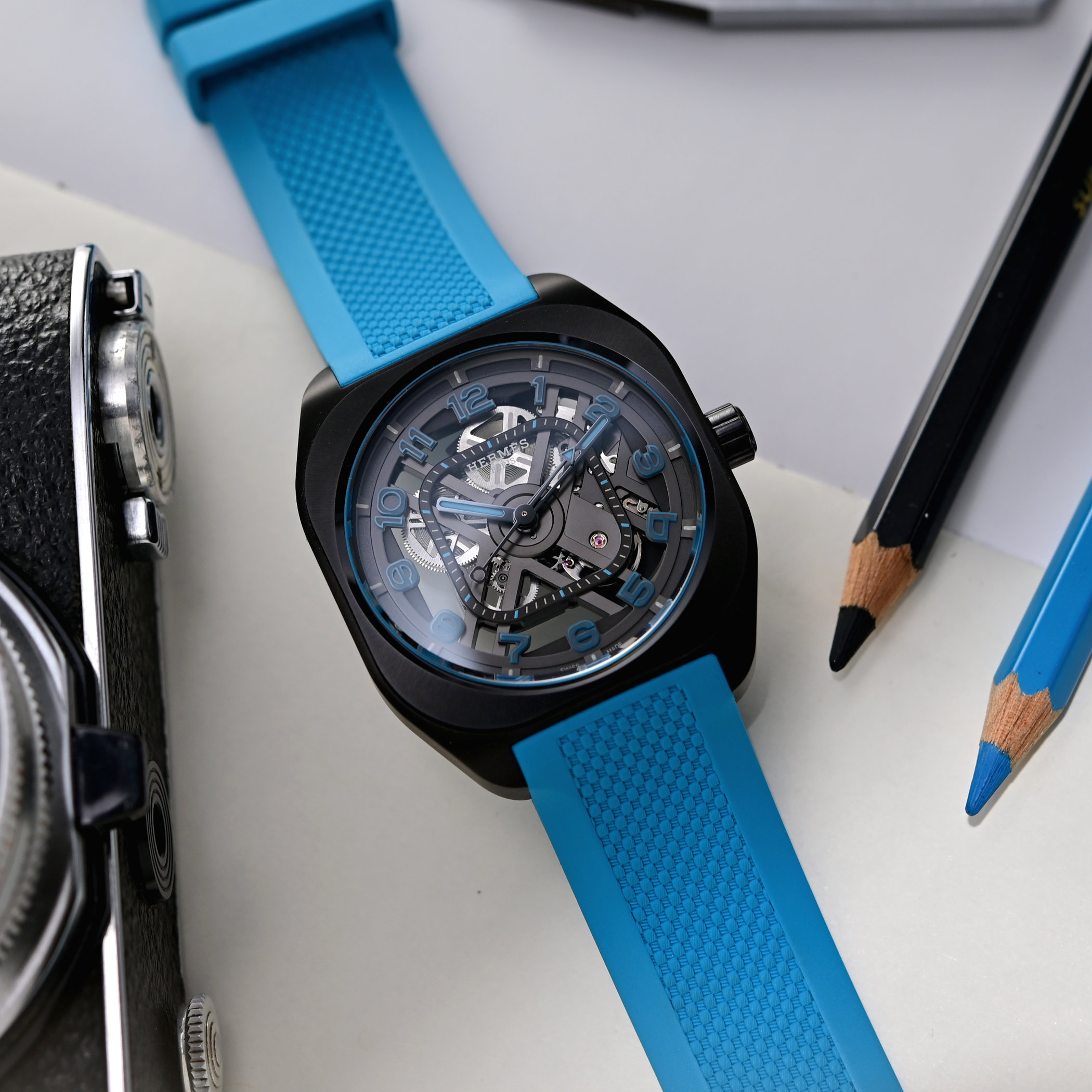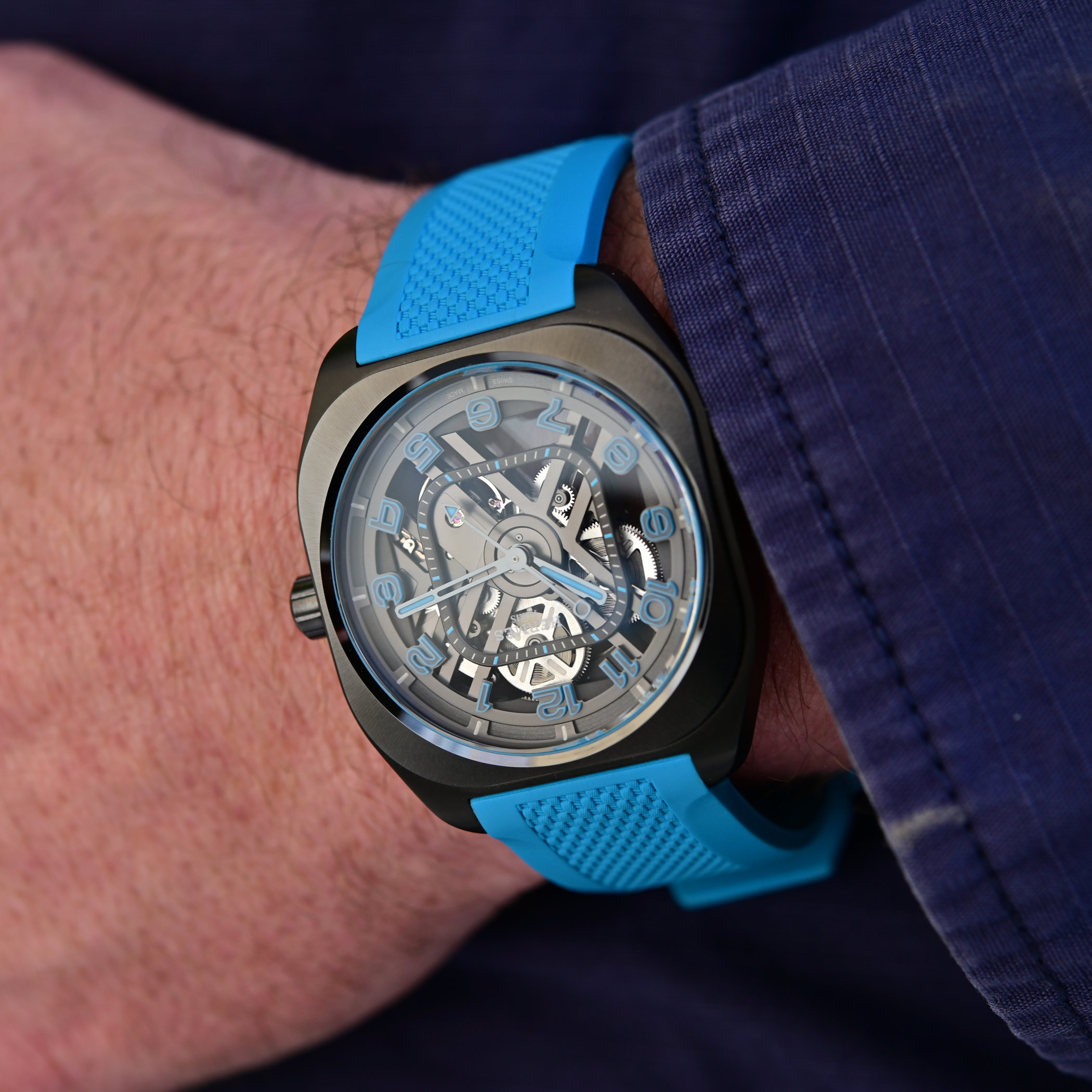 Inside, the hour markers are semi-suspended in free air and made of solid, luminous blocks in blue or grey, retaining the original H08’s distinct font. One step in, there’s a rounded square minutes track with grey transfers. The blacked-out, semi-openworked hands have a luminous insert that matches the numerals. A neat little touch is the seconds hand, which has a triangular top on one end and an outline of the case shape as a counterweight on the other end. It’s elements like these that make the H08 Skeleton such a great watch, much in line with the original.